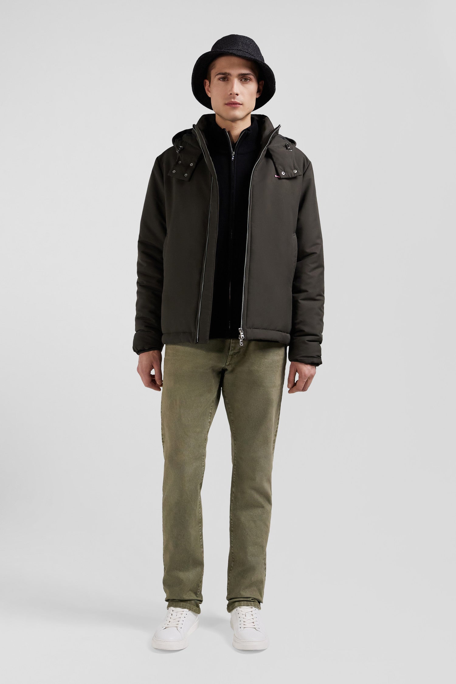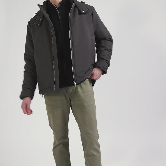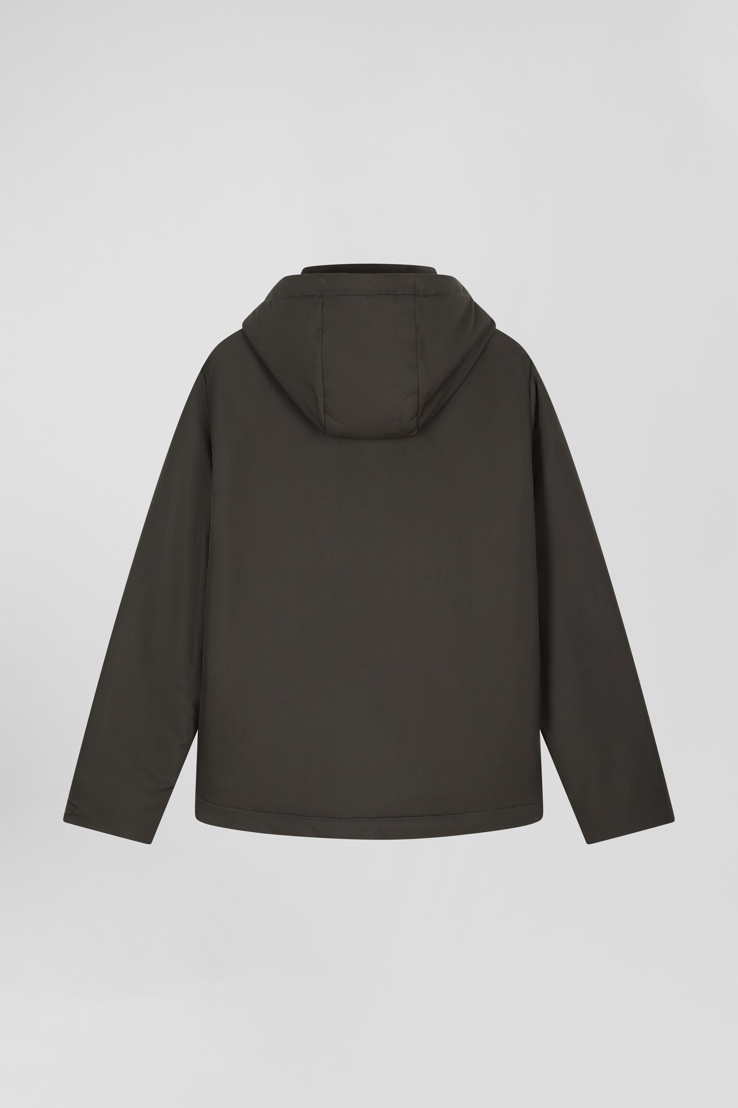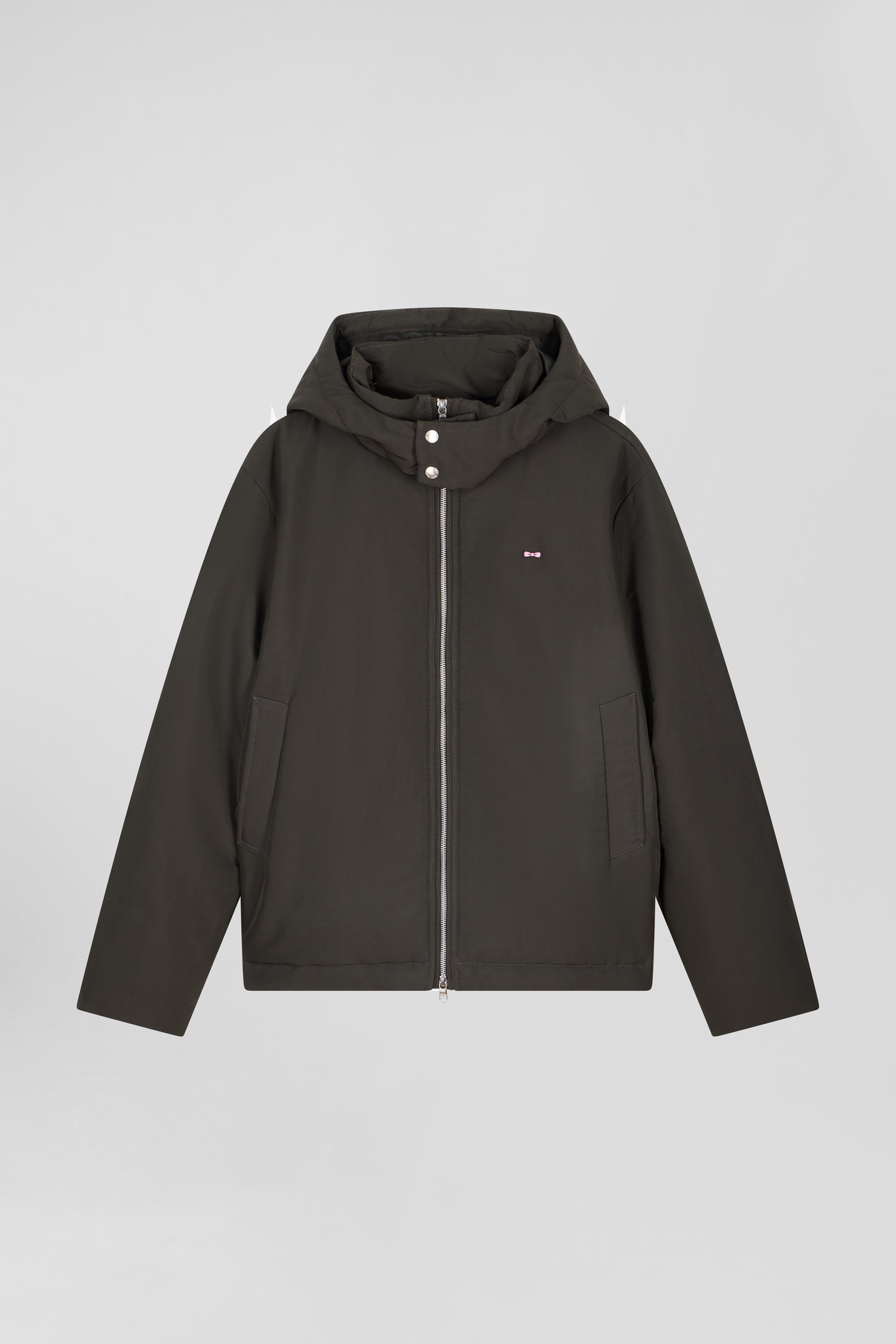 Discover the perfect blend of functionality and style with this peach-skin-feel nylon jacket. Complete with a fixed snap-fastening hood and plain nylon lining, this men's jacket offers comfort and protection. Its signature two-way zip and piped pockets combine with two zipped inside pockets for maximum practicality. The sleeves are trimmed with knitted ribbing.