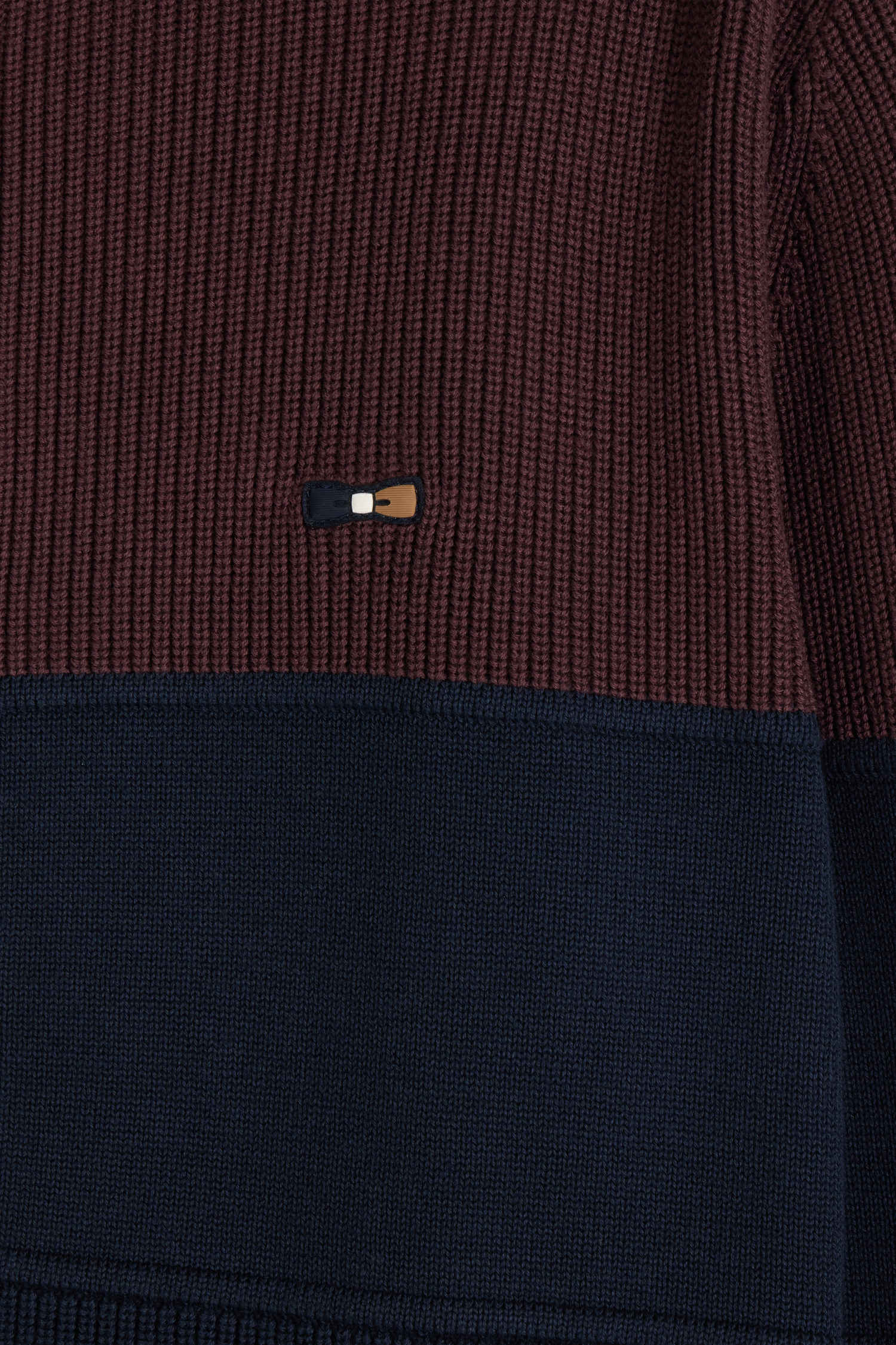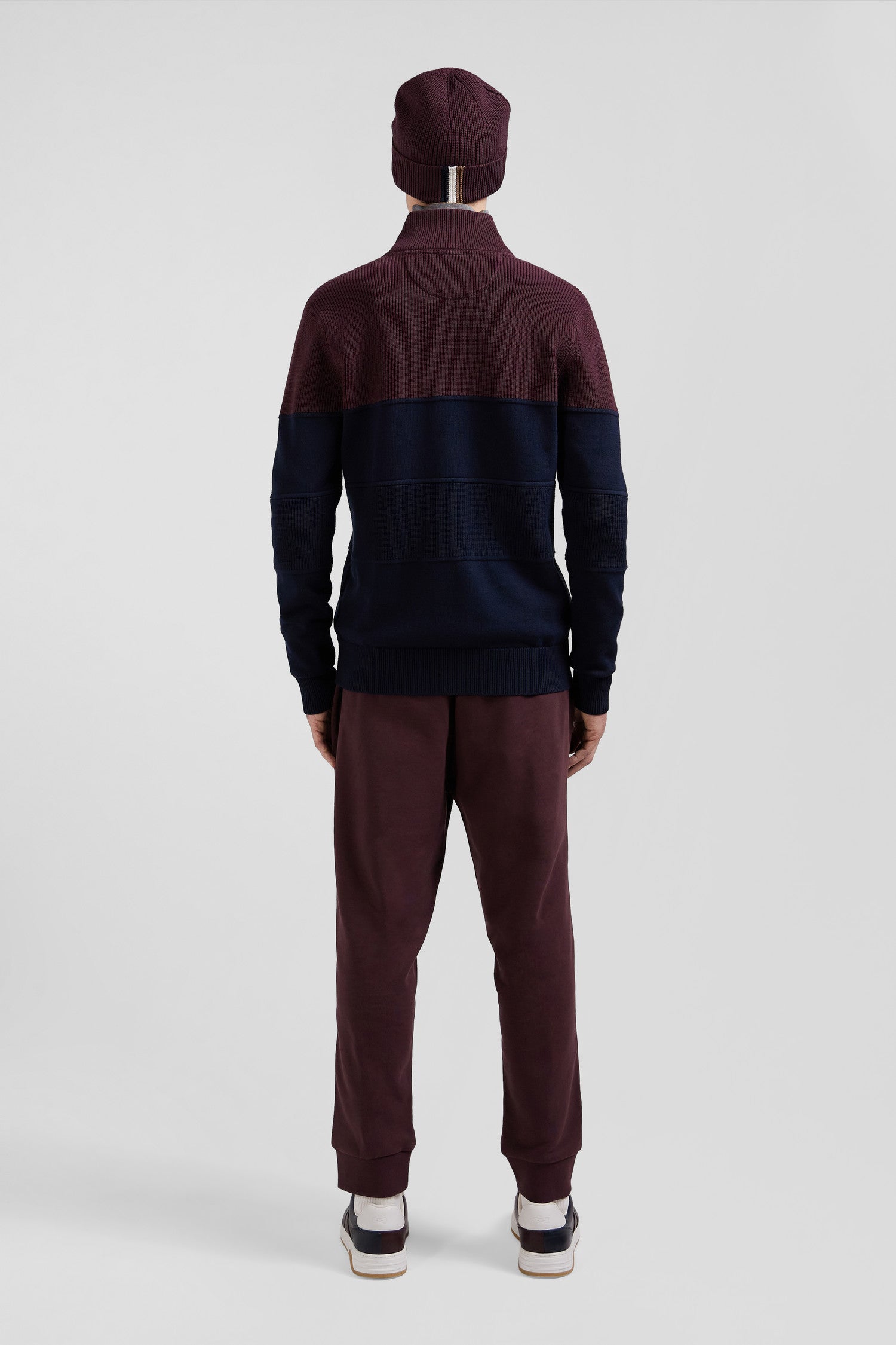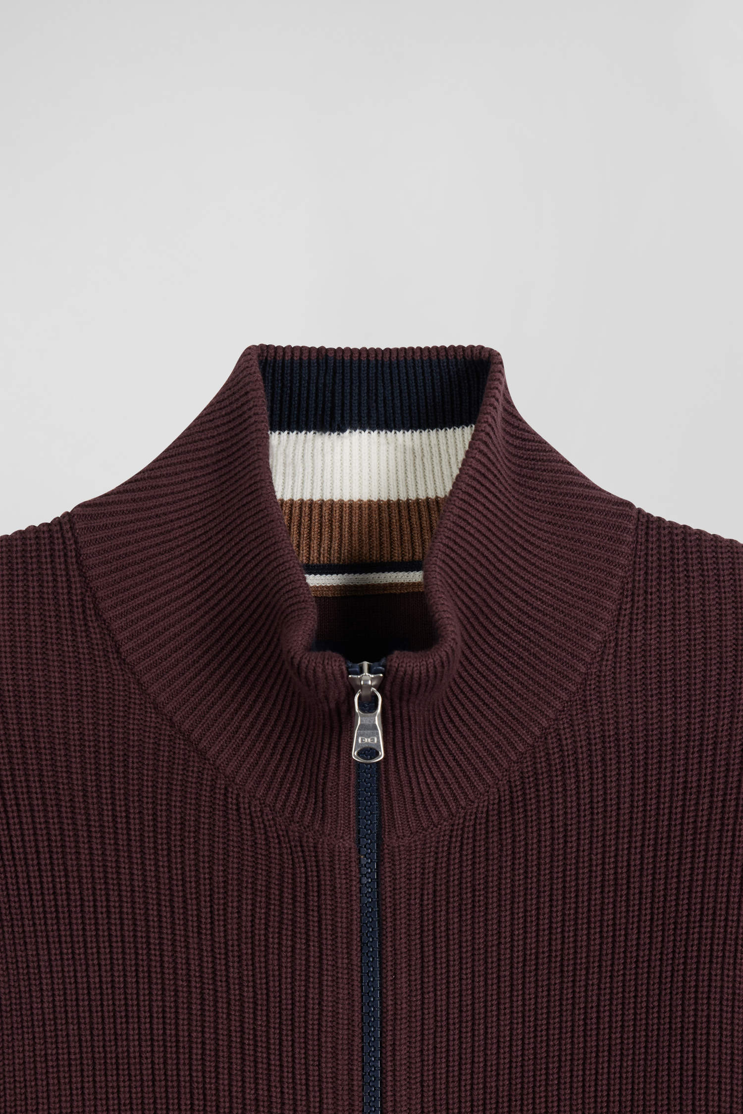 Regular navy blue and burgundy cotton high collar zipped cardigan