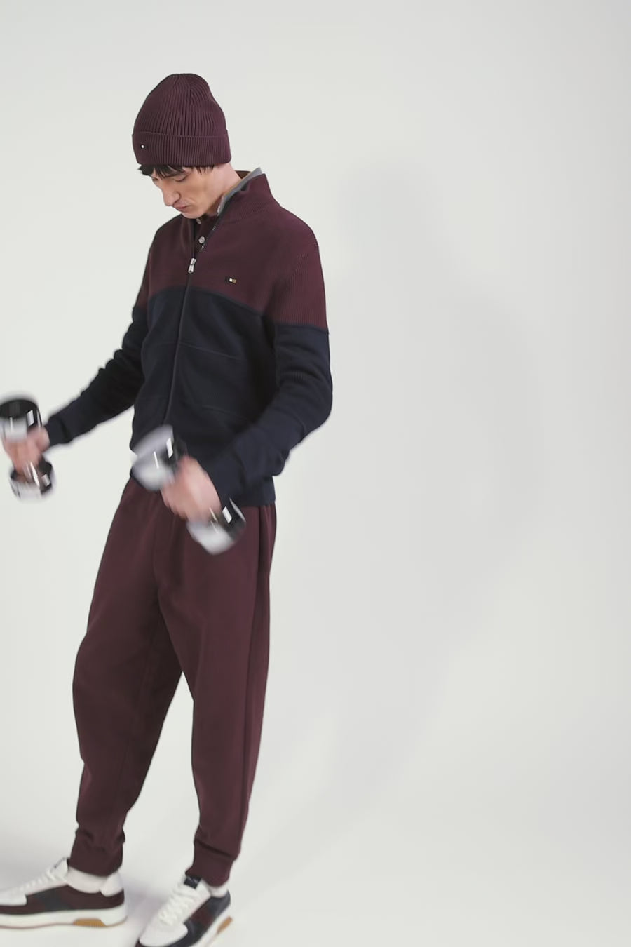 Burgundy knitted cotton beanie with tricolour details