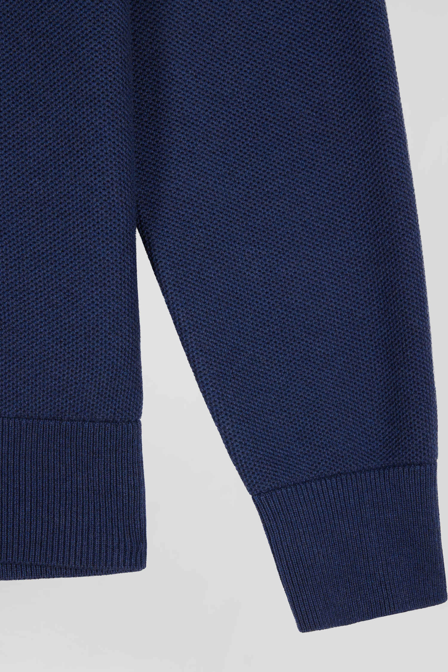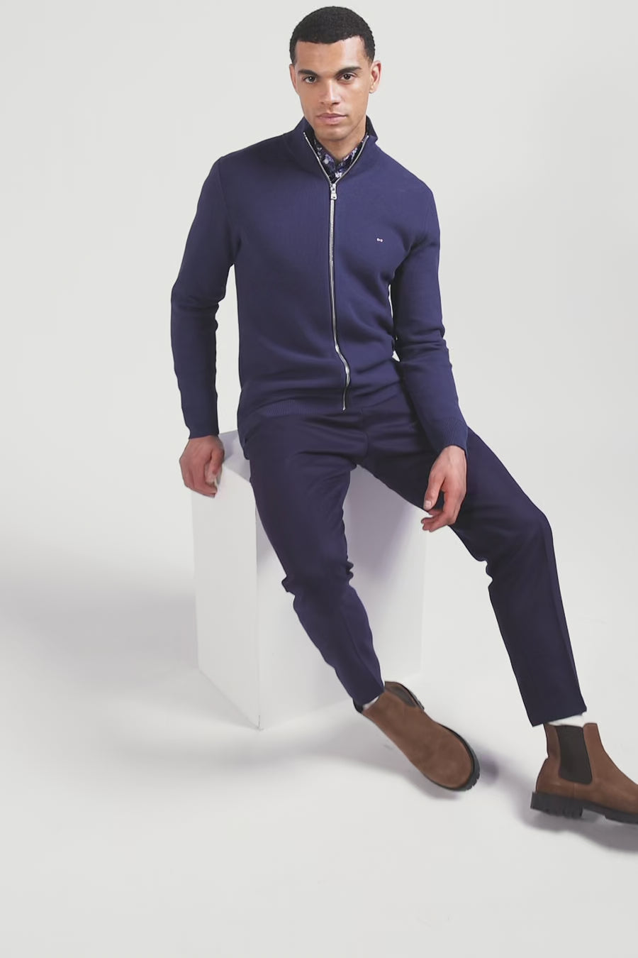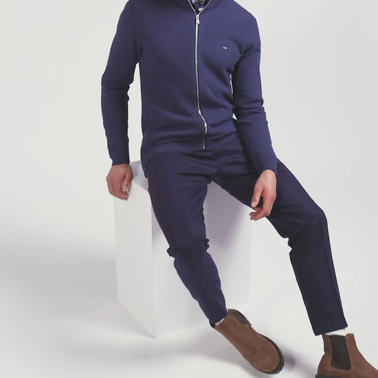 Regular plain navy blue cotton high collar zipped cardigan