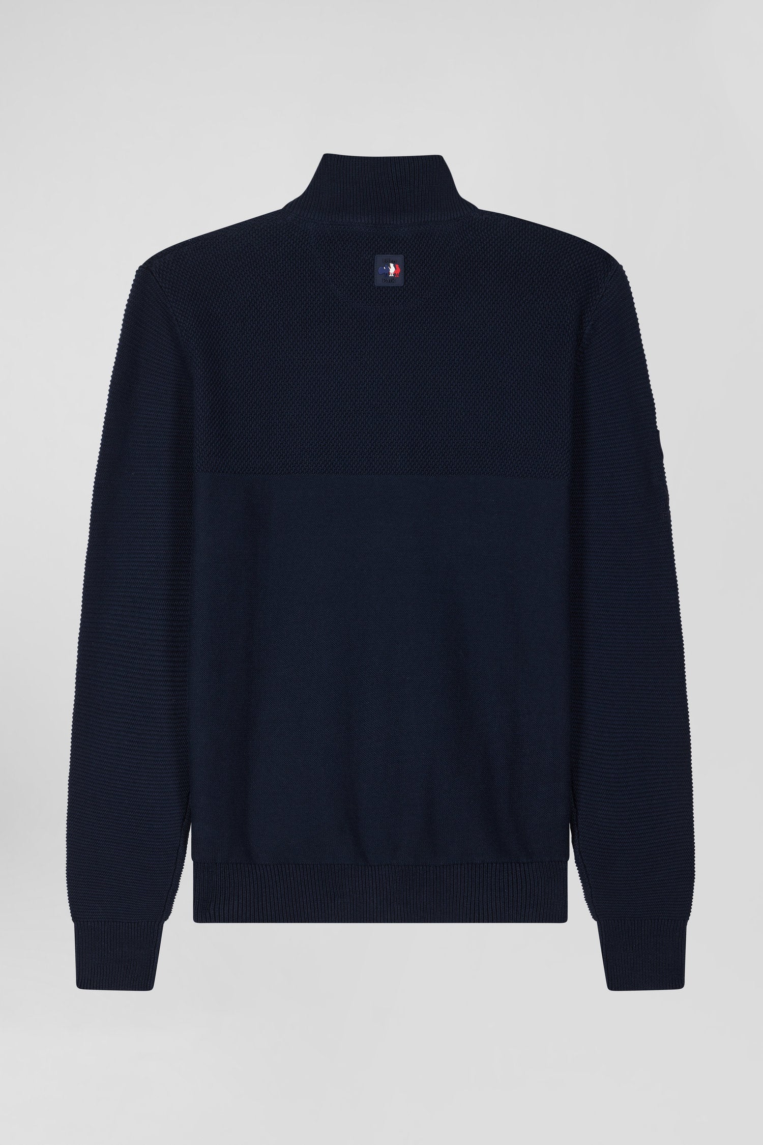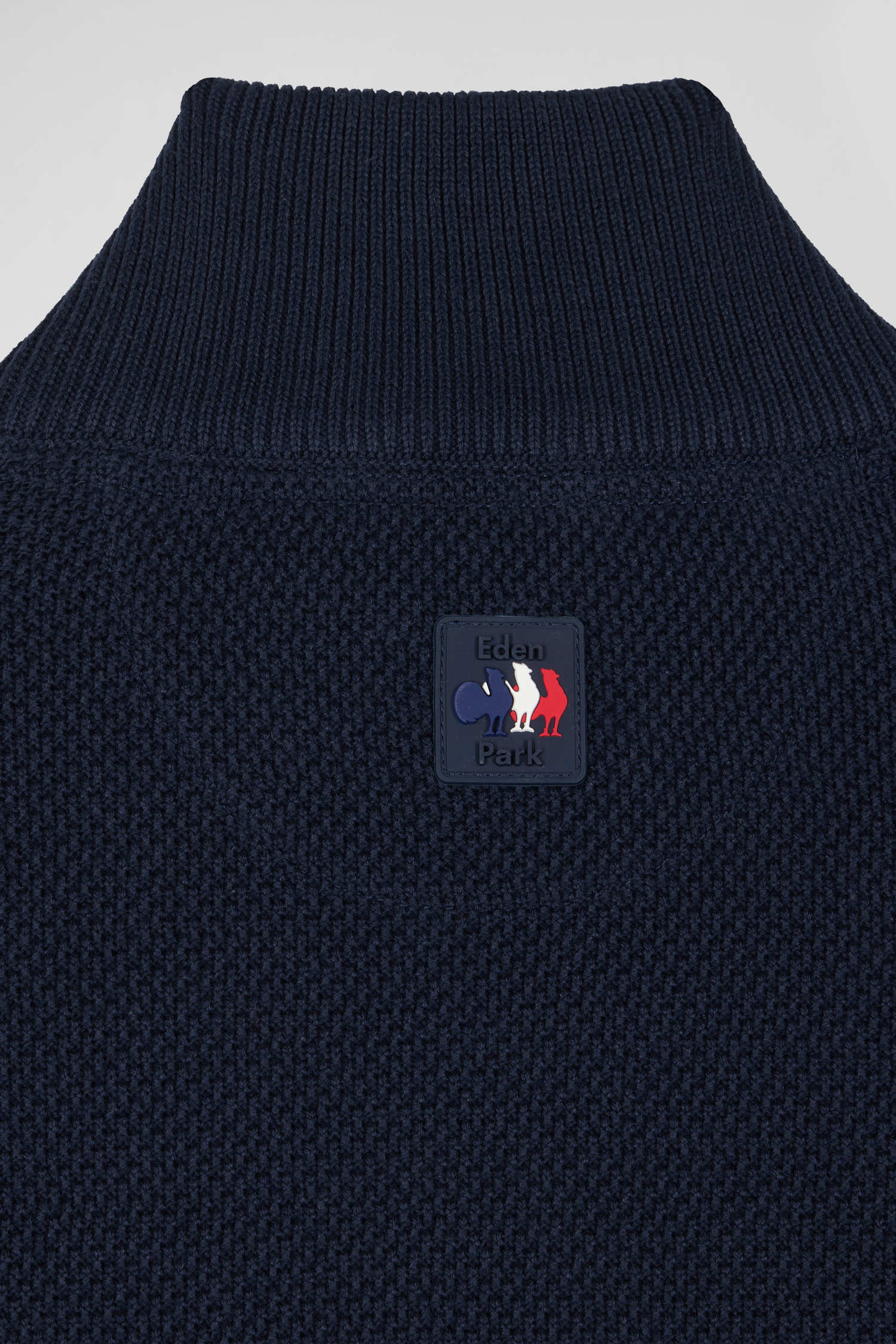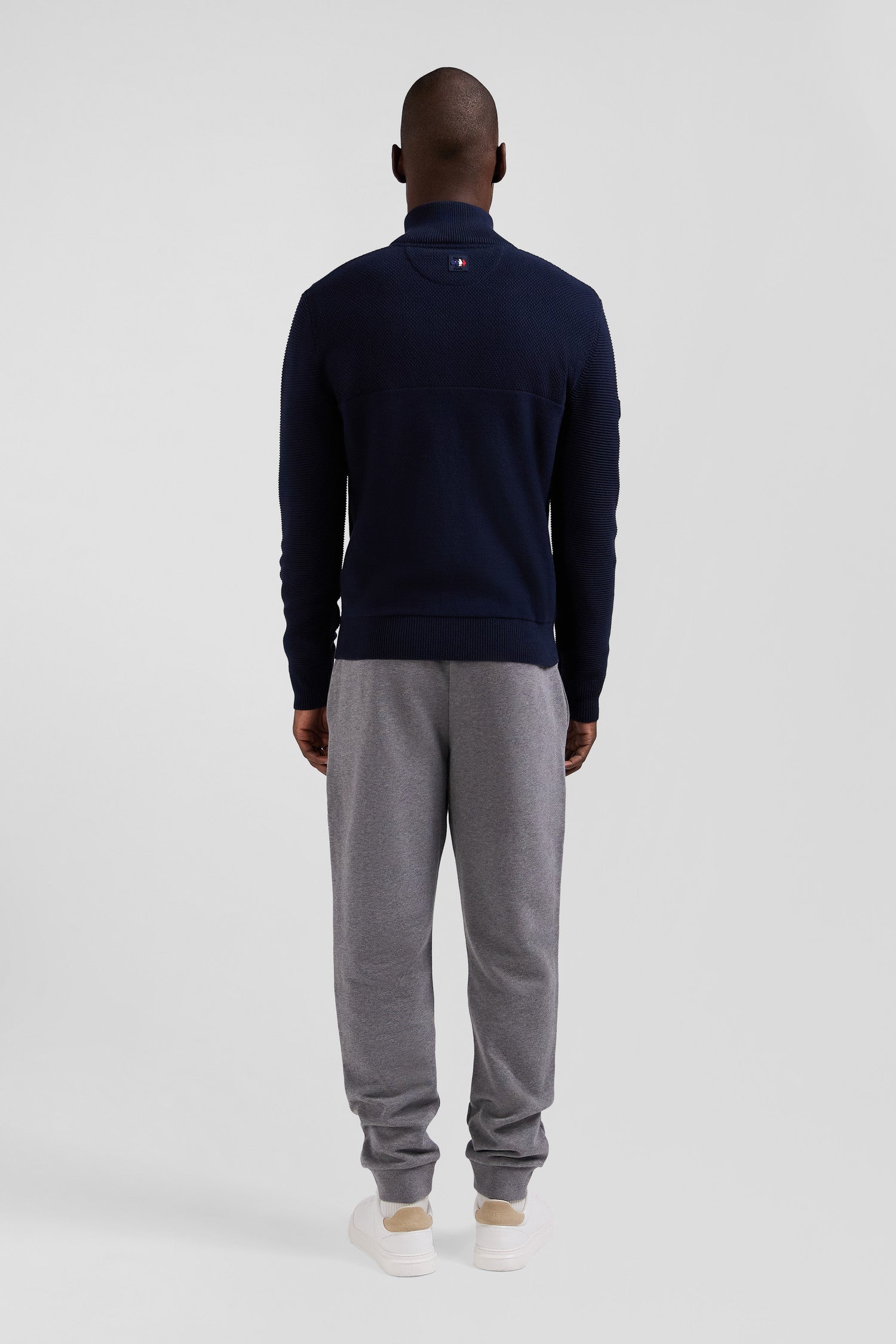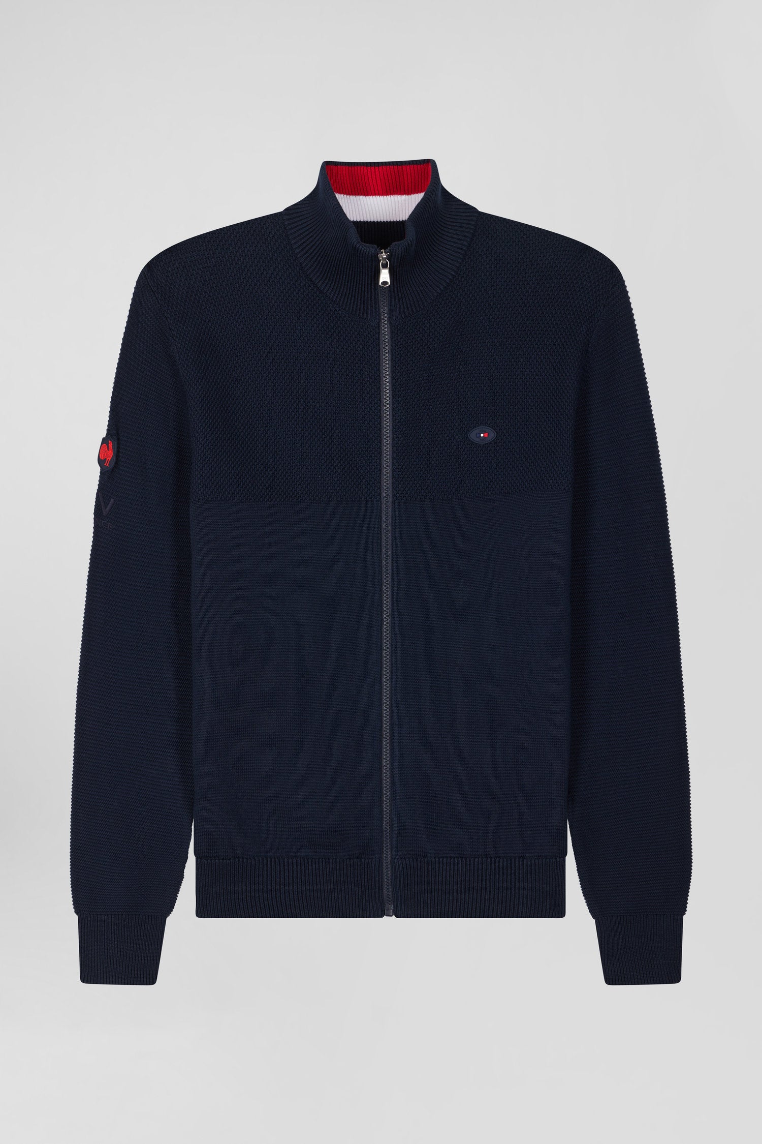 Celebrate the spirit of the XV de France with our zippered cardigan, proudly adorned with crests and embroidery that pay homage to this legendary team. The tricolor collar adds a graphic touch, reflecting the colors of France with elegance. Designed for passionate fans as well as men looking for a trendy piece with athletic influences, this cardigan combines style and comfort. Wear it with jeans for sporty-chic everyday wear.