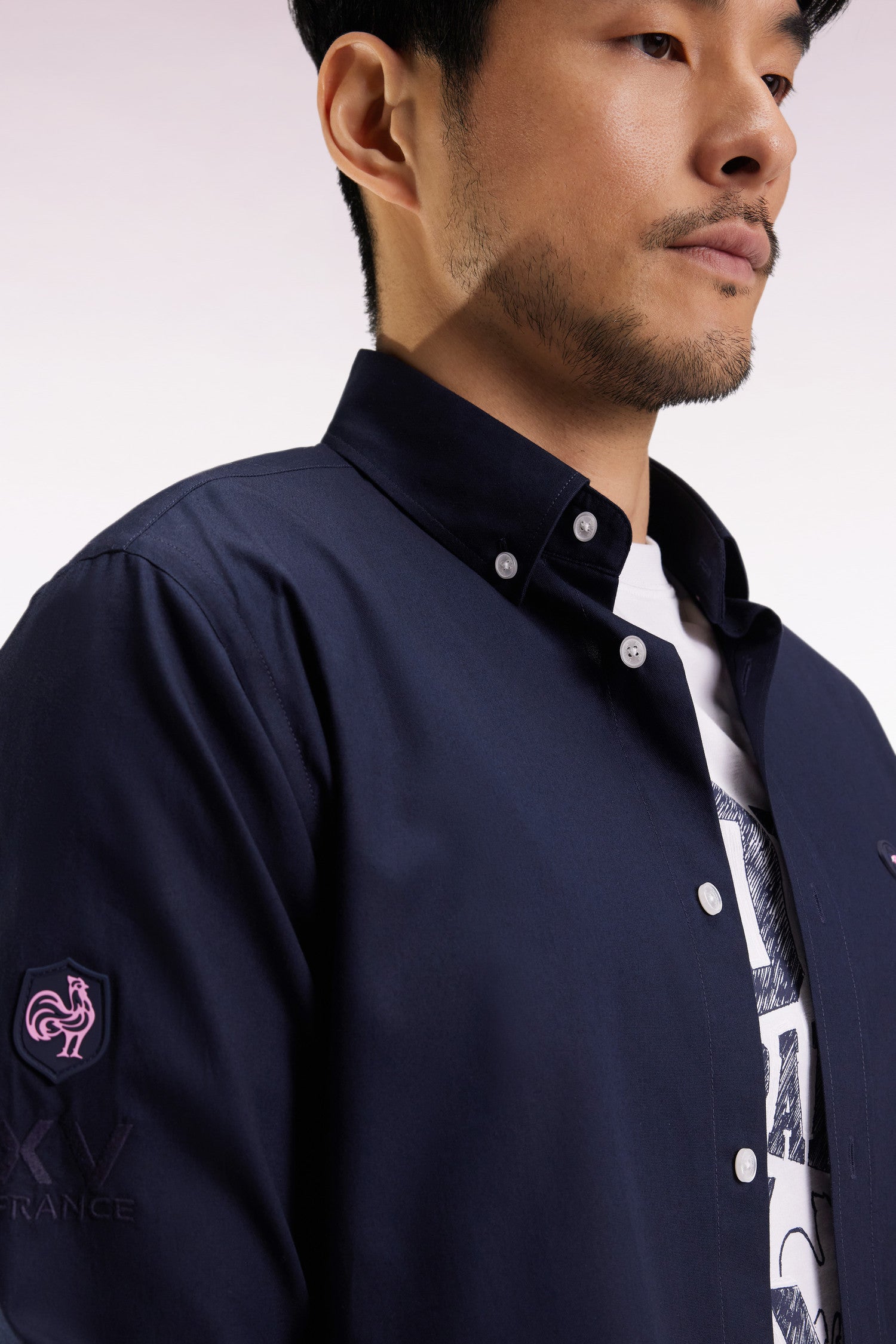 Impeccable allure and rugby spirit: this pinpoint cotton shirt stands out for its carefully thought-out details in homage to the XV de France. Pinpoint cotton is a soft, slightly textured fabric, finer than oxford and more structured than poplin, making it the ideal choice for elegant shirts with a natural fit. Its button-down collar, straight cut and gum badge on the chest give it a sporty-chic elegance, underlined by the large embroidery on the back and tie fabric applications printed in the colors of our emblem.
