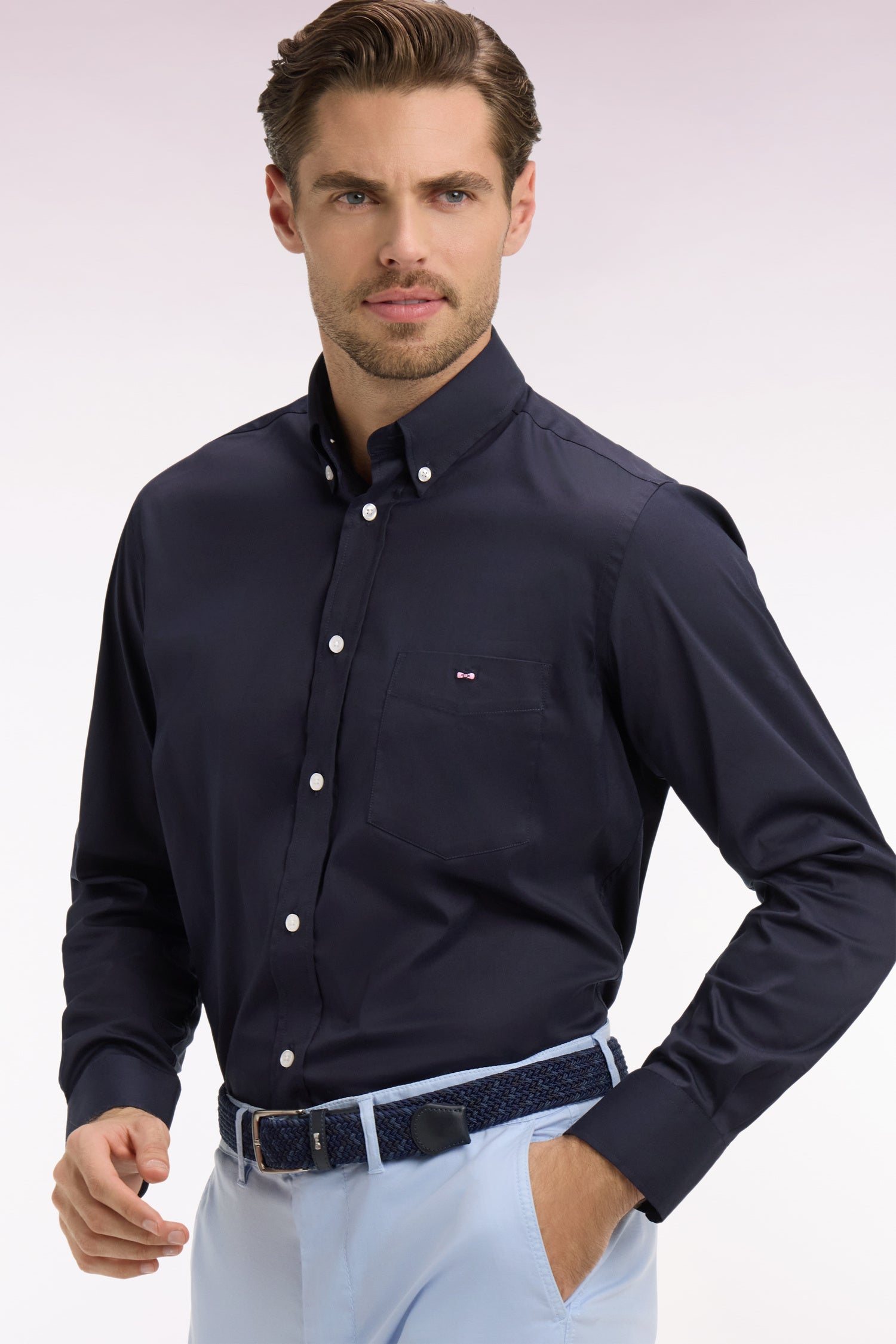 Essentiel du vestiaire masculin Eden Park, cette chemise unie adopte une coupe regular qui conjugue tenue et confort au quotidien. Déclinée dans plusieurs coloris elle sera parfaite pour accompagner un chino beige, un jean comme un pantalon de costume marine. Le col à pointes boutonnées, la broderie sur sa poche poitrine et les boutons inspirés de l’ovalie soulignent le soin des finitions, fidèles au style sport chic de la Maison. Une chemise versatile, pensée pour suivre naturellement du bureau à l’après-match.