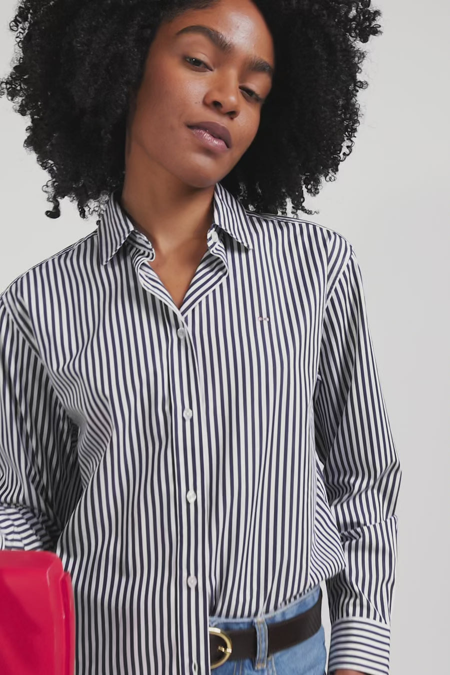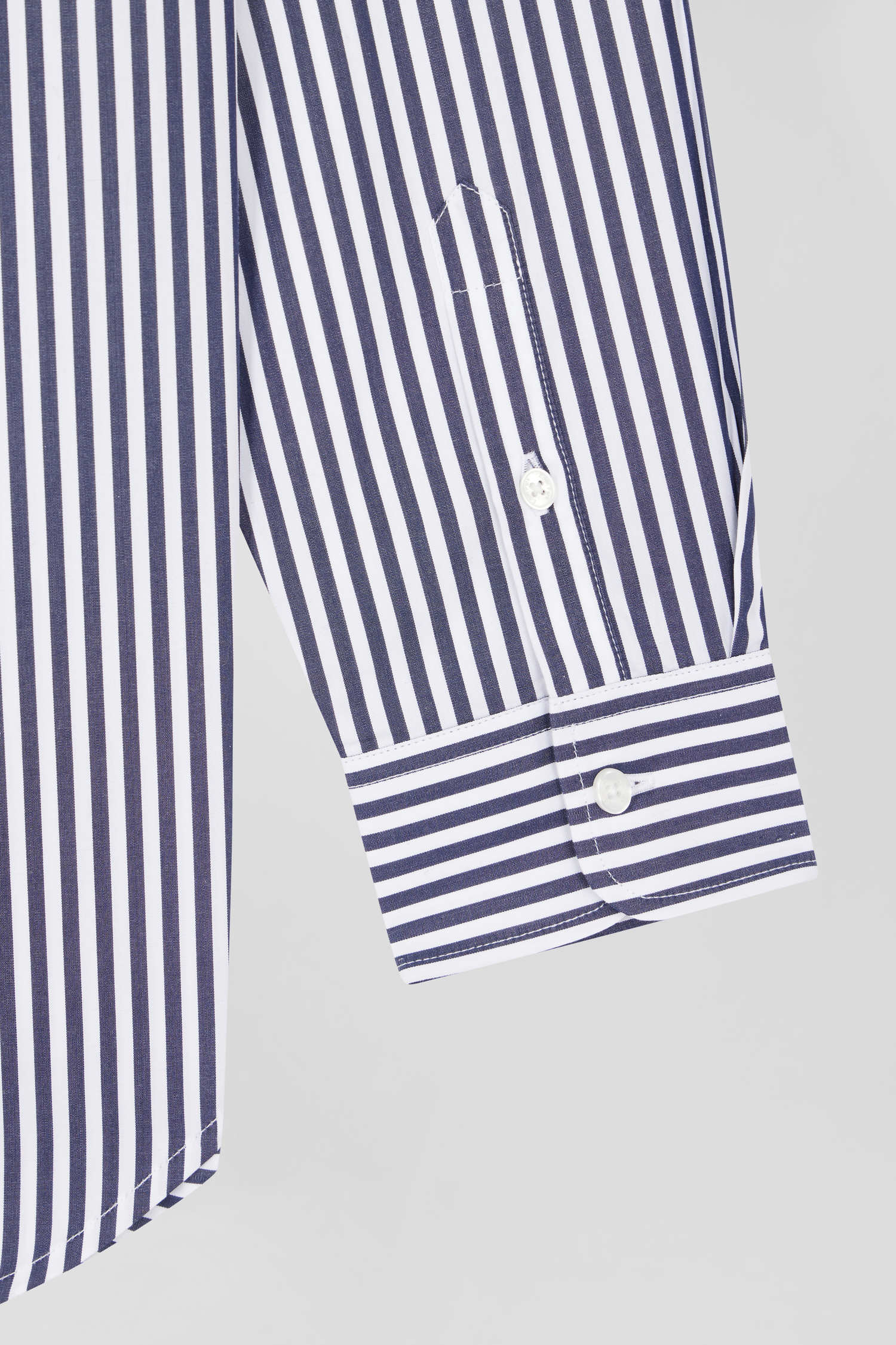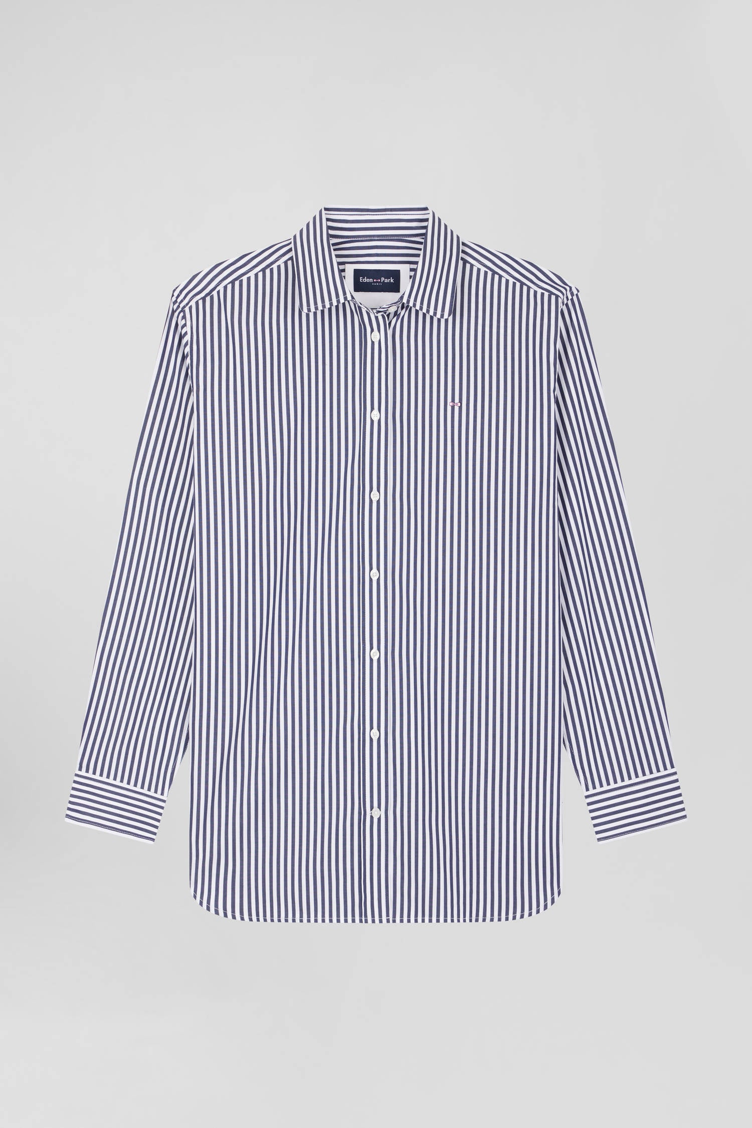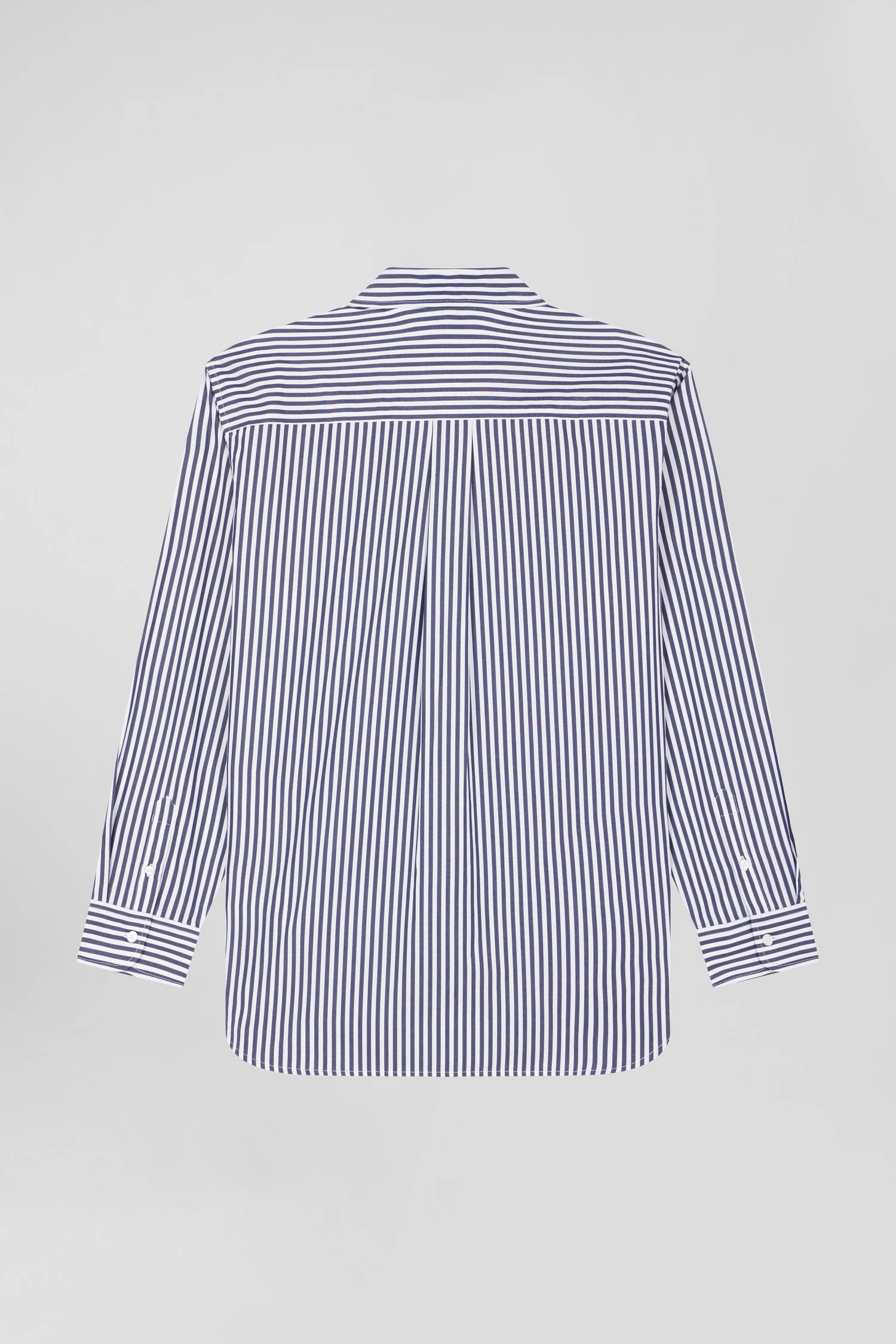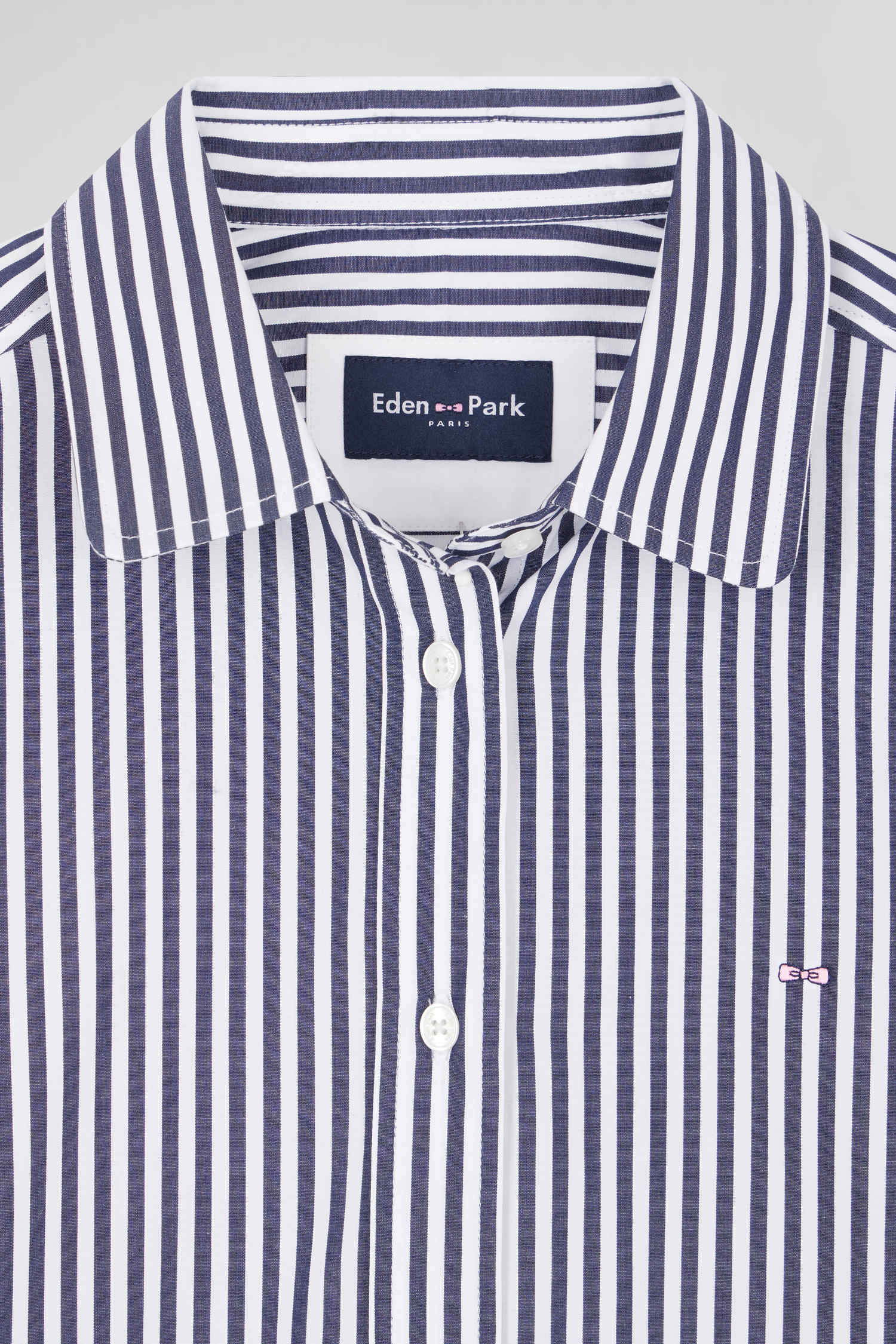 Opt for the casual charm of our striped cotton poplin shirt. Inspired by the men's wardrobe, this piece features a relaxed, looser fit for ultimate comfort. The pink embroidered bow on the chest adds a subtle feminine touch, while the oval Eden Park buttons reinforce its uniqueness. Perfect for a look that's both polished and casual, this cotton shirt in navy or sky will blend effortlessly with your favorite pieces for a polished everyday look.