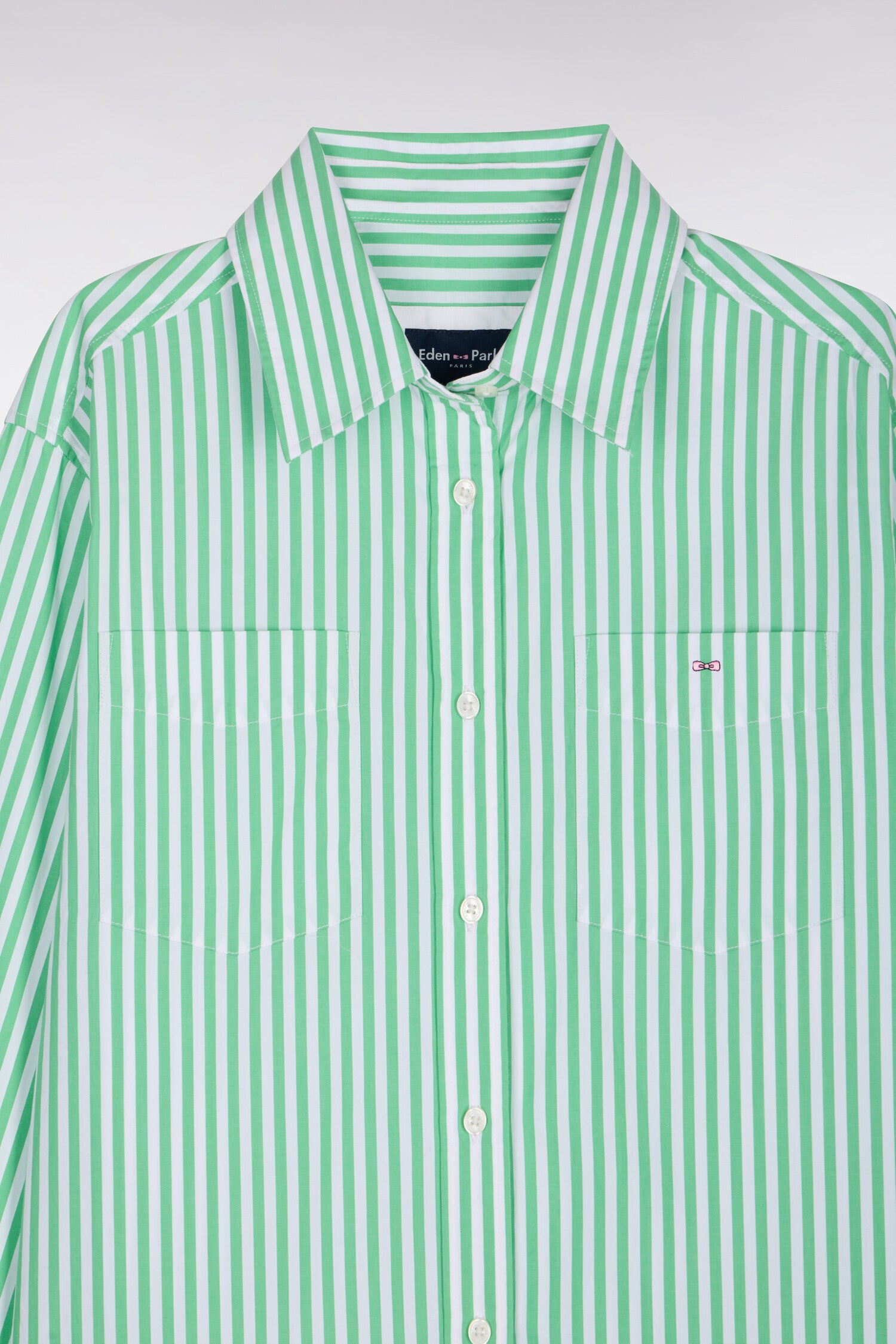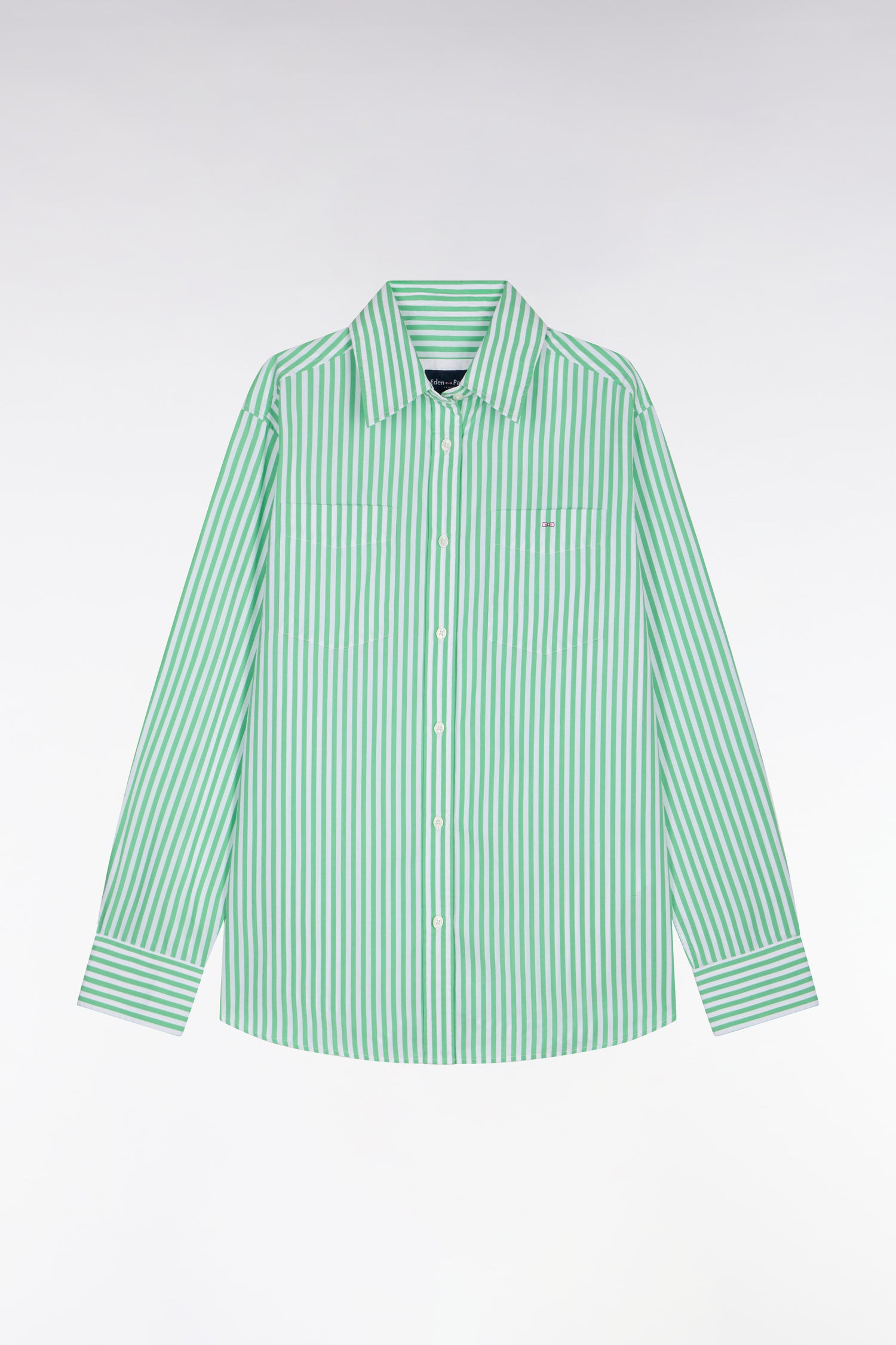 Avec ses rayures verticales inspirées du vestiaire preppy, cette chemise femme en popeline de coton réinterprète un classique mixte dans une version moderne et féminine. Sa coupe slim assure un tomber flatteur impeccable, tandis que ses deux poches plaquées structurent la silhouette. On la porte facilement avec un pantalon flare, un jean brut ou un bermuda pour une silhouette preppy-chic au cœur de l'été. Un indispensable à porter tout au long de l'année dans son coloris beige ou dans un vert lumineux.