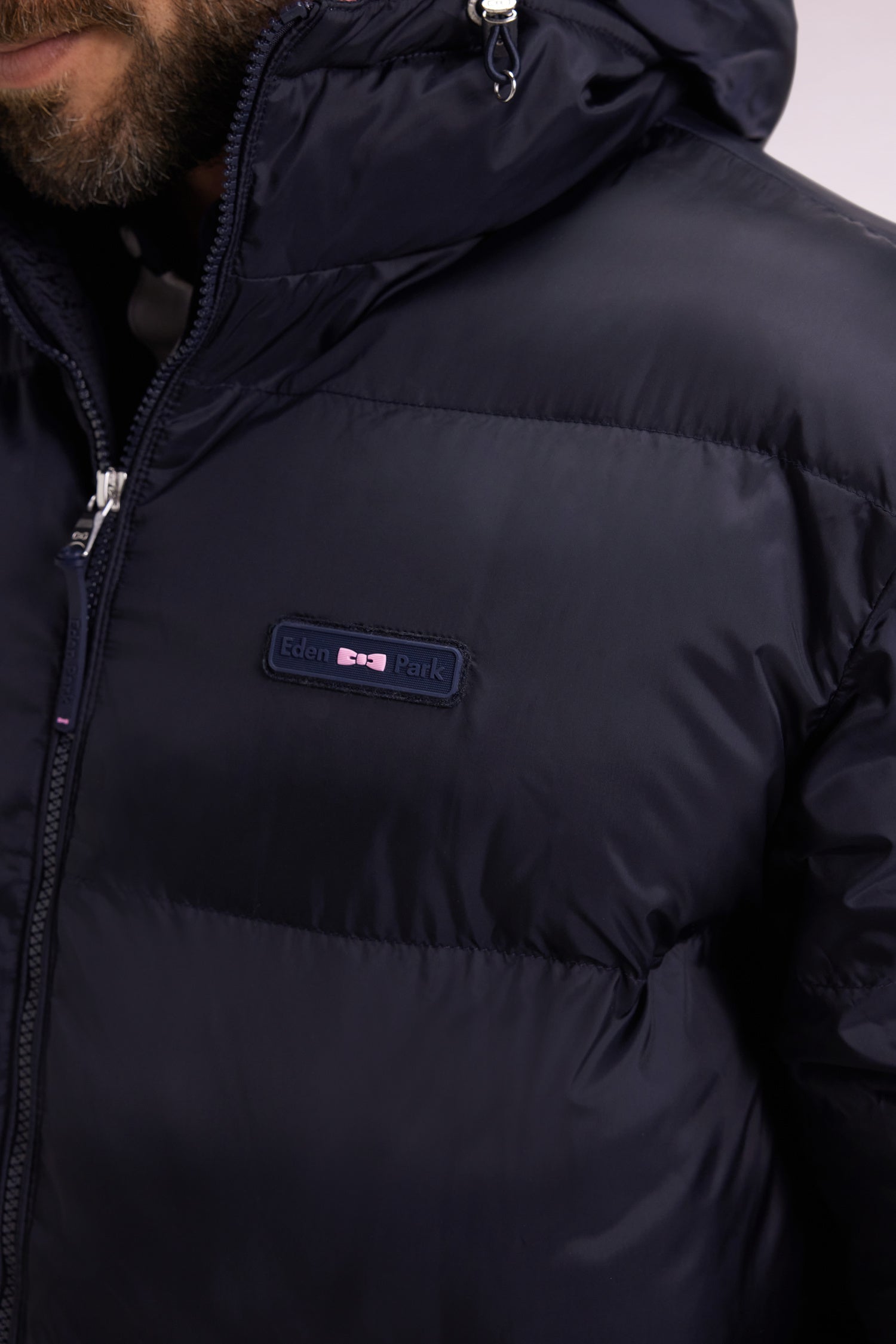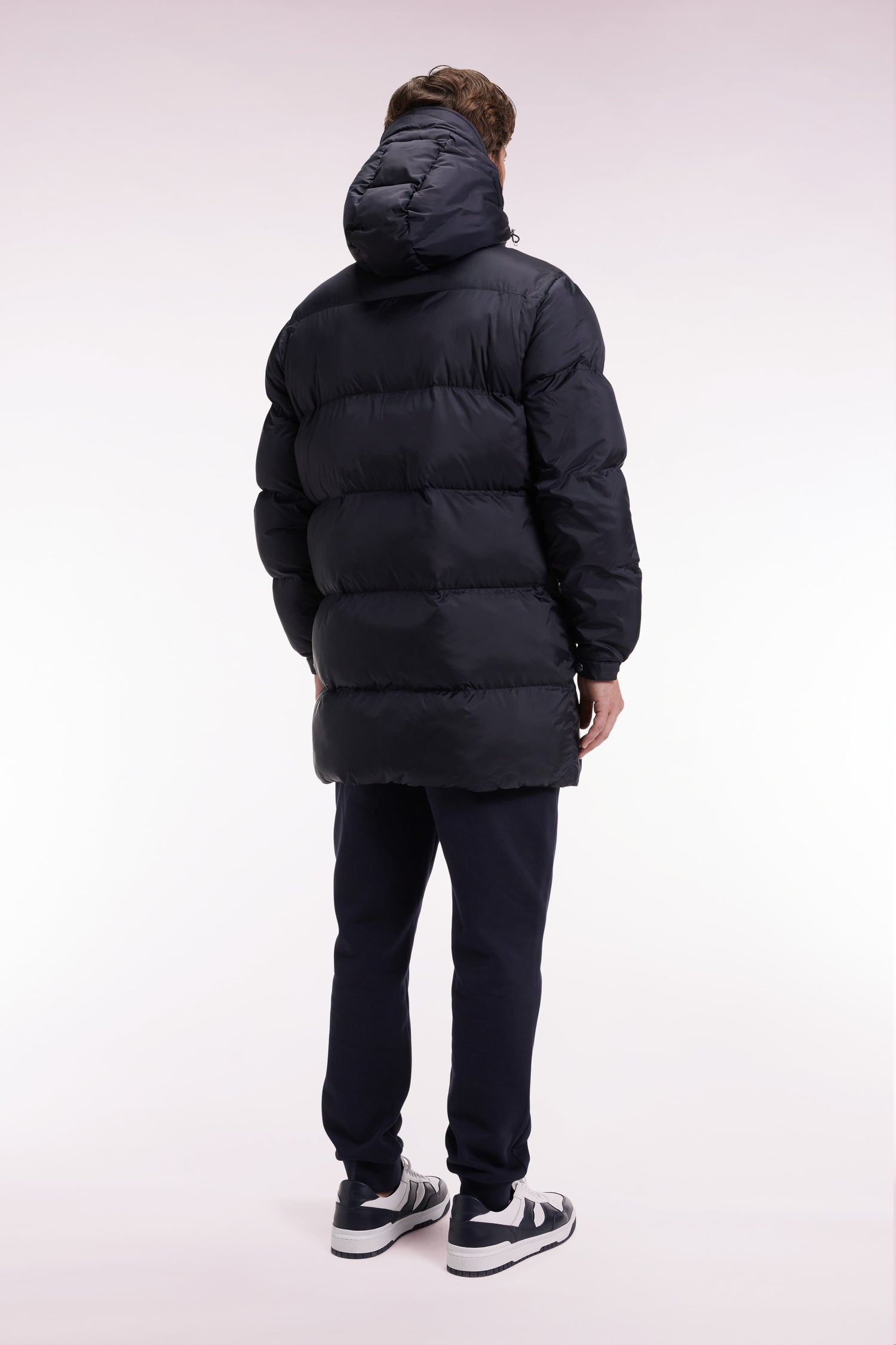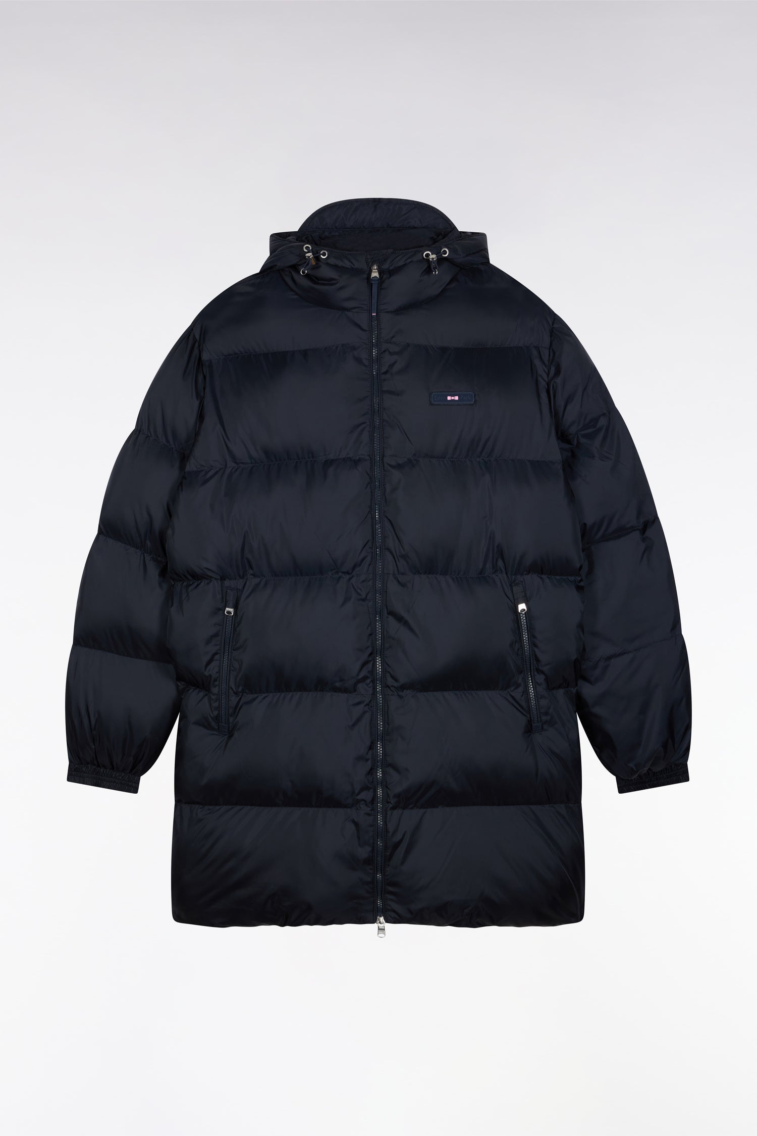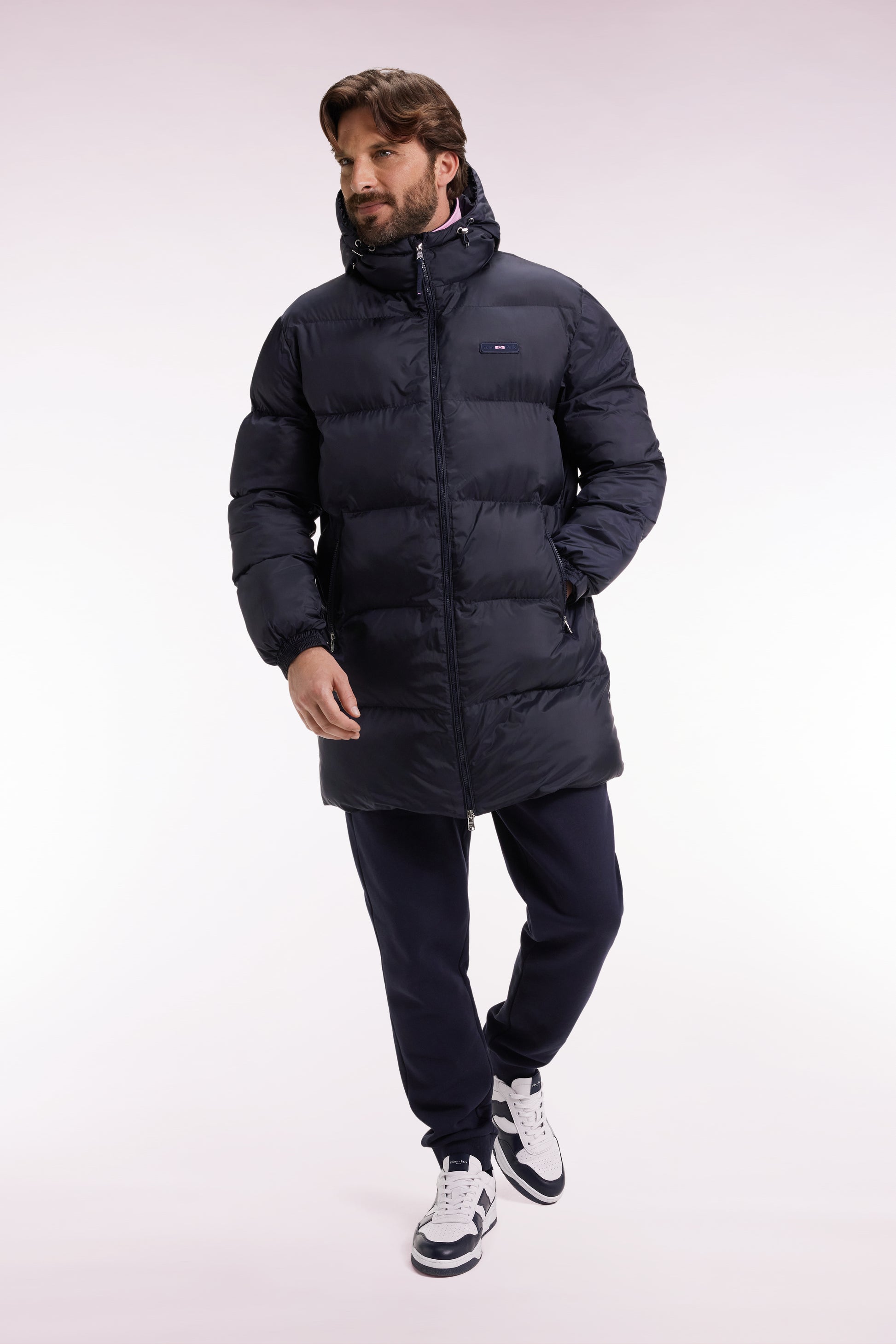 Designed by our design studio to face winter with style, this long down jacket with integrated hood seduces with its generous volume and wide quilting with a subtle shiny finish. Available in black or navy, this men's down jacket combines protection and elegance with silver metal zips, elasticated cuffs with snap tabs and emblematic finishes: tricolor ribbon under the neckline and gum logo bar on the chest.
