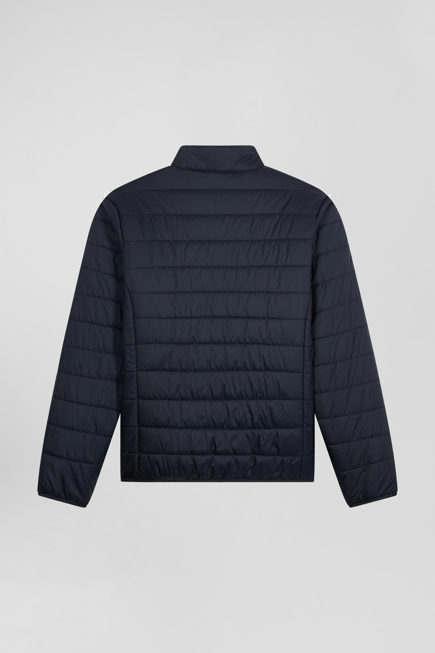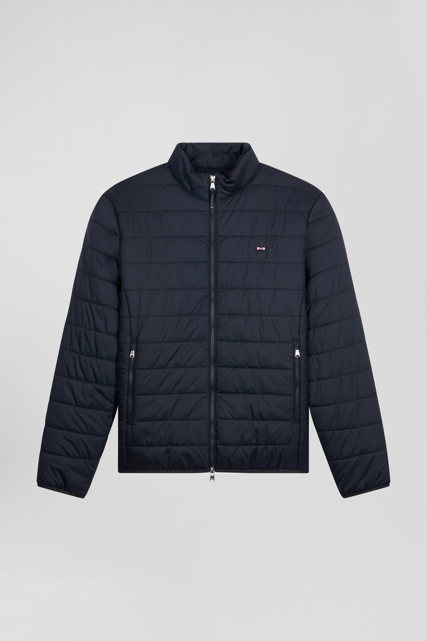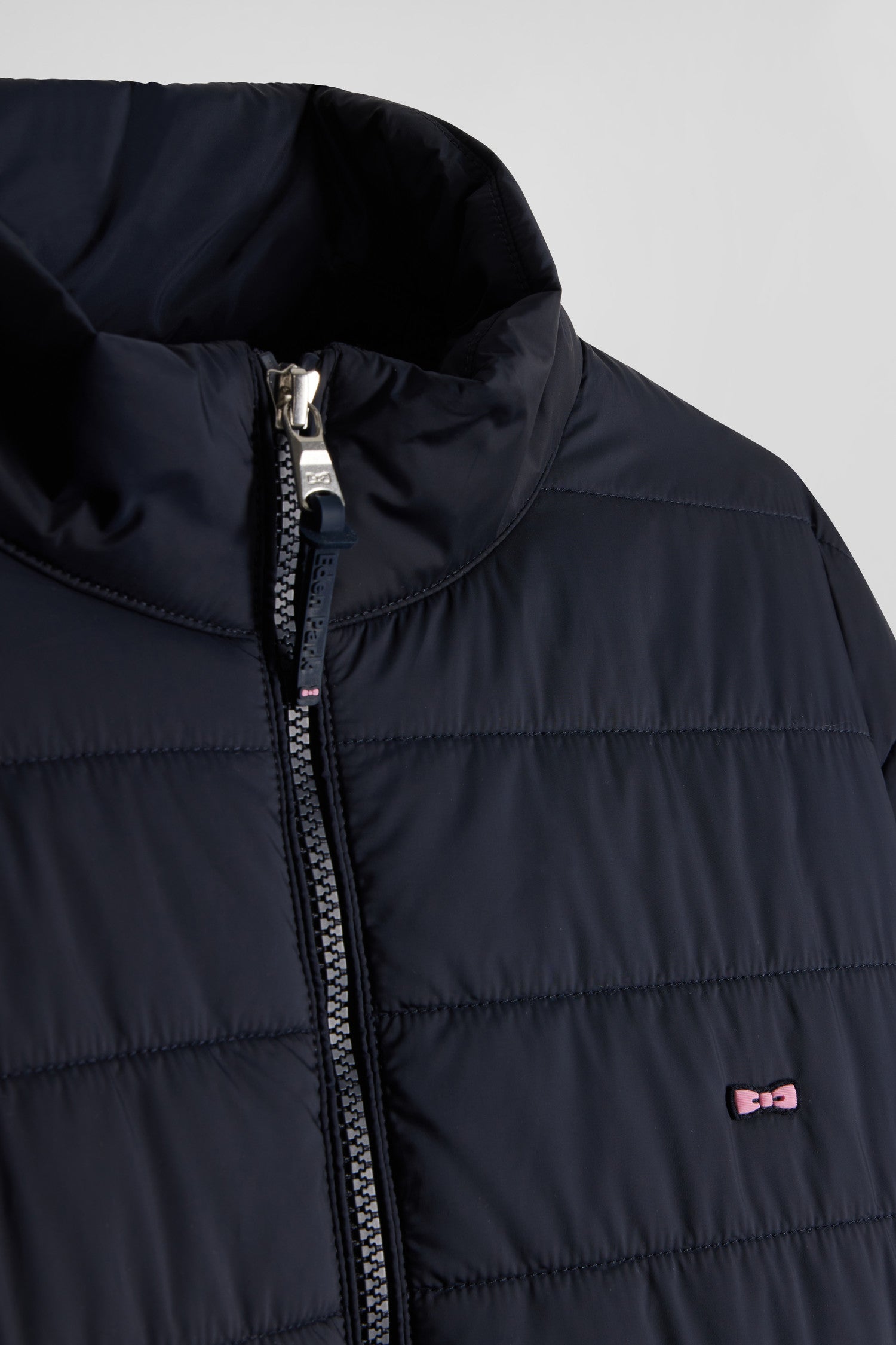 Opt for a classic silhouette with this long, high-collared down jacket, available in navy or black. Made from robust nylon with a matching lining, it offers warmth and comfort. Its customized double-slider zip adds a distinctive touch, while exterior zip and interior scratch pockets guarantee functionality and security. The gum bow at the chest marks this garment with the famous French Flair, Eden Park's quirky elegance, for a style that's as stylish as it is timeless.
