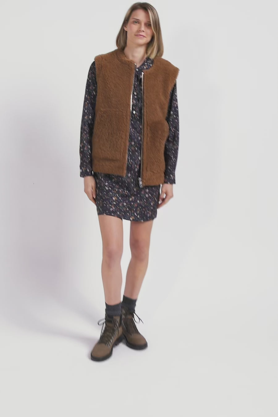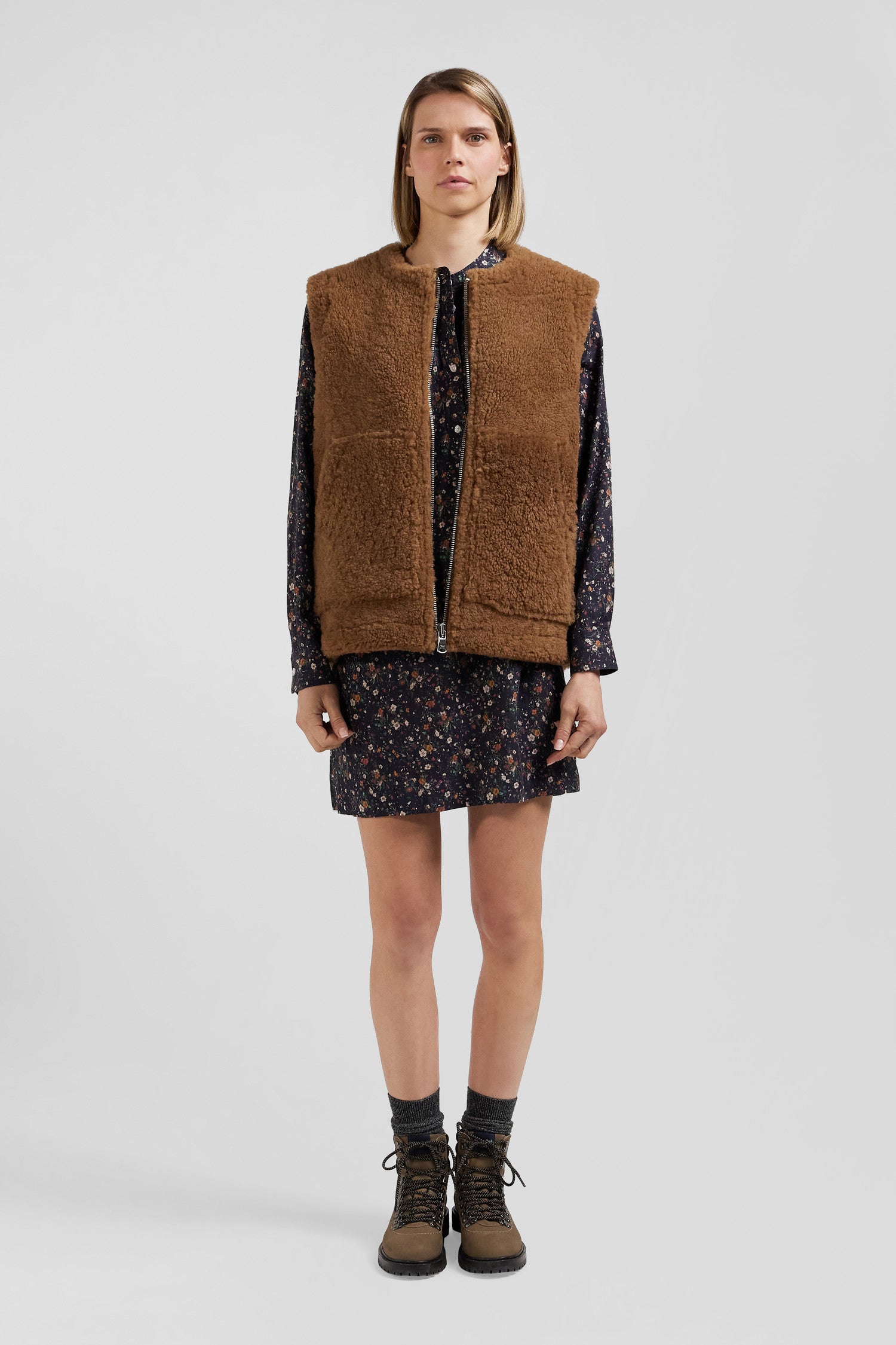 This sleeveless vest in shearling is a genuine leather piece that combines luxury and practicality. Equipped with a signature shiny-finish zip, it offers elegant, versatile styling, perfect for layering over shirts or sweaters thanks to its Relaxed cut. With its large front pockets, this vest combines functionality and style. Under a coat in winter or in place of a jacket in mid-season, this hazelnut shearling vest will never leave your side.