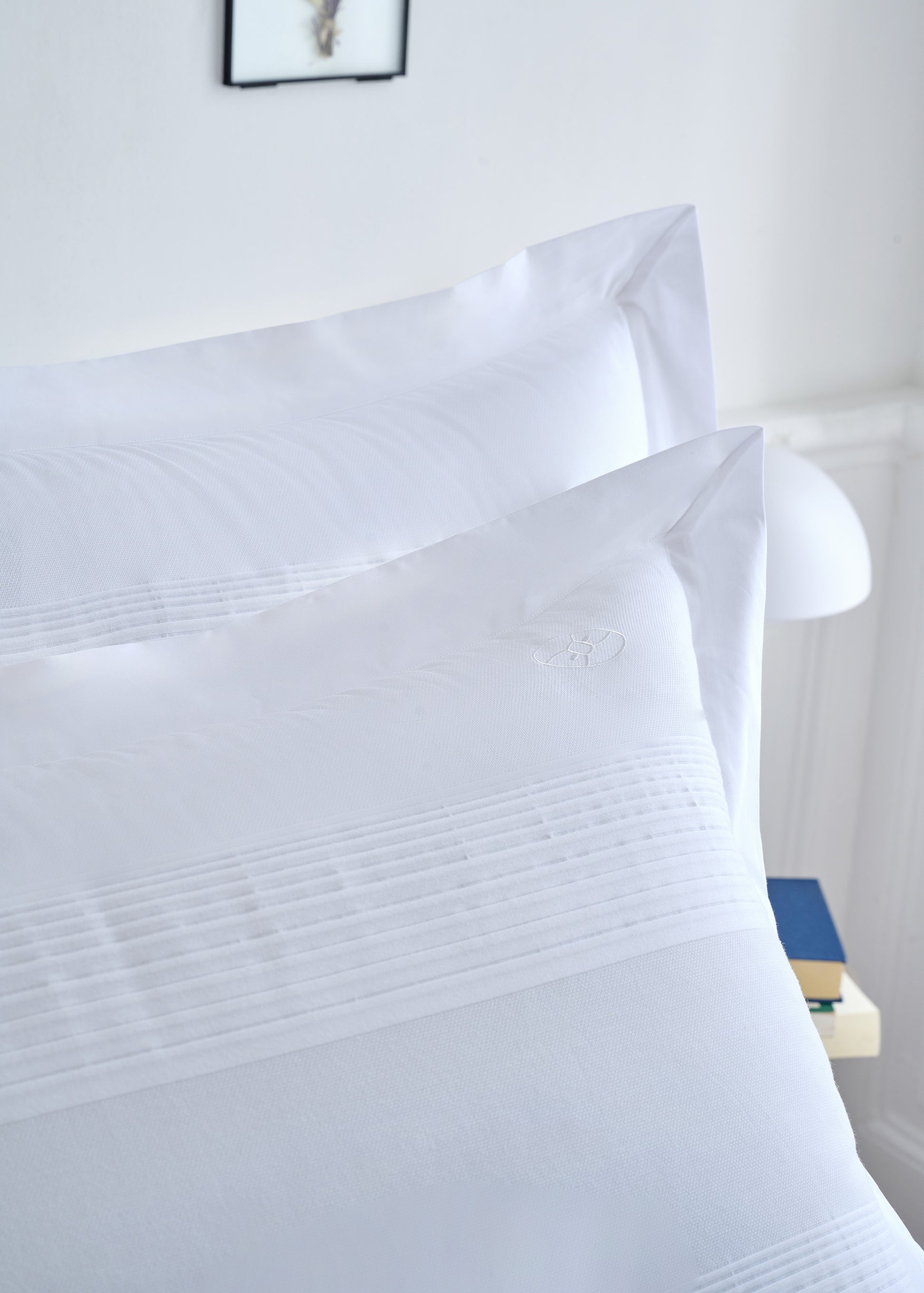 Inspired by a timeless motif: the fine stripe, this square pillowcase combines sobriety and style by revisiting it with tone-on-tone religious pleats, adding texture and graphics to this bed linen set. Available in a set of 2 and coordinated with the matching white cotton percale comforter cover for an irresistibly charming bedroom. The choice of cotton, a soft and eco-responsible natural material, and of the century-old Amalia Home Collection as a partner for our art de vivre collections, ensures unparalleled comfort and sophistication.
