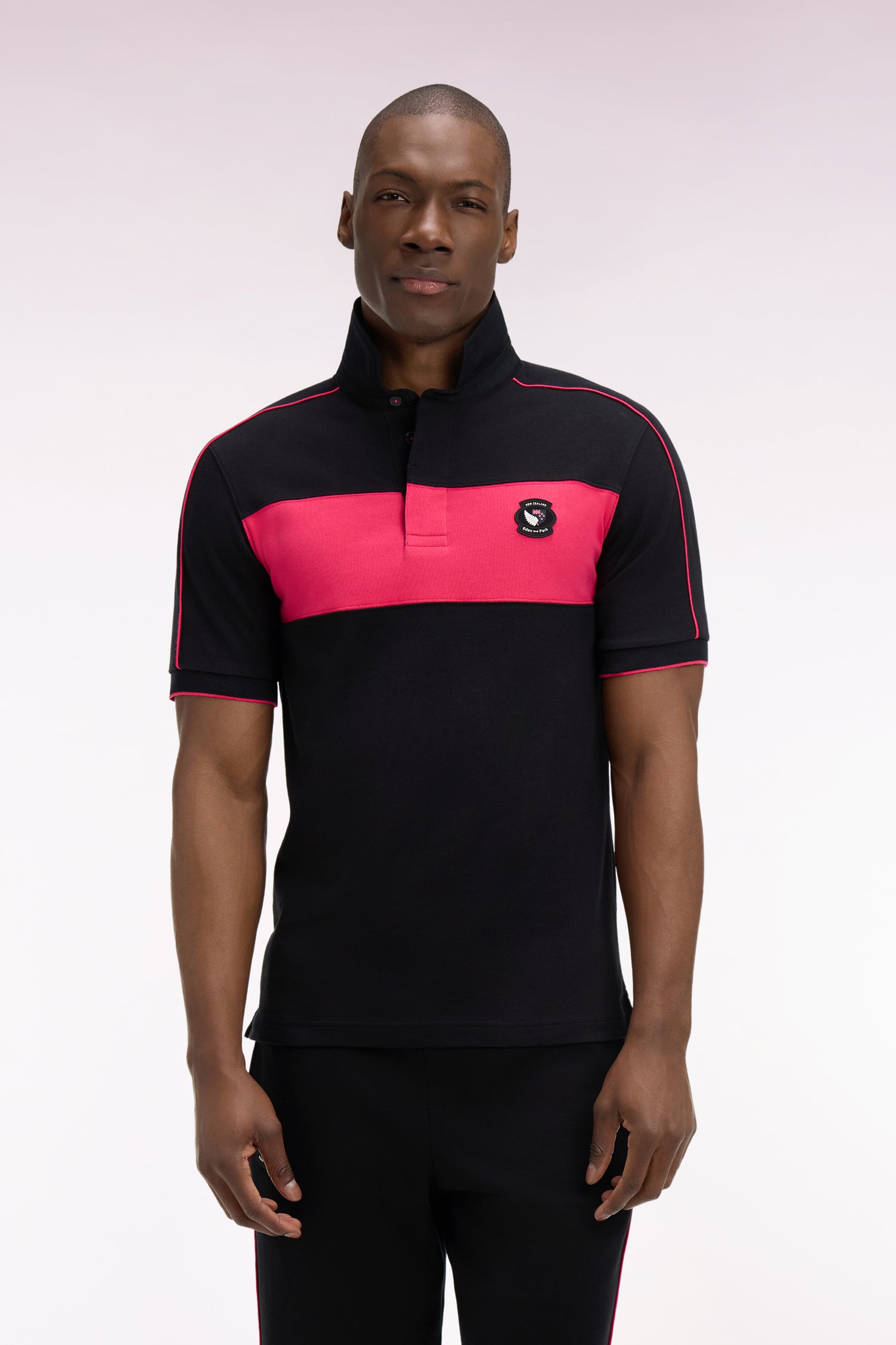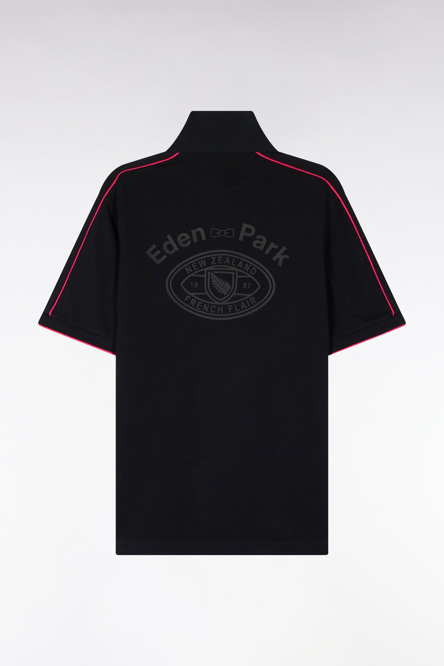 Ce maillot à manches courtes est emblématique du savoir-faire comme du style des collections Eden Park. Décliné en noir et fuchsia ou en rose et noir, il se distingue par sa bande contrastée, son motif reliefé dans le dos et son écusson hommage à la Nouvelle Zélande. La carrure est quant à elle mise en valeur par un passepoil contrasté le long de la découpe des manches. Idéal pour une allure sportive tendance, en ville ou au bord du terrain.