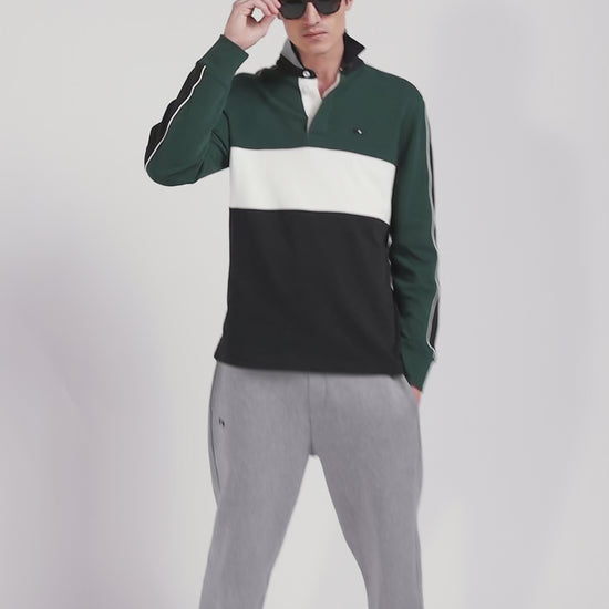 Regular green and navy blue colorblock long-sleeved cotton rugby shirt