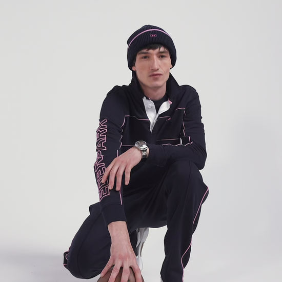 This long-sleeved jersey in navy cotton jersey is accented with pink piping along the cutouts for a touch of subtle contrast. EDEN PARK volume embroidery on the sleeve adds a distinct signature, while its ribbed under-collar and cotton twill collar give it a neat finish. With its straight cut, this navy blue and pink men's jersey combines sporty style with casual elegance.