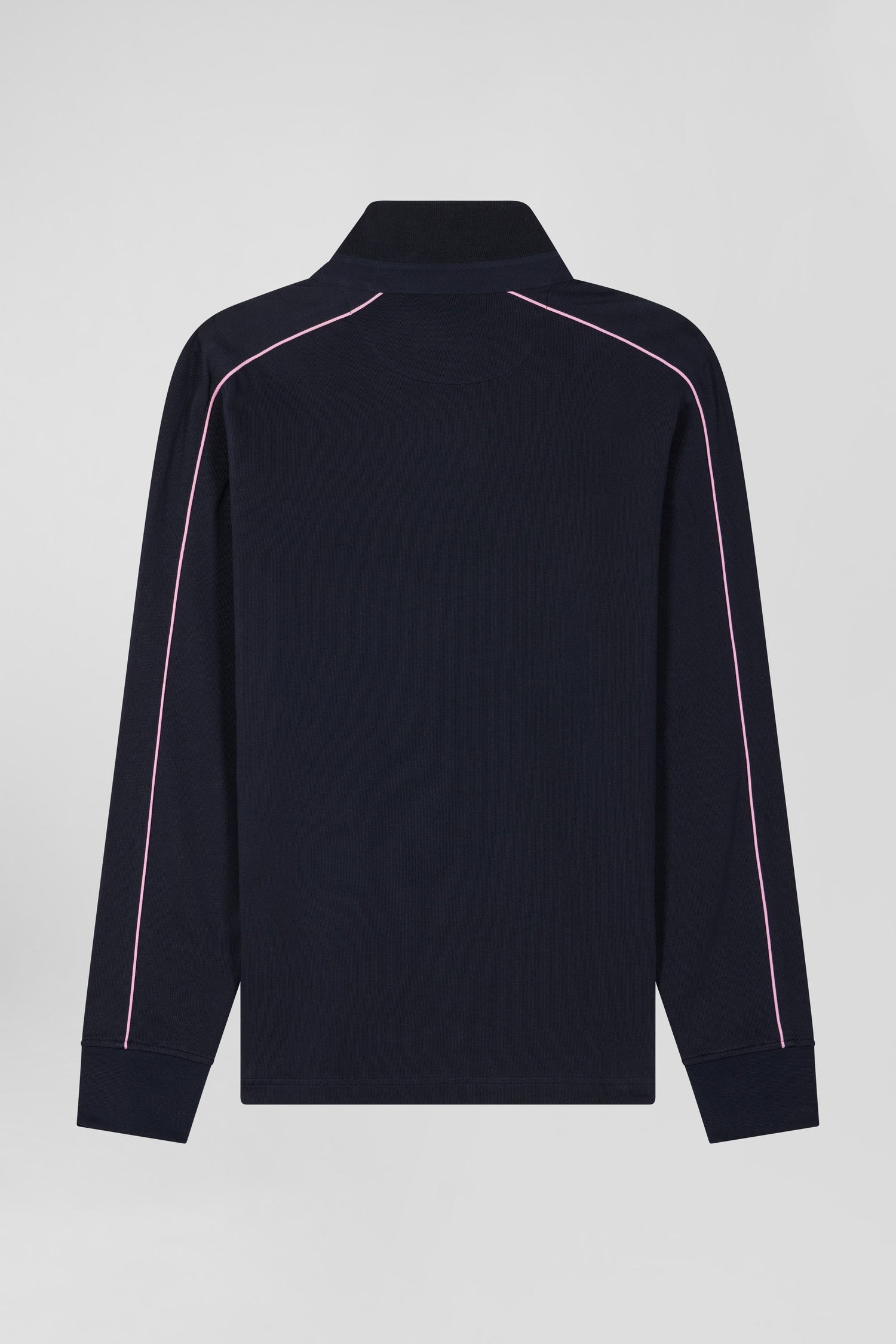 Regular navy blue long-sleeved cotton rugby shirt with pink piping
