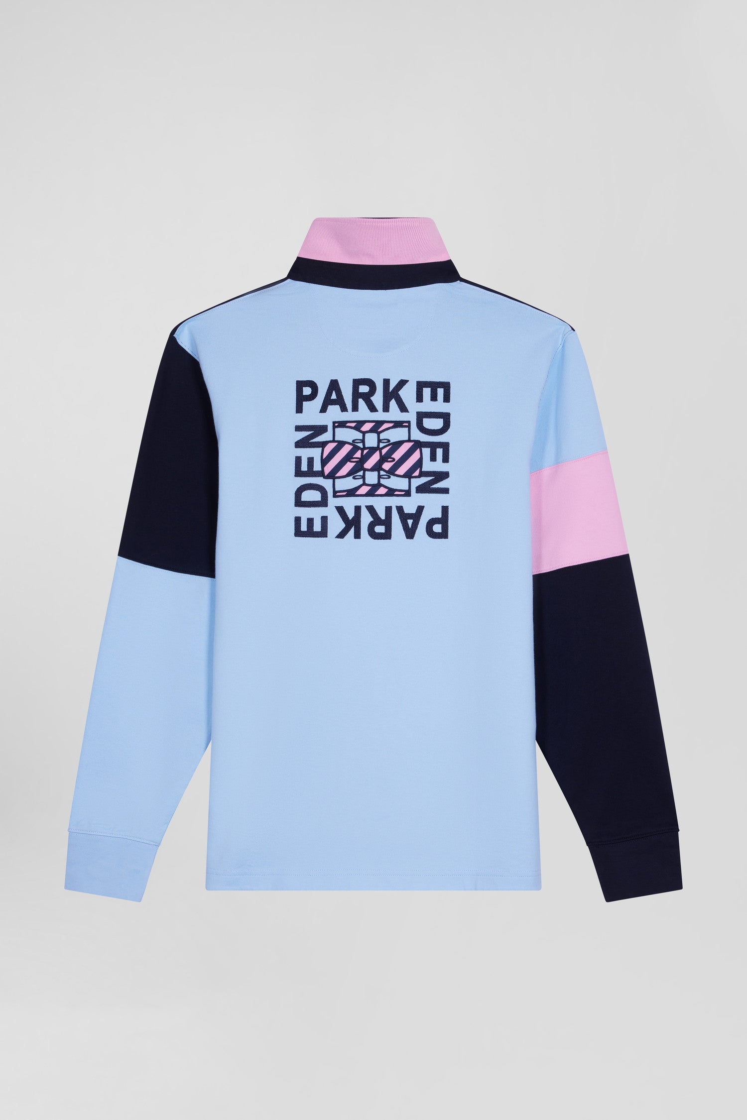 Regular navy blue long-sleeved cotton rugby shirt with tie fabric patchwork