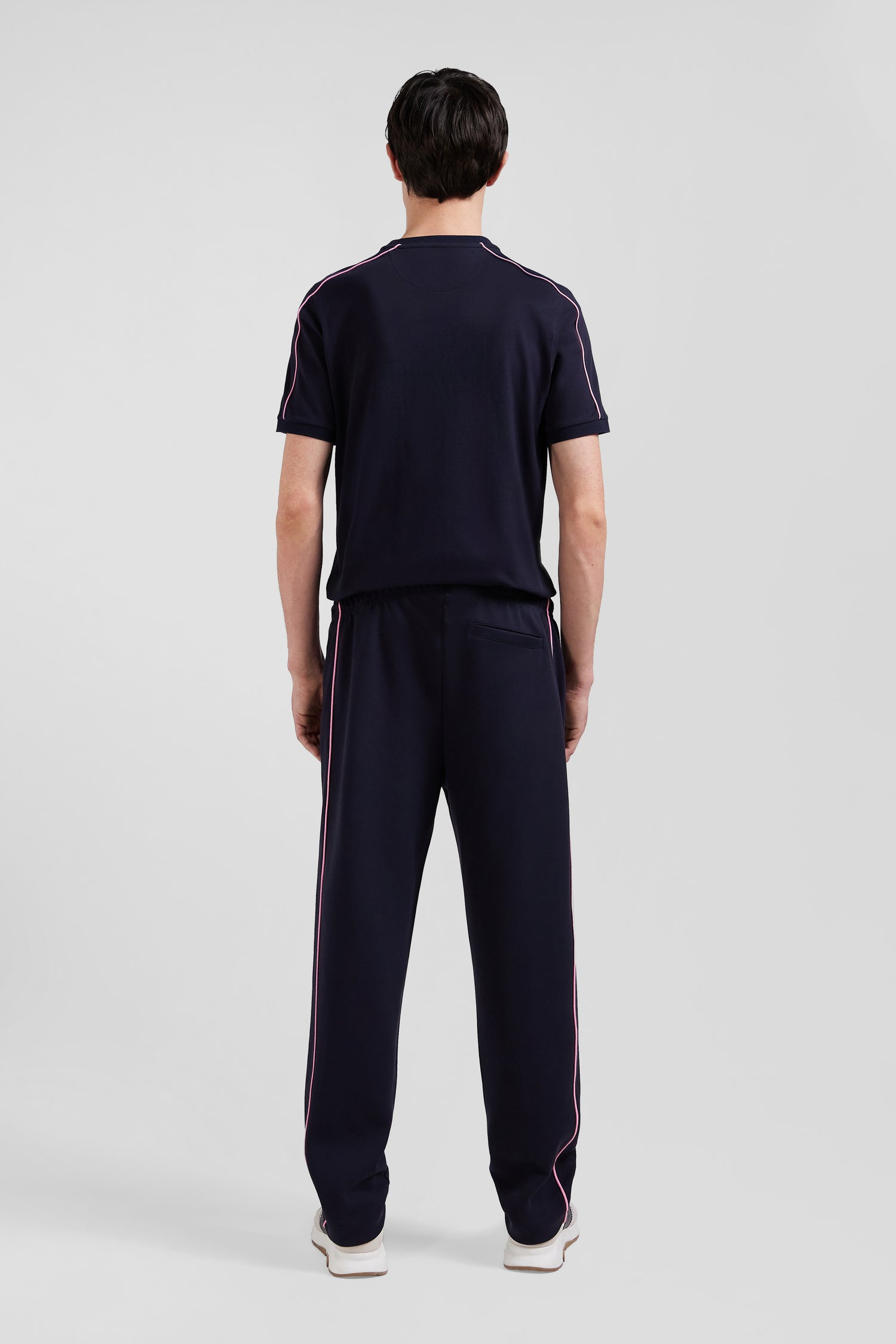 For your casual outfits, opt for our navy blue cotton blend men's jogging pants in a straight Regular cut, ideal for combining comfort and style. They feature elegant pink piping, an elasticated waistband for optimum fit, and meticulous finishing touches, including a distinctive bowtie embroidery.