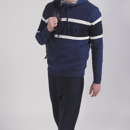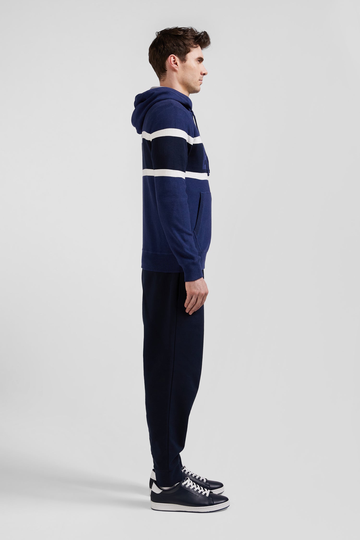 Work on your casual look with this hooded sweater, which skilfully combines contrasting knits for a dynamic visual effect. On the chest, a jacquard stripe highlights the EP 10 logo. Inspired by the sweatshirt with its ribbed trim, integrated hood, jersey body and reverse jersey half-moon, this sweater is the perfect blend of style and comfort.
