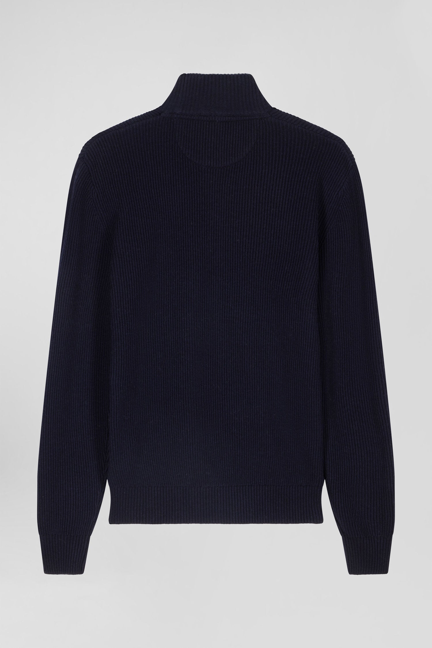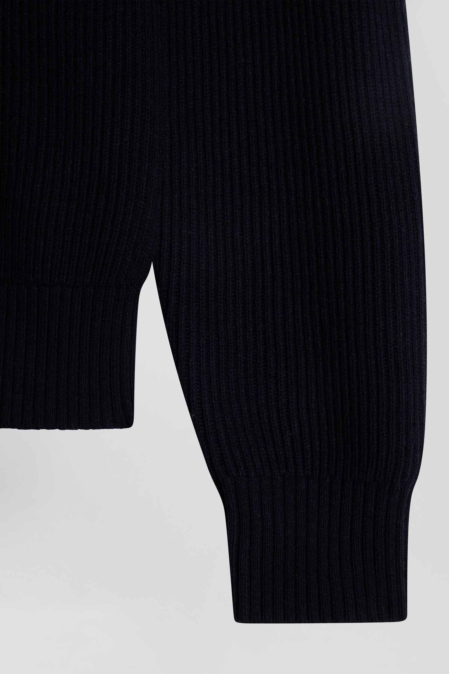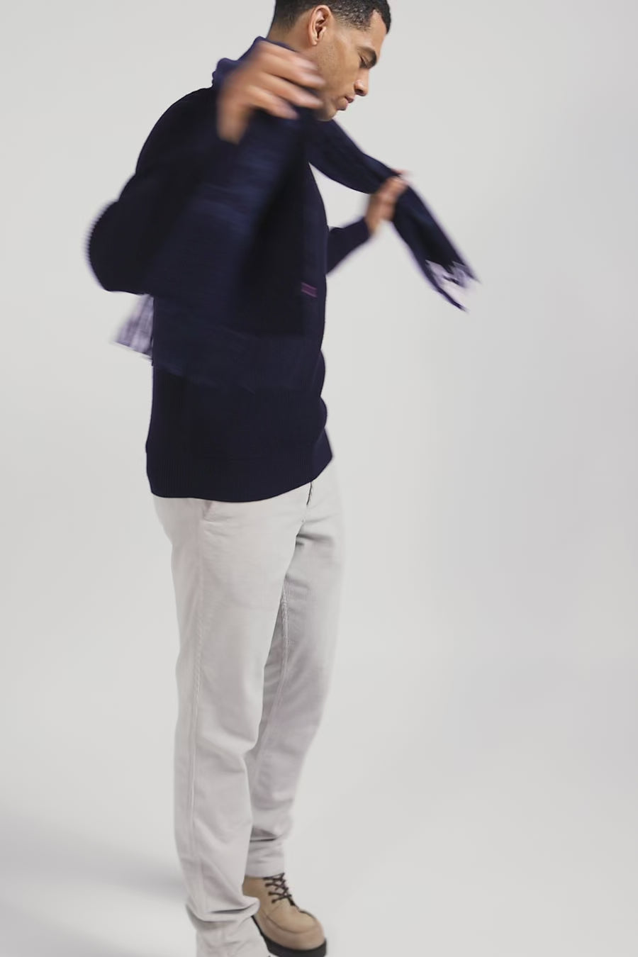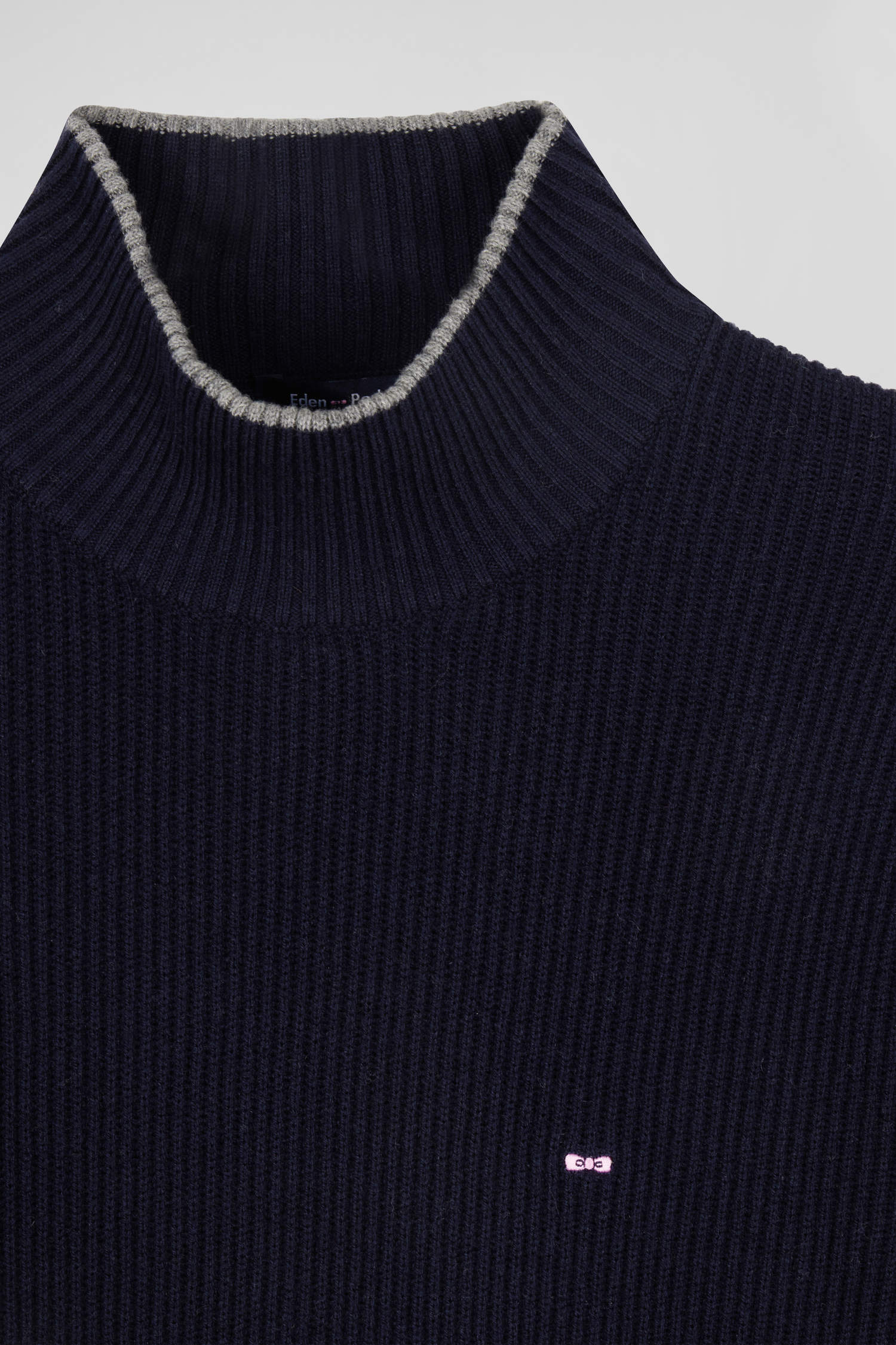 This mock-neck sweater, crafted in a soft wool/cotton blend, is the epitome of casual refinement. The ribbed edges, enhanced by fine contrasting piping, add subtle elegance while ensuring this men's sweater falls impeccably. Its English rib knit offers a rich, comfortable texture. A ribbon knit inside the collar adds an extra touch of sophistication to this straight-cut sweater, perfect for a neat, timeless look.