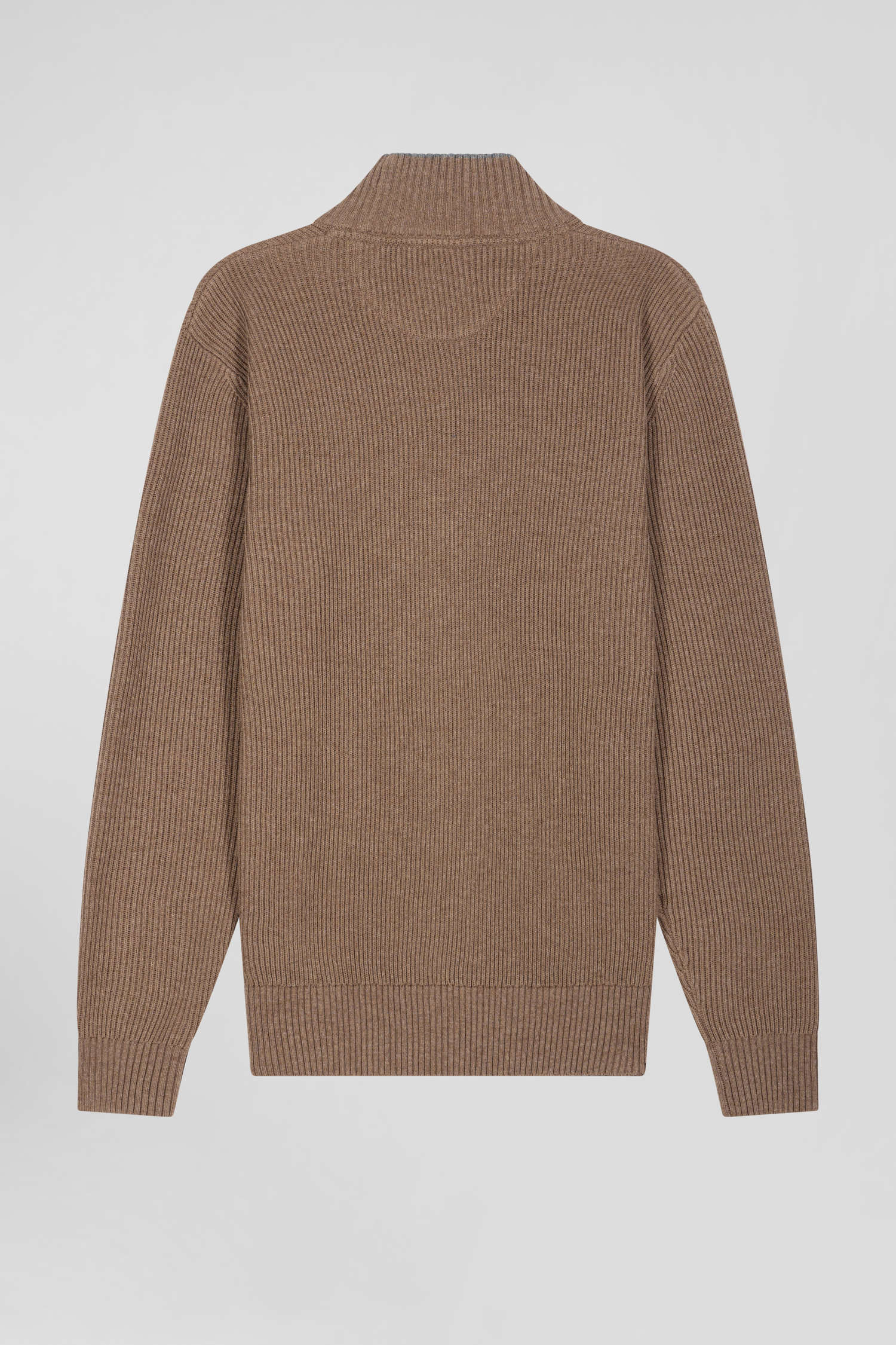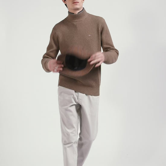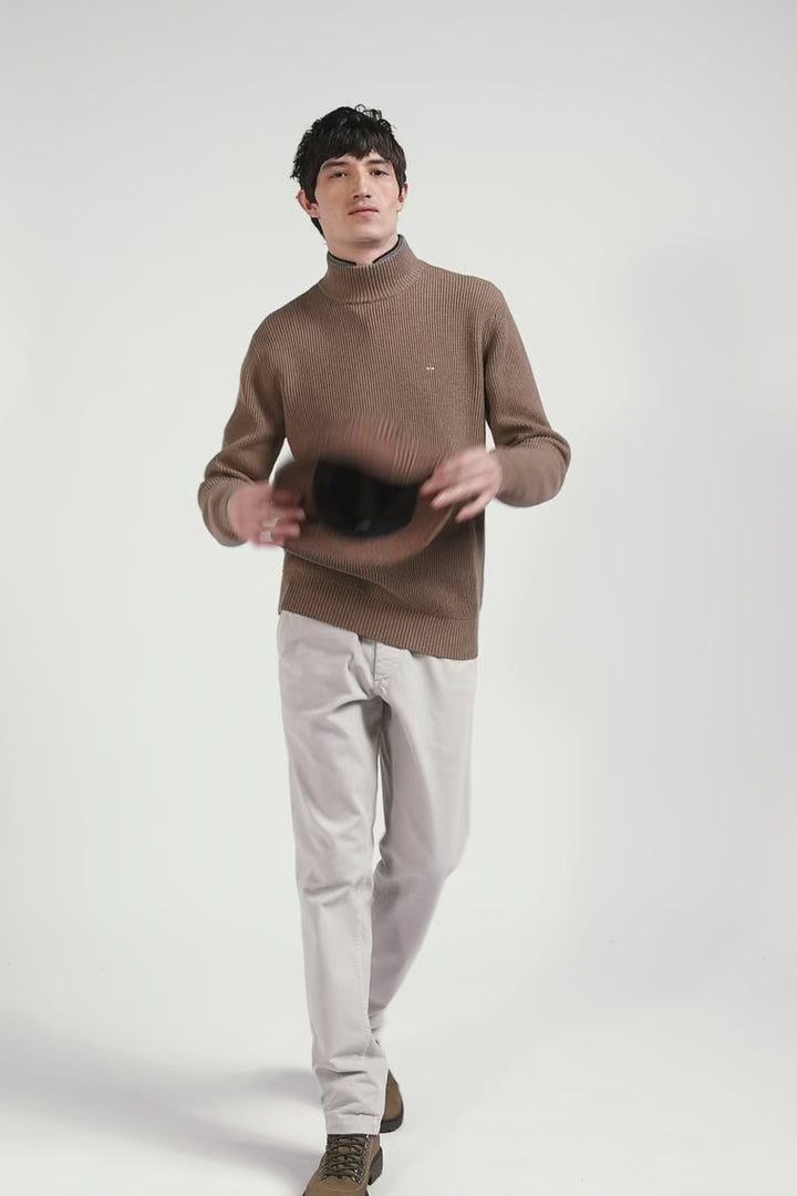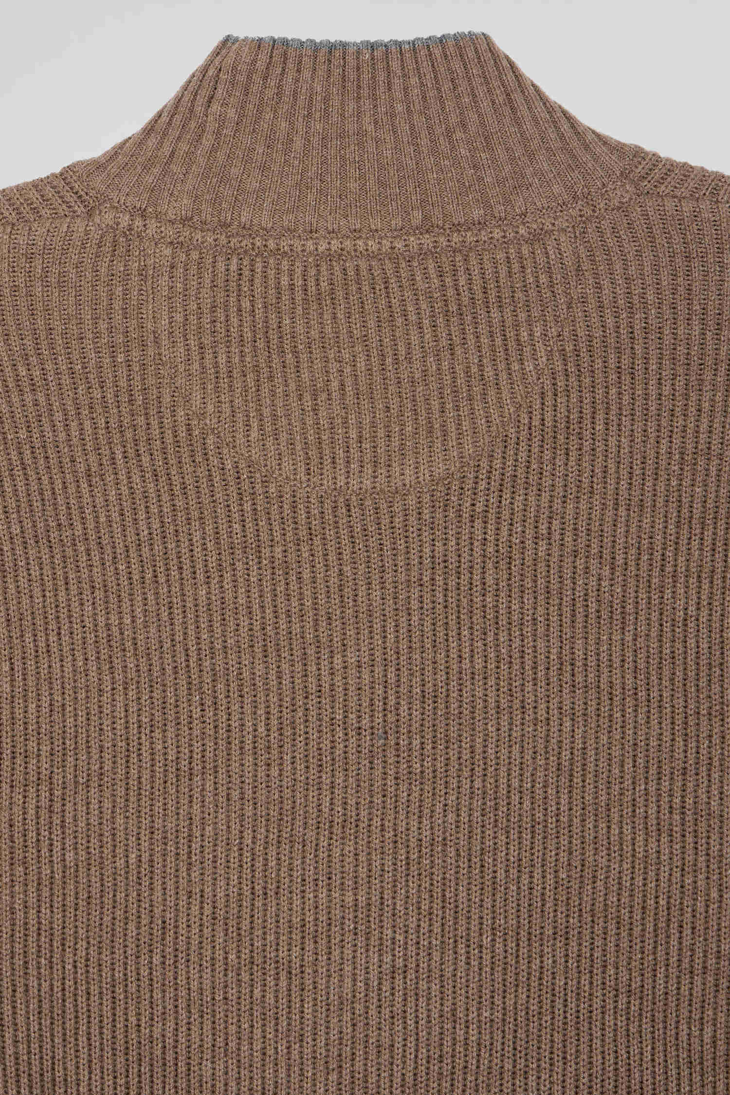 This mock-neck sweater, crafted from a soft blend of wool and cotton, is the epitome of casual refinement. The ribbed edges, enhanced by fine contrasting piping, add subtle elegance while ensuring this men's sweater falls impeccably. Its English rib knit offers a rich, comfortable texture. A ribbon knit inside the collar adds an extra touch of sophistication to this straight-cut sweater, perfect for a neat, timeless look.