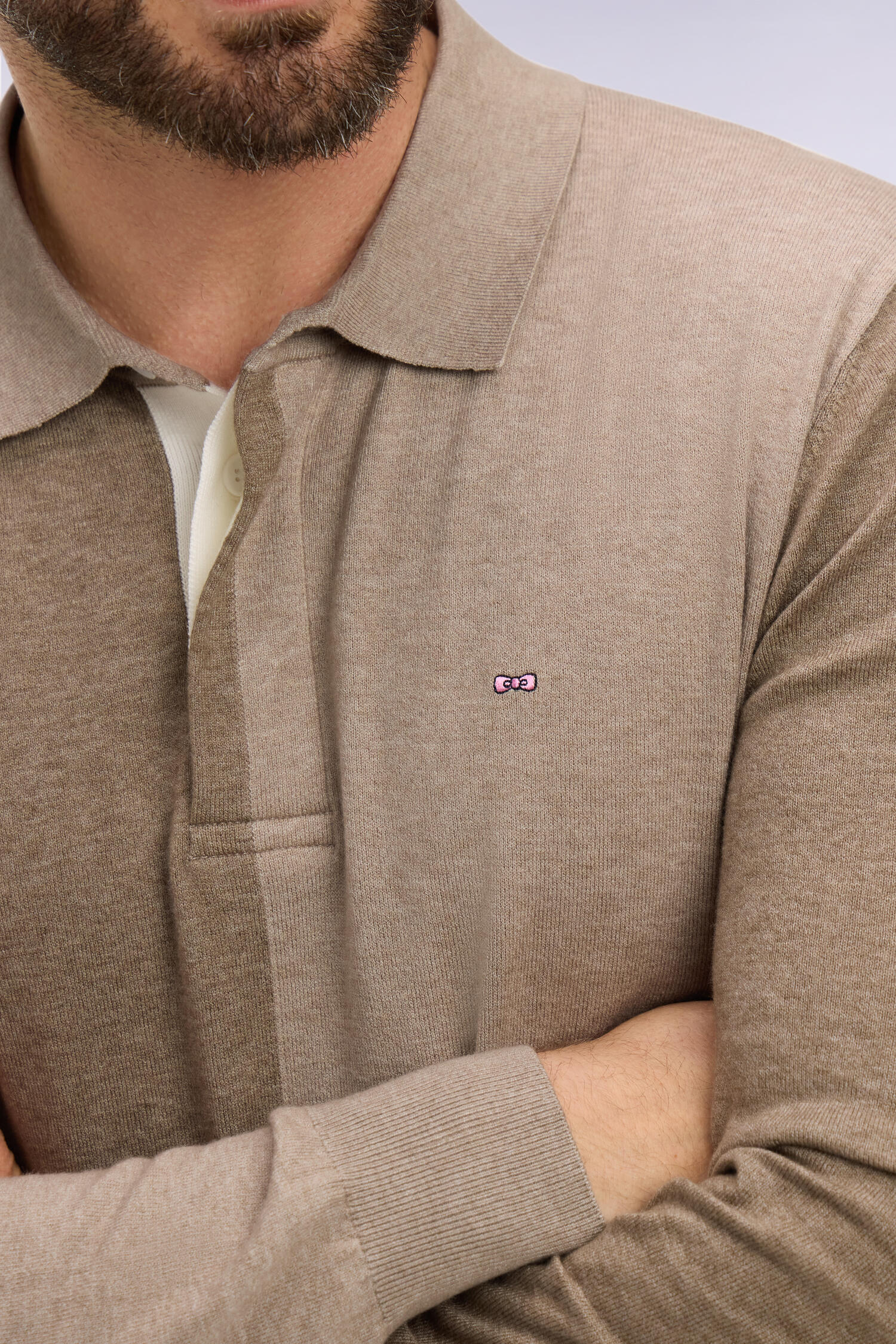 This jersey collar sweater, knitted in jersey and reverse jersey, with an elegant transition creating a vertical stripe effect, revisits the Japanese rugby jersey with a touch of refinement. This trendy and timeless piece has tone-on-tone ribbed edges and a white chevron ribbon button placket.