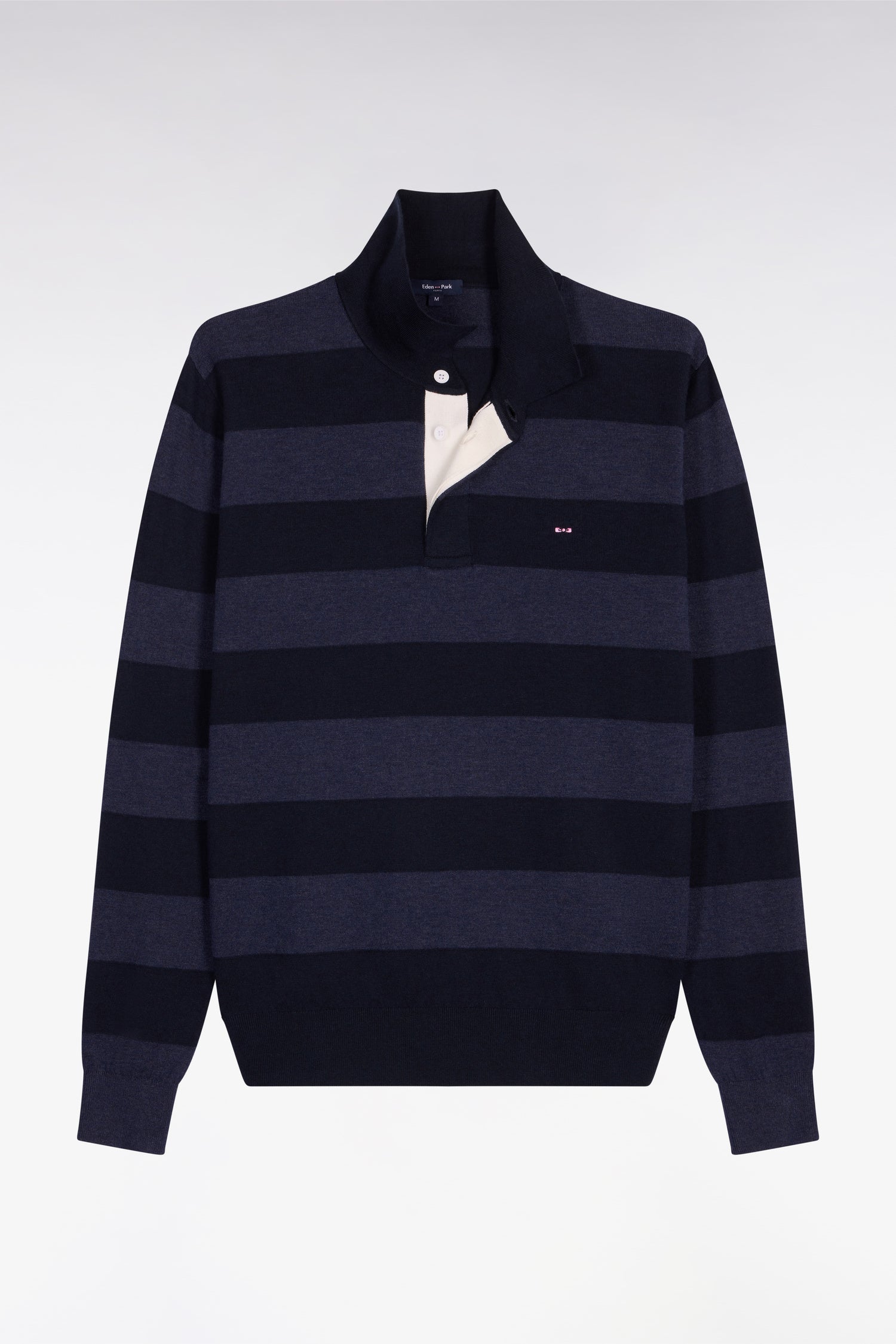 In its variation of gray and navy stripes, this men's jersey collar sweater pays a subtle homage to African rugby jerseys. The interplay of stitches alternating stockinette stitch and reverse stockinette stitch creates a refined relief, highlighted by tone-on-tone binding stitching. Its white chevron ribbon plaque under its button placket enhances its elegance, faithful to the sport chic spirit of the House.