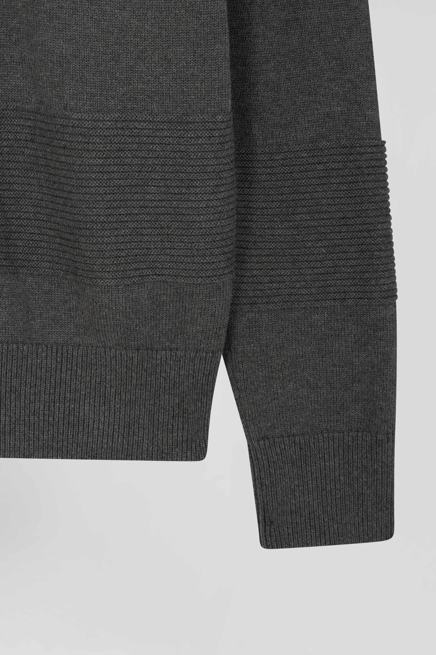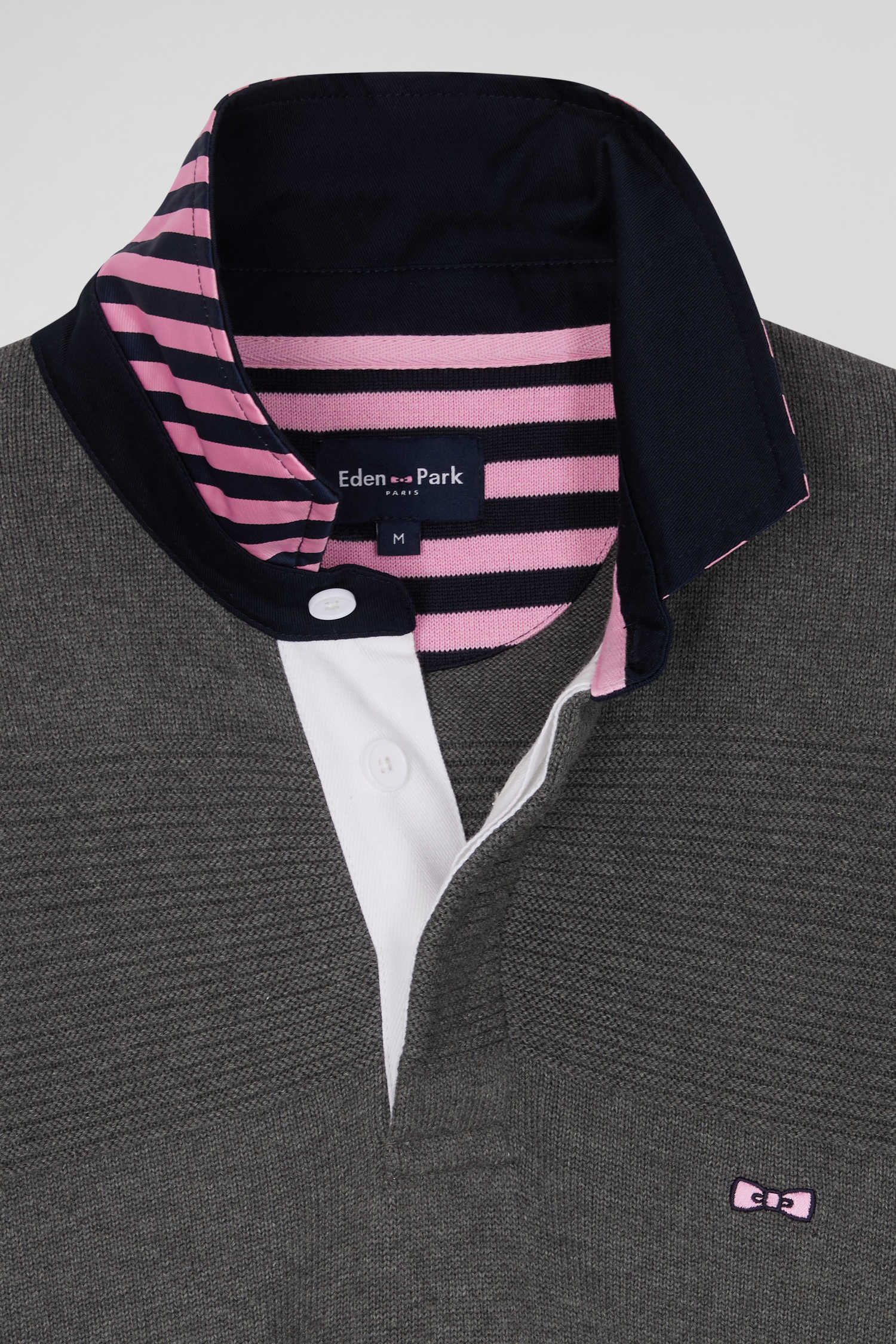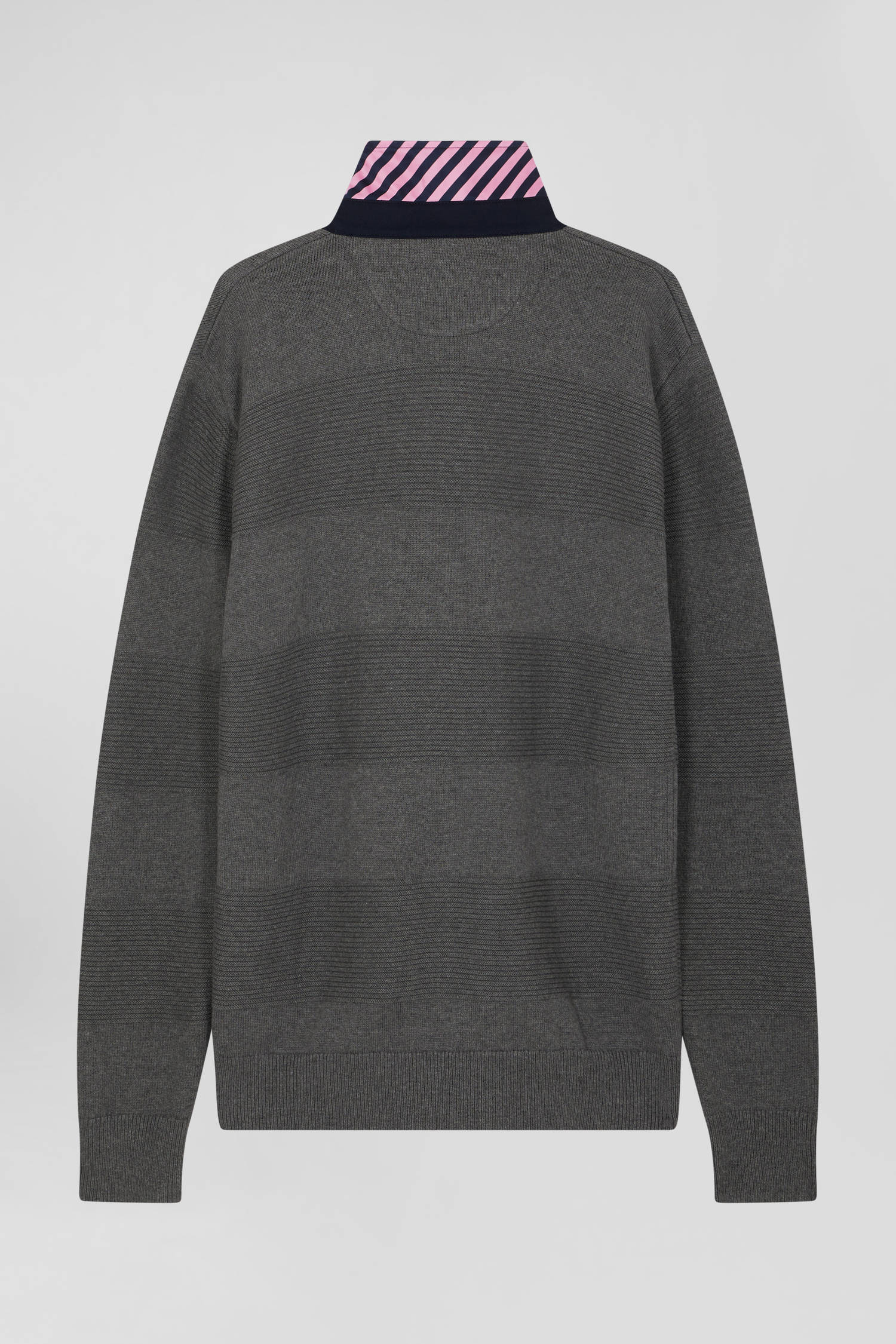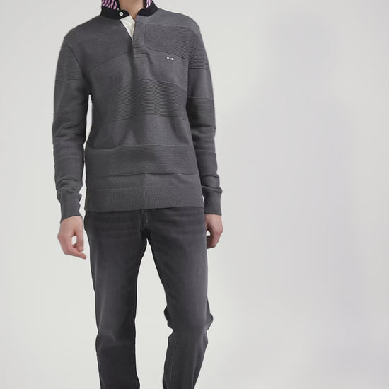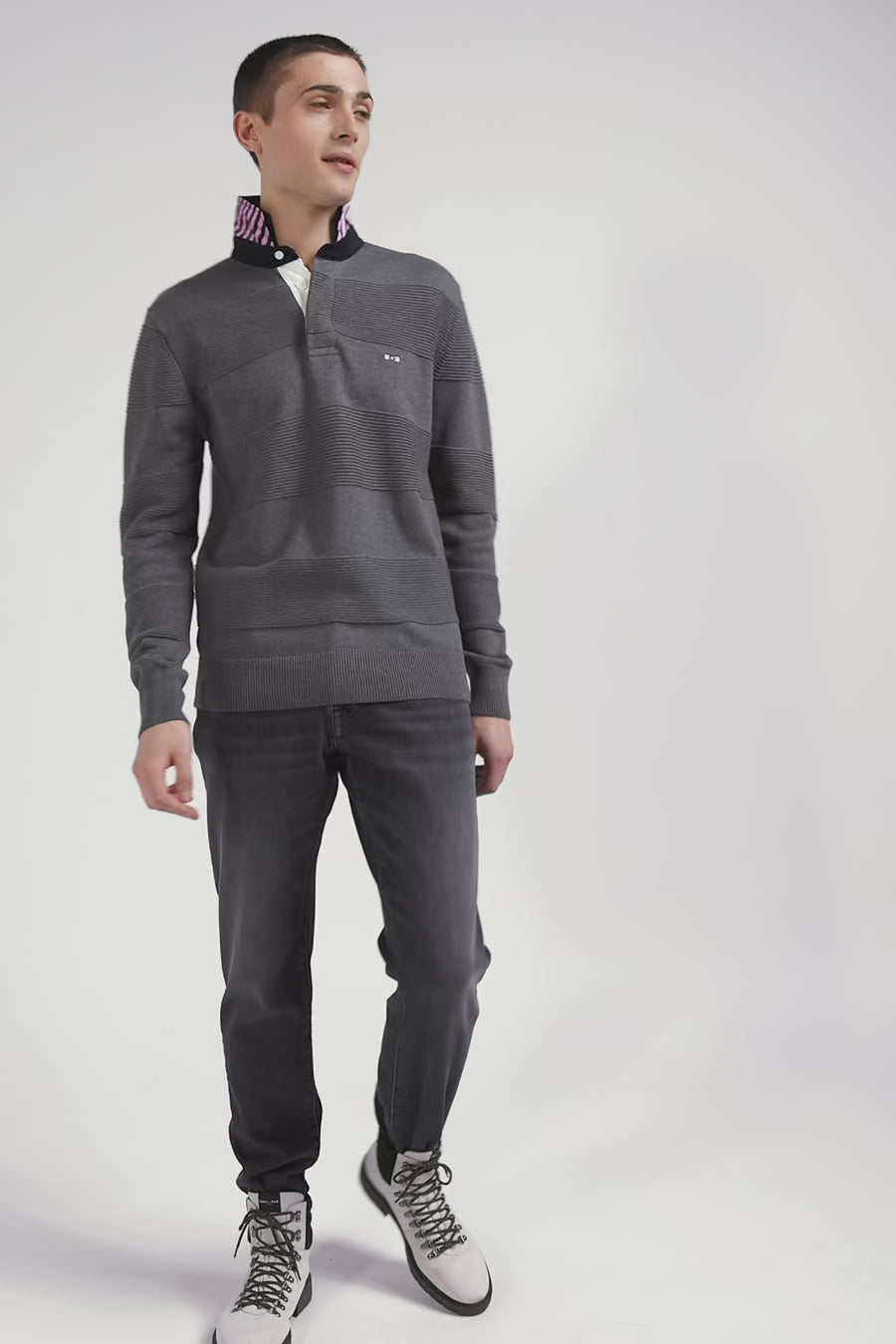 Face cooler days in style with this cotton polo-neck sweater featuring a white button placket. Designed to combine comfort and style, this men's sweater is crafted from quality cotton in a variegated knit for a tone-on-tone play of relief inspired by the hooping on rugby jerseys, a detail also repeated on its collar and inner half-moon.