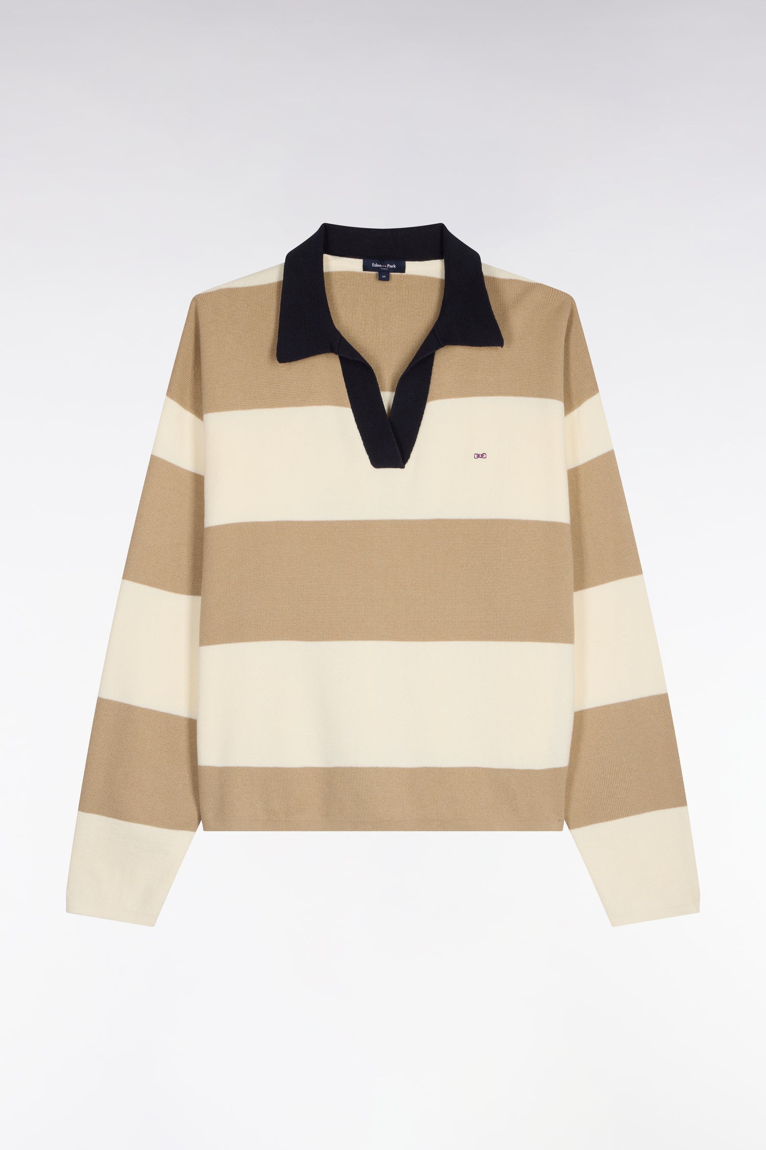 Ce pull à col polo en maille milano marine dense et élégante, revisite le style marin avec ses rayures beige et blanc qui apportent relief et structure. Le col polo et l'encolure contrastée accentuent son raffinement, tandis que le nœud papillon brodé signe la pièce avec subtilité. Idéal pour des looks raffinés, ce pull femme se porte aussi bien avec un pantalon blanc qu’avec un jean brut pour une silhouette moderne et lumineuse.