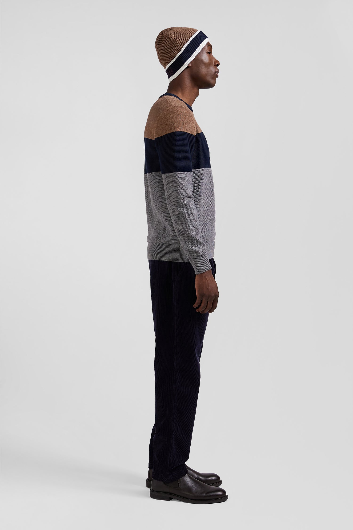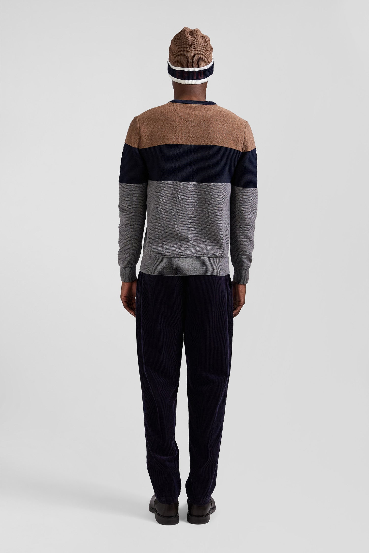 With its contrasting stitch effects obtained through alternating knitting, this men's round-neck sweater adds a graphic touch to the silhouette. The cut and sewn assembly inspired by our swimwear brings a trompe-l'oeil effect to this deceptively classic three-color sweater.