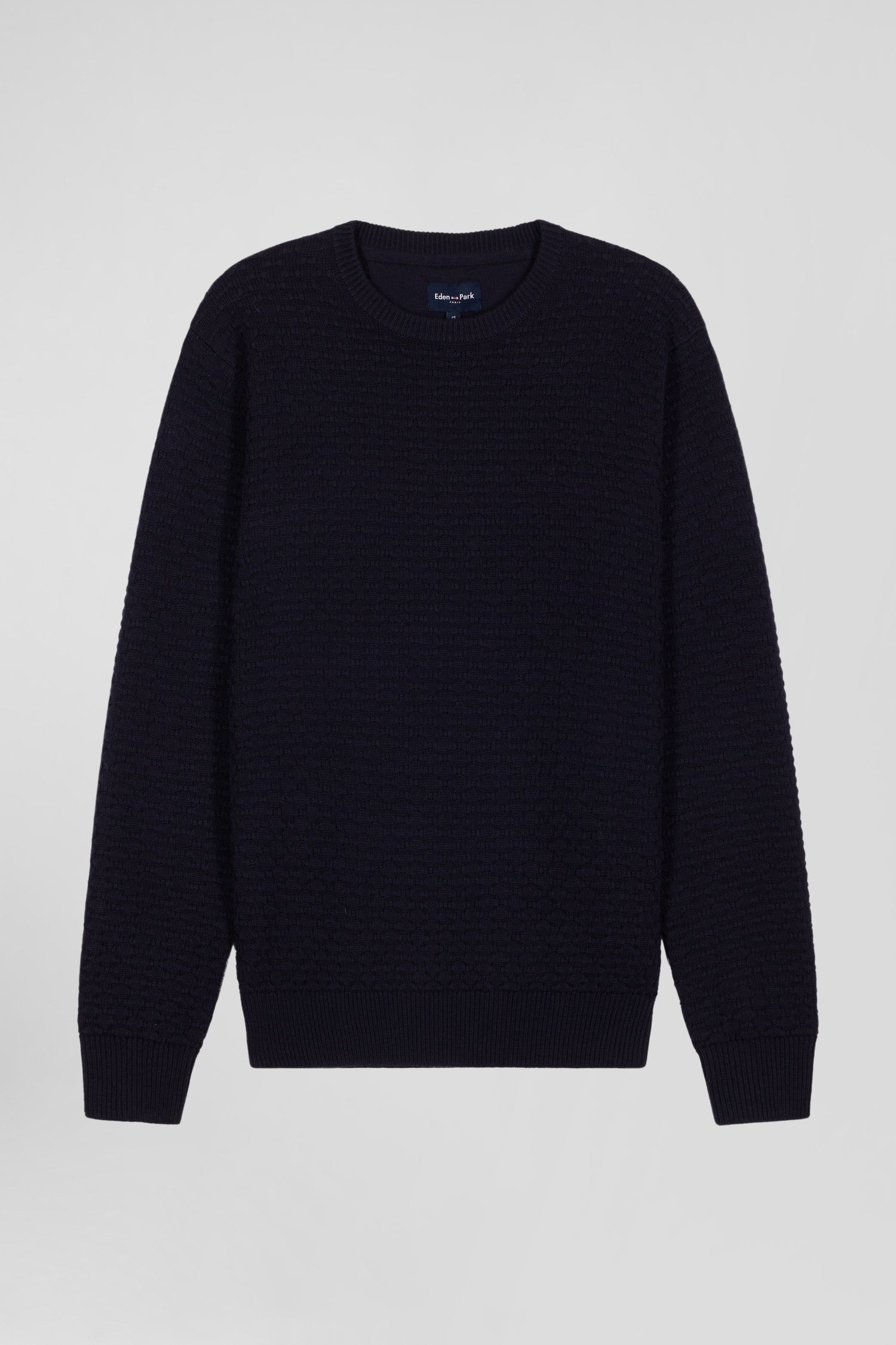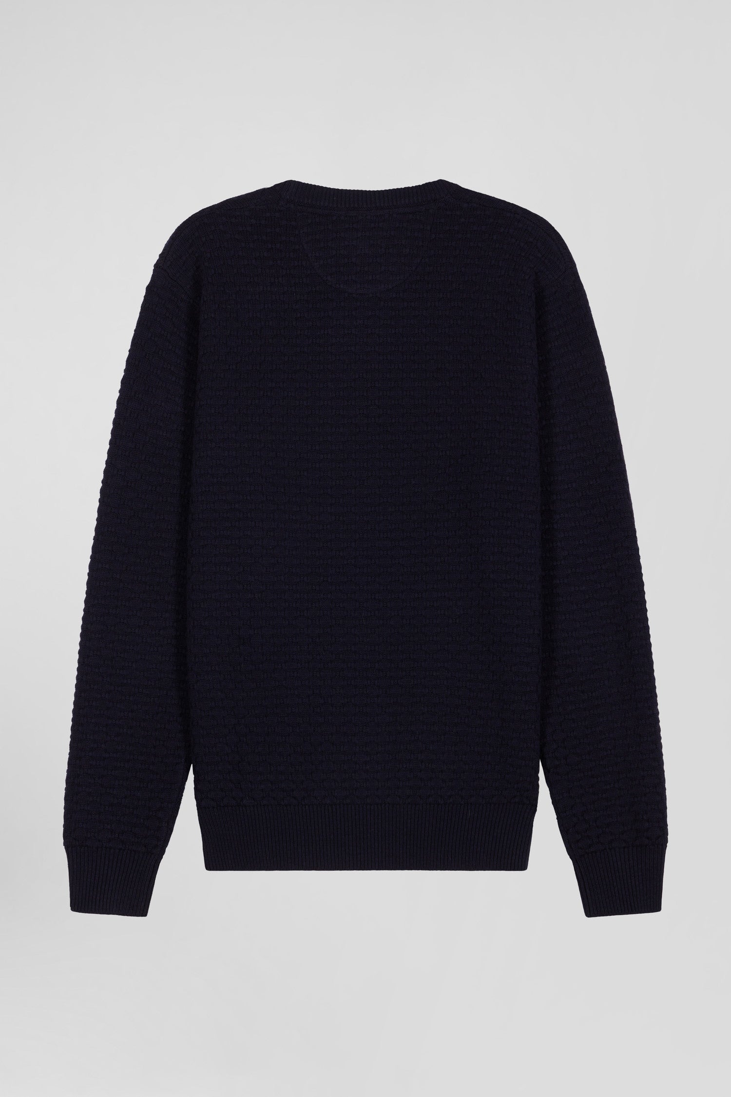 Regular navy blue wool and cotton crew neck jumper with micro bow tie effect