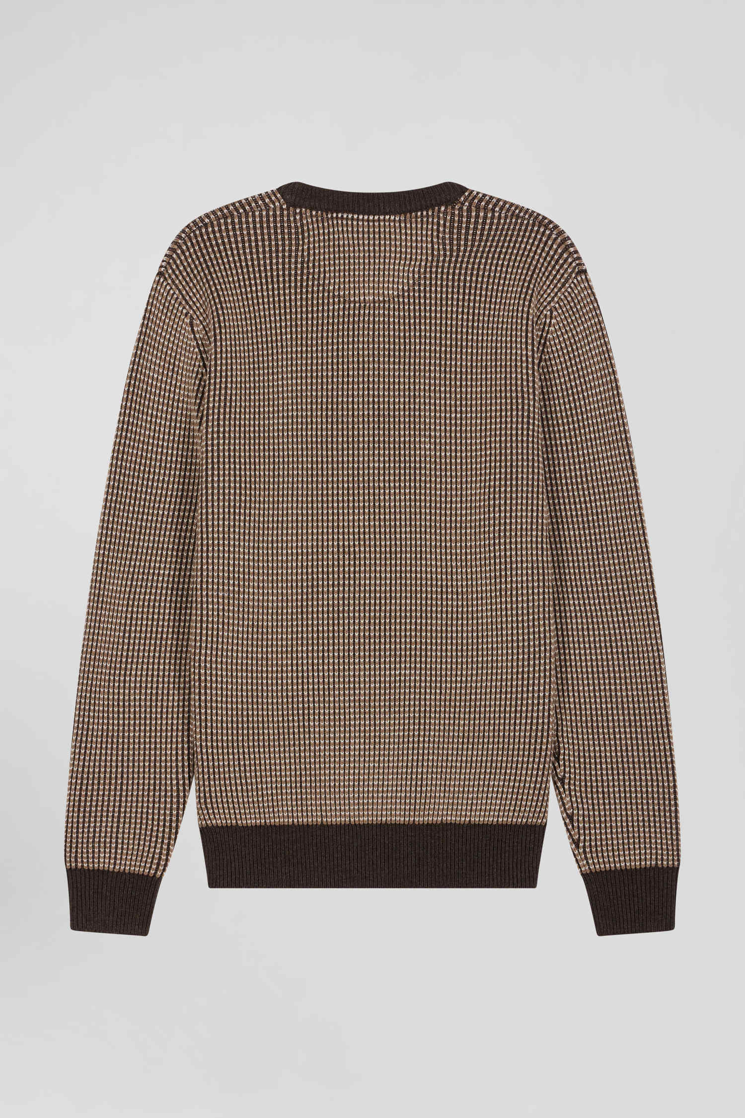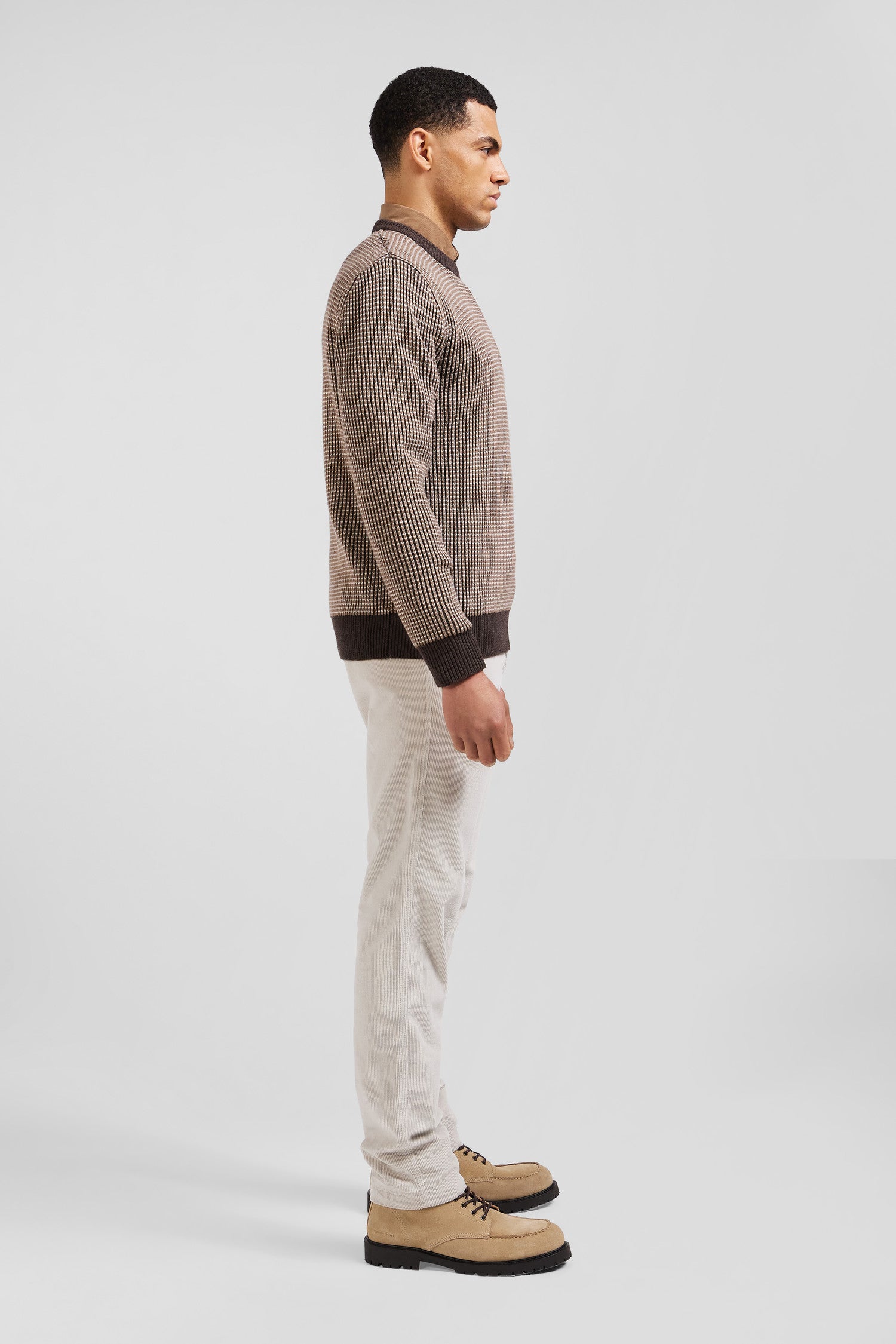 This men's round-neck sweater features contrasting knitwear with a tricolor effect. Its English rib knit gives this winter sweater a touch of originality. Perfect for adding a unique visual dimension to your outfit, this wool and cotton sweater in our timeless colors combines comfort and style with elegance.