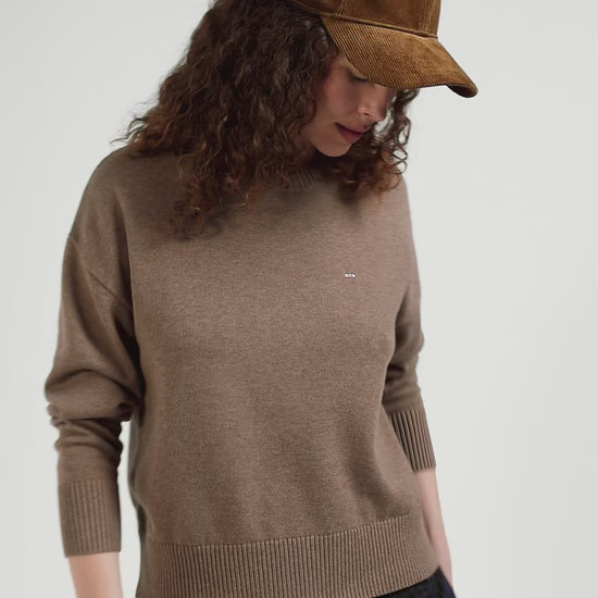 Our elegant round-neck sweater is designed to combine style and comfort. Crafted from a rich blend of wool and cotton, this sweater benefits from the natural properties of these fibers, offering warmth, softness and breathability. The Relaxed cut adds a touch of casual chic, while the discreet bowtie logo embroidery adds a subtle signature to this women's sweater. Available in a range of colors, this timeless piece is a perfect choice for those who value quality and durability in their wardrobe.