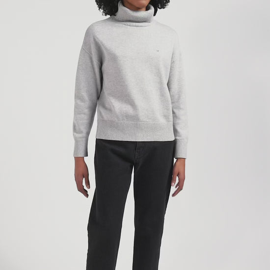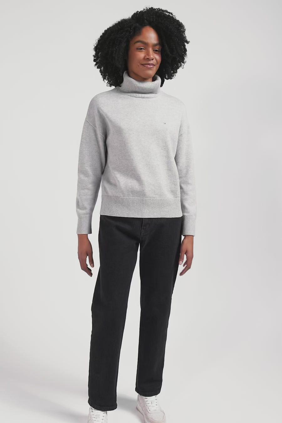 This plain turtleneck sweater, designed in a comfortable blend of natural fibers combining 55% wool and 45% cotton, combines warmth and softness. Featuring ribbed edges for a neat finish and perfect fit, this feminine, slightly loose-fitting sweater is adorned with Eden Park's signature discreet bow-tie embroidery. Available in six timeless colors, this soft turtleneck sweater is ideal for enriching your winter wardrobe with elegance and simplicity.