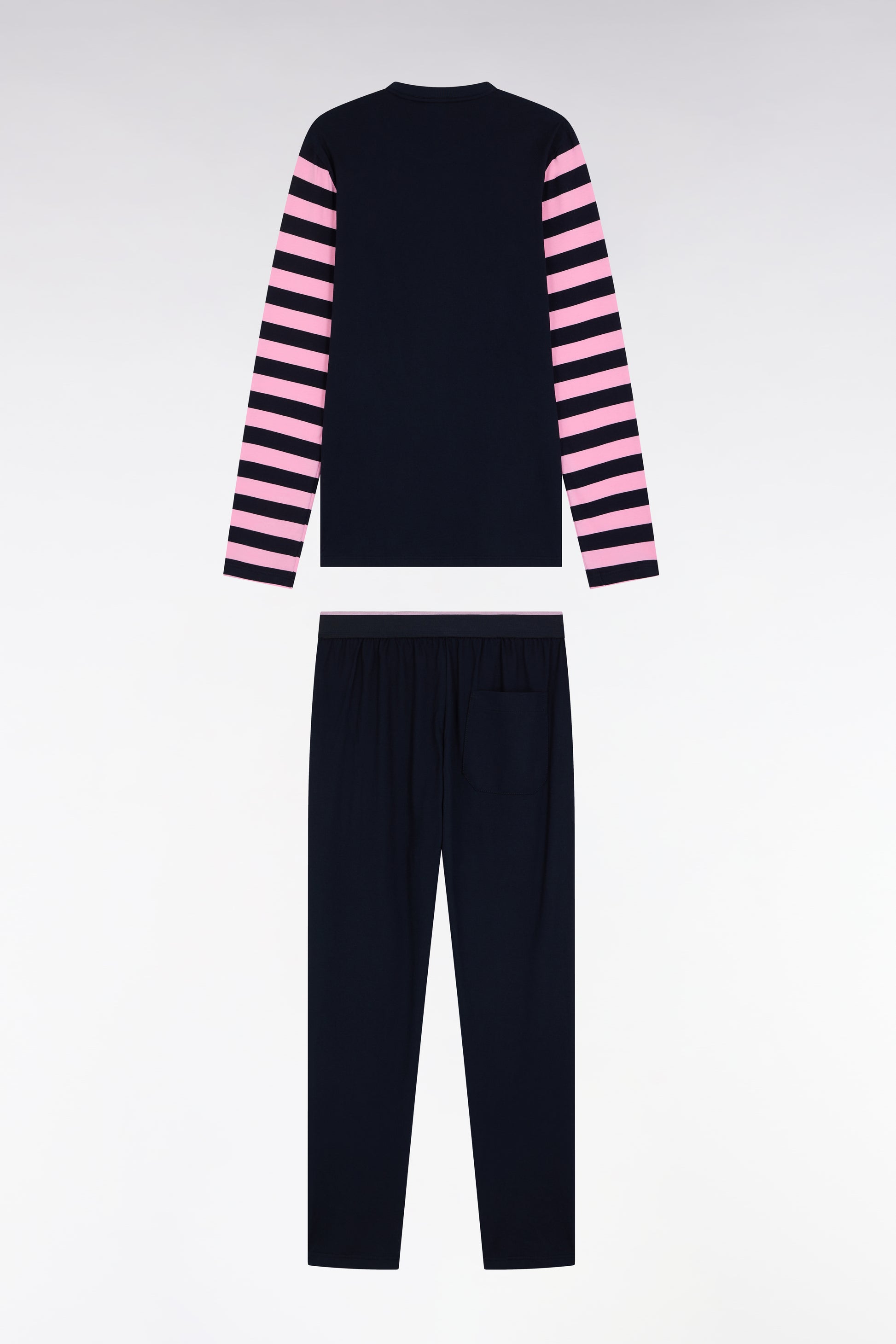 Long pyjamas in navy cotton jersey with striped sleeves - A SHOOTER