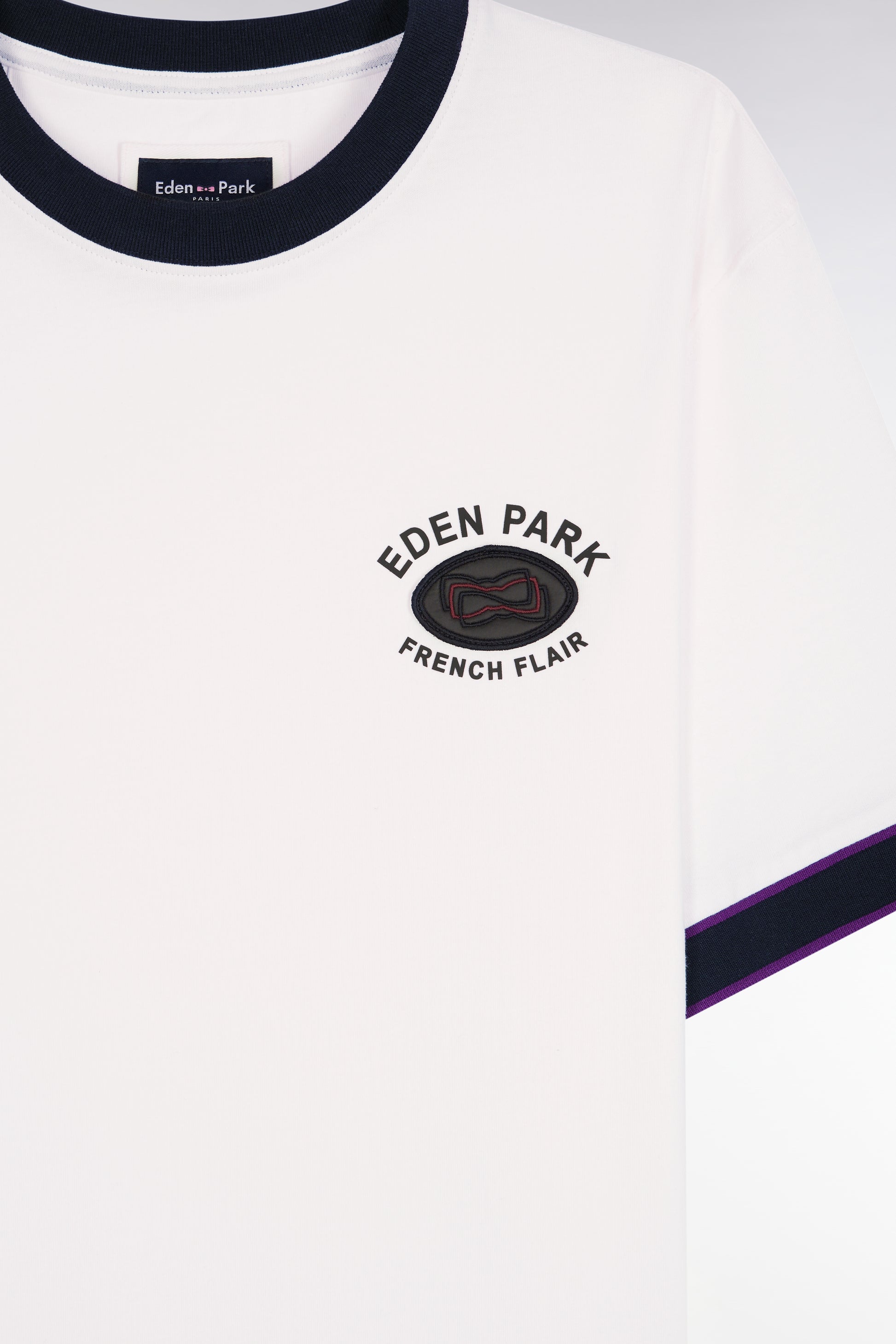 This short-sleeved T-shirt in cotton jersey illustrates Eden Park's sporty style in a sober version with vintage accents. Available in three colors, it offers a supple, comfortable fit for everyday wear and a graphic touch underlined by contrasting ribbing on the collar and on the sleeve edges, which are elegantly raised with a colored stripe. A silicone patch and Eden Park French Flair lettering add to the character of this loose-fitting T-shirt, brilliantly combining style and comfort.