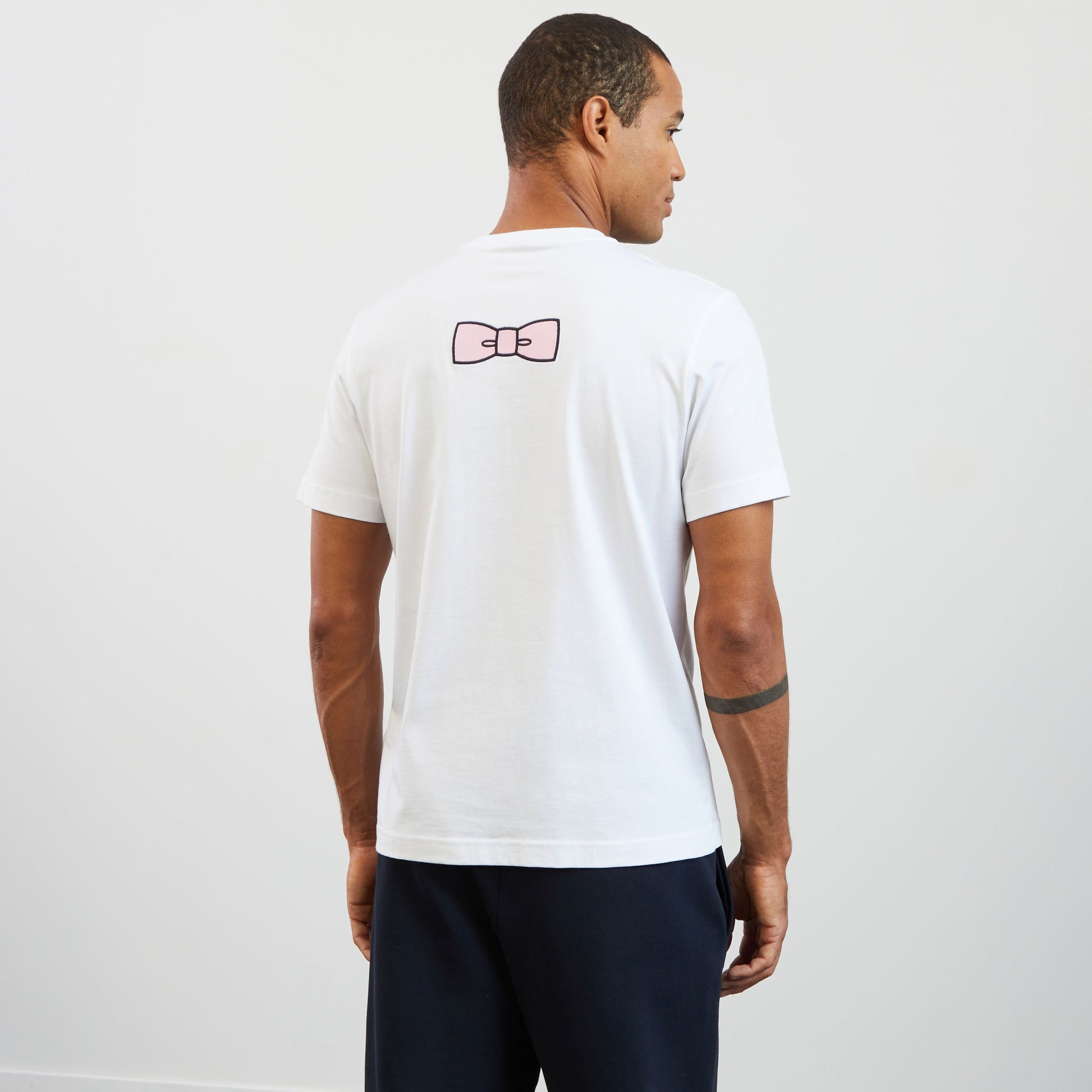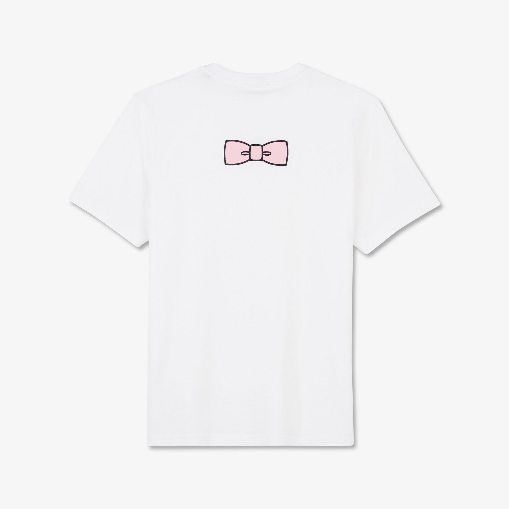 White T-shirt with embroidered bow tie on the back