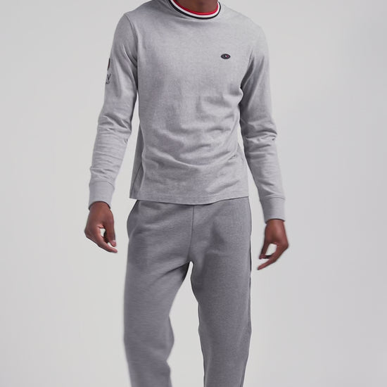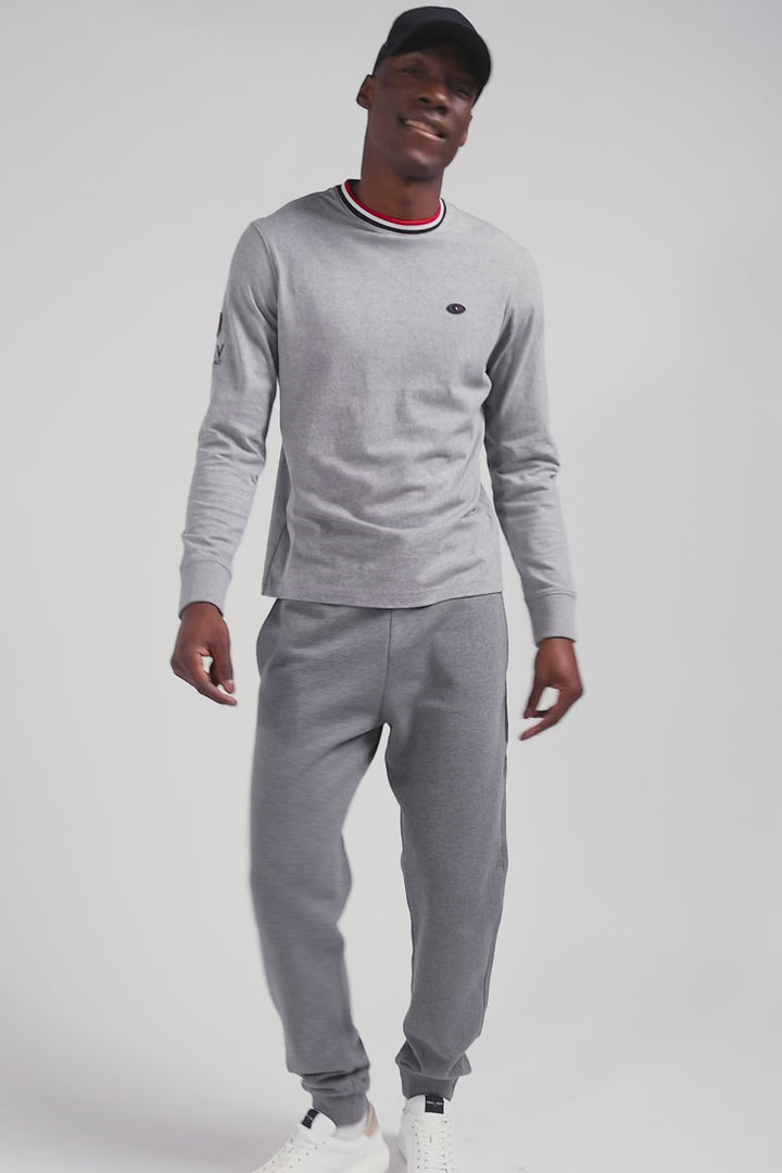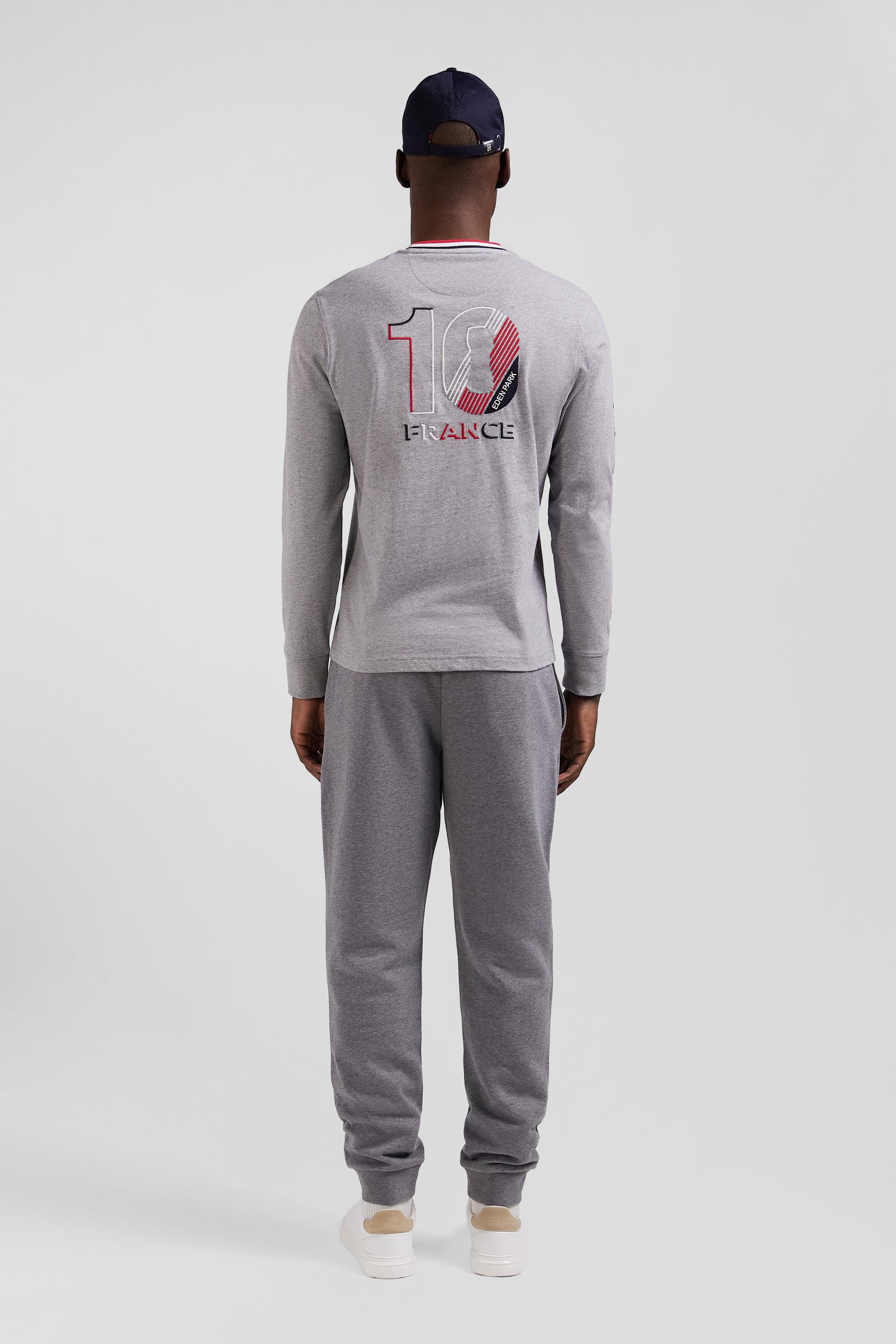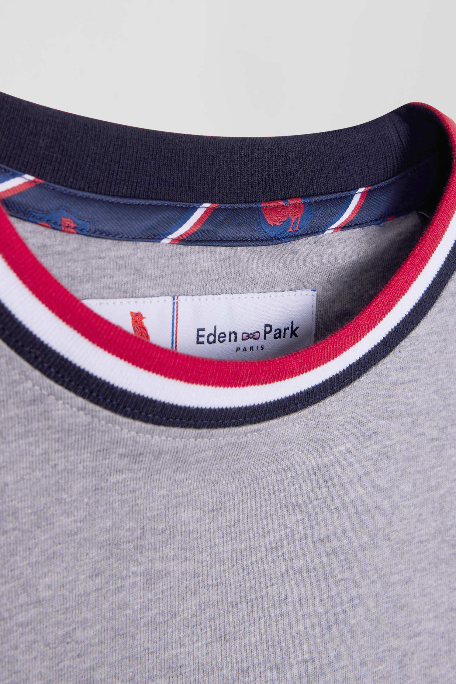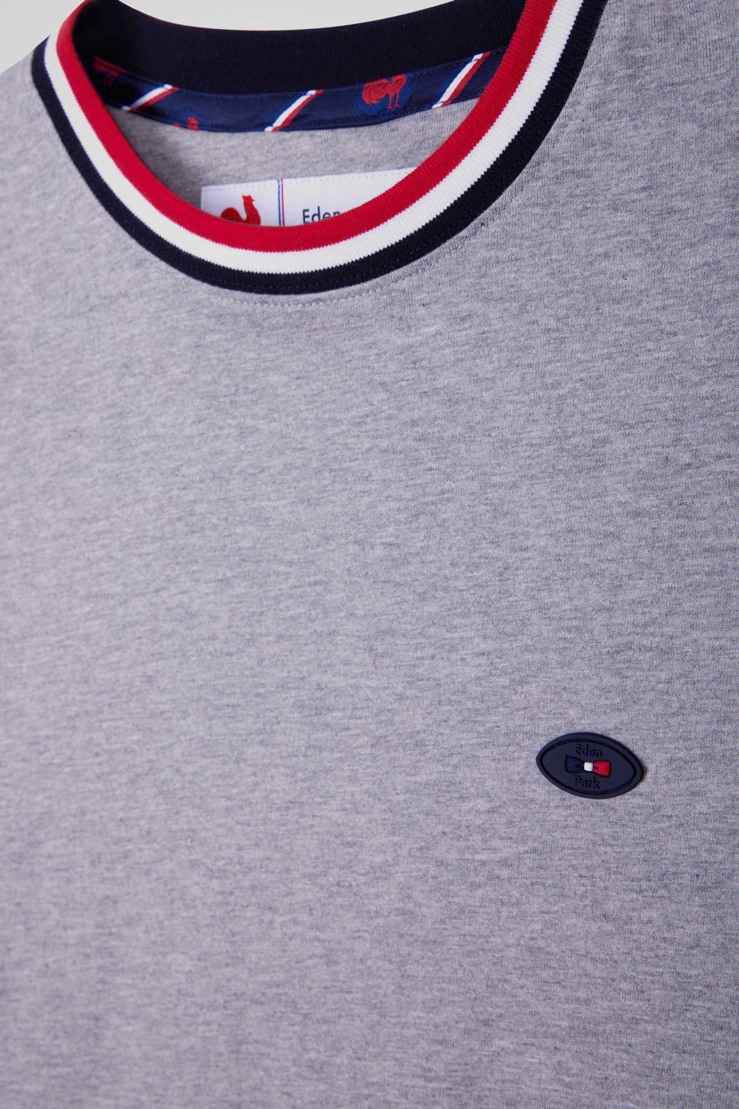 In symbiosis with the XV de France, Eden Park designs garments that reflect the spirit of rugby, combining elegance and functionality for everyday wear. This gray cotton jersey T-shirt features a tri-color ribbed collar, and is proudly embroidered with the French cockerel on the back.