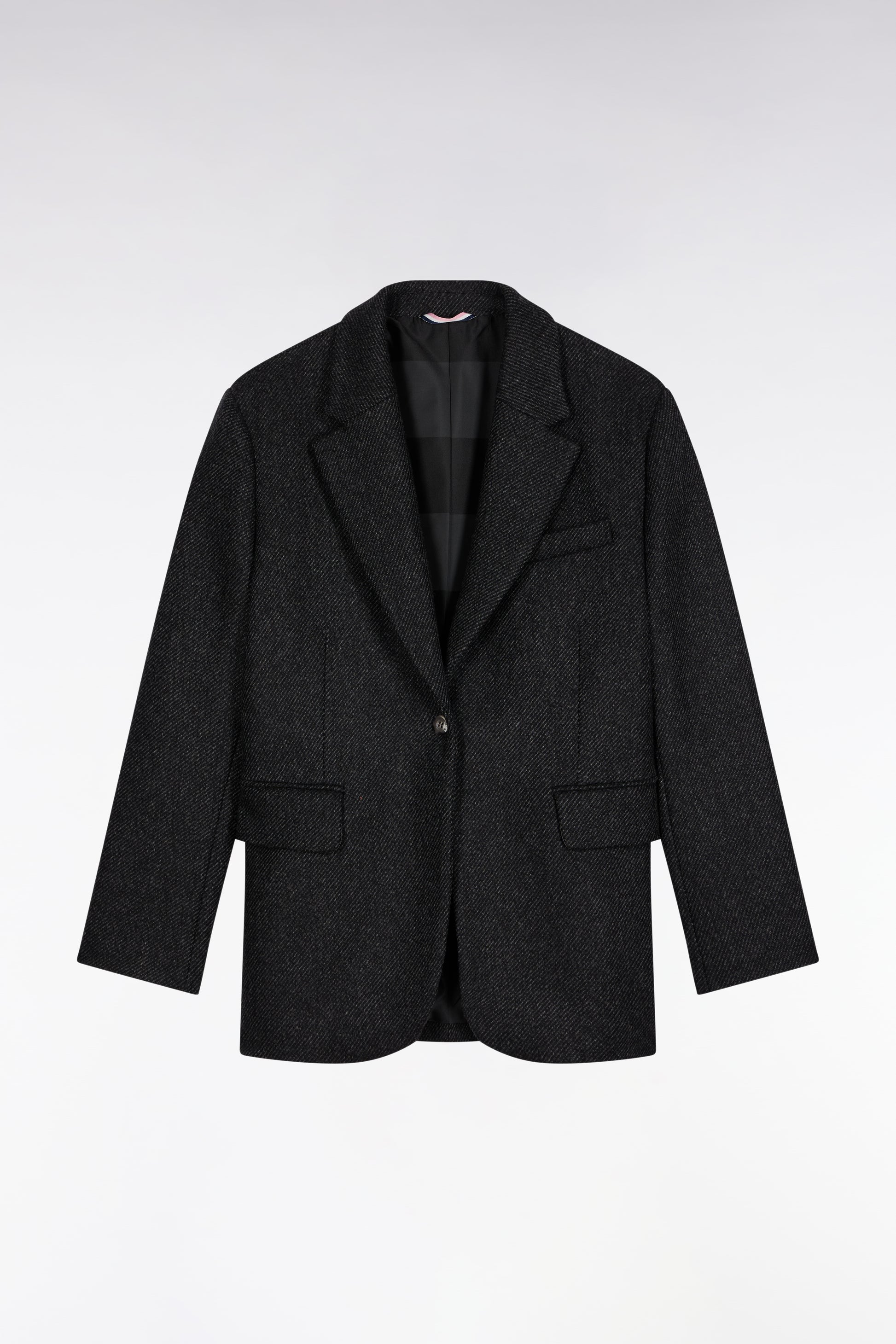 Crafted in dark gray wool twill, this oversized jacket makes a strong style statement. Its modernized straight cut, single exposed button and meticulous finishing touches - notched lapels, flap pockets, buttonholes on the cuffs and lining with wide rugby stripes - make it a must-have for the casual chic wardrobe. Pair with jeans to break the mould, or with dressier pants for an updated tailored look. This jacket's meticulous finishing reflects our commitment to style and quality.