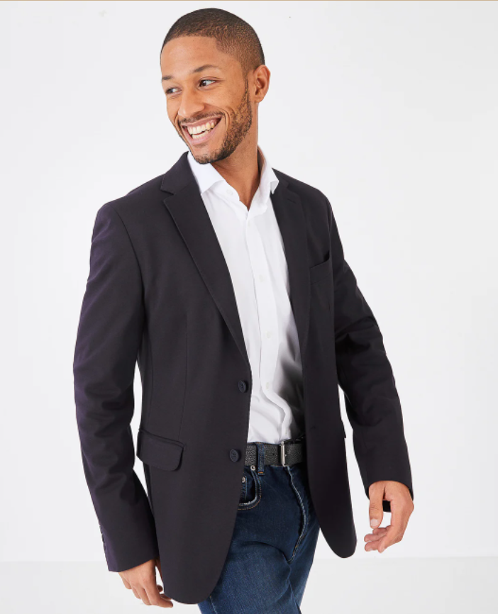 Pour adopter ce style de look, optez pour un jean brut dans une teinte sombre : il accentuera le côté « smart » de votre tenue. Portez-le avec une belle chemise à manches longues unie (blanche ou grise par exemple). Pour apporter une touche finale à votre tenue, n’hésitez pas à porter un blazer noir. Le principe du look casual chic pour aller travailler est de se rapprocher le plus possible d'un style « habillé », mais sans avoir directement recours à des pièces « premium » (comme des mocassins en cuir ou un pantalon de costume).