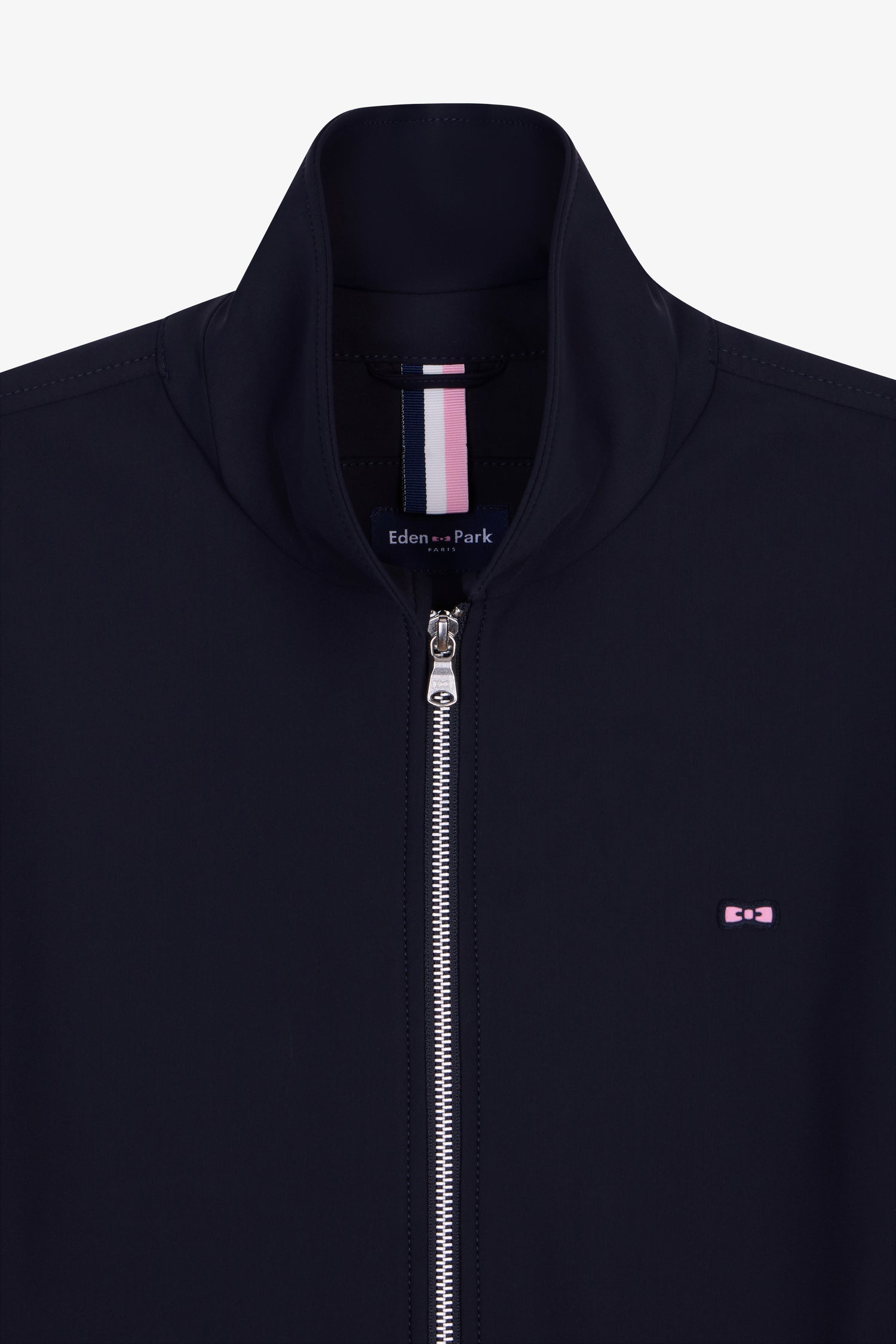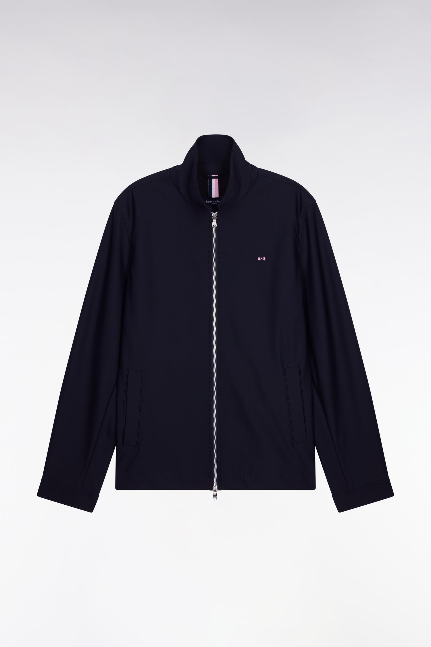 Ce blouson zippé en nylon technique double face bleu marine associe modernité et légèreté. Non doublé, il séduit par sa ligne épurée, rehaussée de finitions métalliques argentées et de détails siglés emblématiques de notre Maison française. Un essentiel de mi-saison, à la fois fonctionnel et élégant.