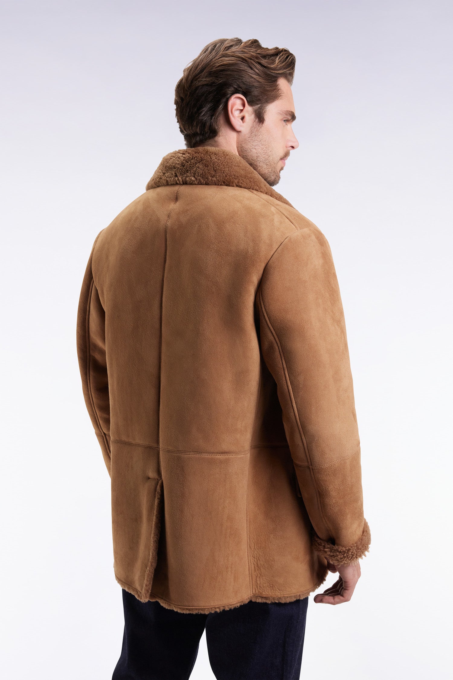 Pièce d’exception façonnée dans une véritable peau lainée marron, ce caban en shearling incarne l’élégance brute de nos collections de mode masculines. Non doublé pour préserver la souplesse et le caractère de la matière, ce manteau séduit par sa chaleur naturelle, ses finitions bords francs et son tombé structuré. Le double boutonnage, les poches passepoilées et le patch en cuir embossé sur la manche révèlent tout le savoir-faire et sens du détail Eden Park. Un investissement intemporel, conçu pour se patiner avec allure au fil des années