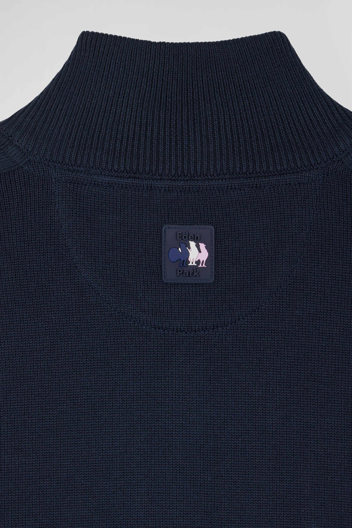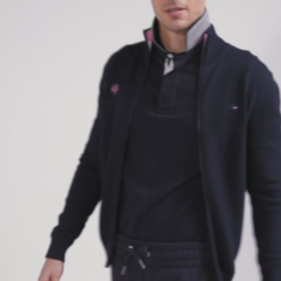 Ce cardigan zippé bleu marine en coton doux épouse une coupe Regular droite, idéale pour une silhouette contemporaine et confortable. Ses jeux de tricotage à effet reliéfé sont rehaussées par un petit col montant et un intérieur de col tricolore qui ajoutent une touche distinctive. Le badge gomme aux détails XV de France tricolores et au nom de notre Maison sur la poitrine signent l'élégance sportive de ce sweatshirt en maille zippé. Ce modèle est agrémenté d'un zip ton sur ton pour plus de raffinement.