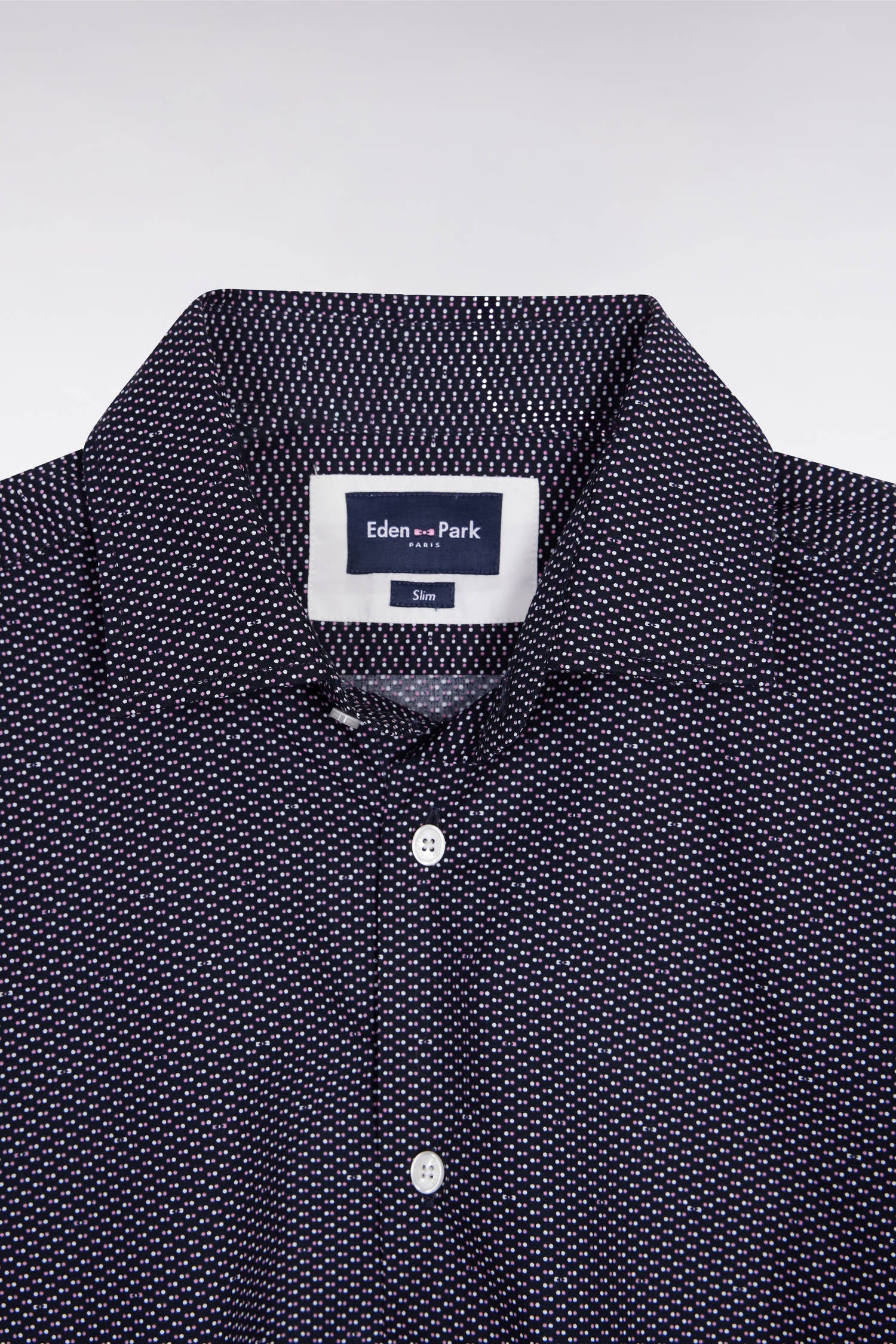 Avec son imprimé micro-pois discret rose ou bleu sur un fond marine, cette chemise à la coupe slim seyante affiche une allure moderne tout en respectant les codes de l’élégance Eden Park. Réalisée dans une popeline de coton douce et respirante, elle se distingue par l’absence de poche poitrine et par la broderie nœud papillon en bas de pièce, clin d’œil minimaliste à l’univers French Flair de la maison