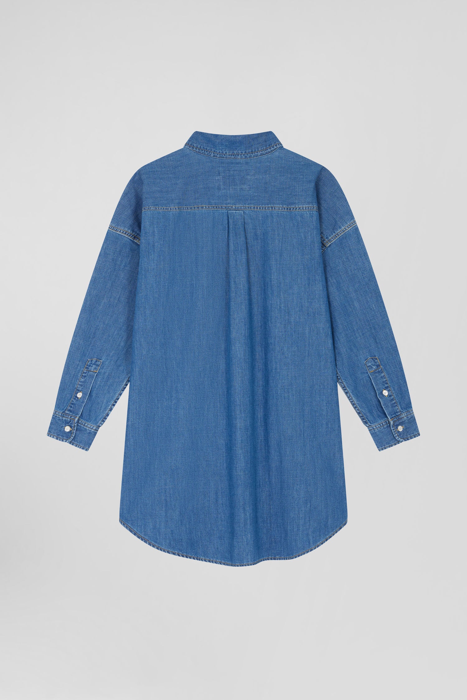 Réalisée avec soin dans une coupe Oversized, cette chemise femme unie est confectionnée dans un coton bleu. Sa poche plaquée sur la poitrine dotée d'une étiquette siglée, sa patte de boutonnage classique et son col structurent parfaitement cette chemise tendance à porter seule ou en surchemise, ouvert sur un T-shirt en coton.