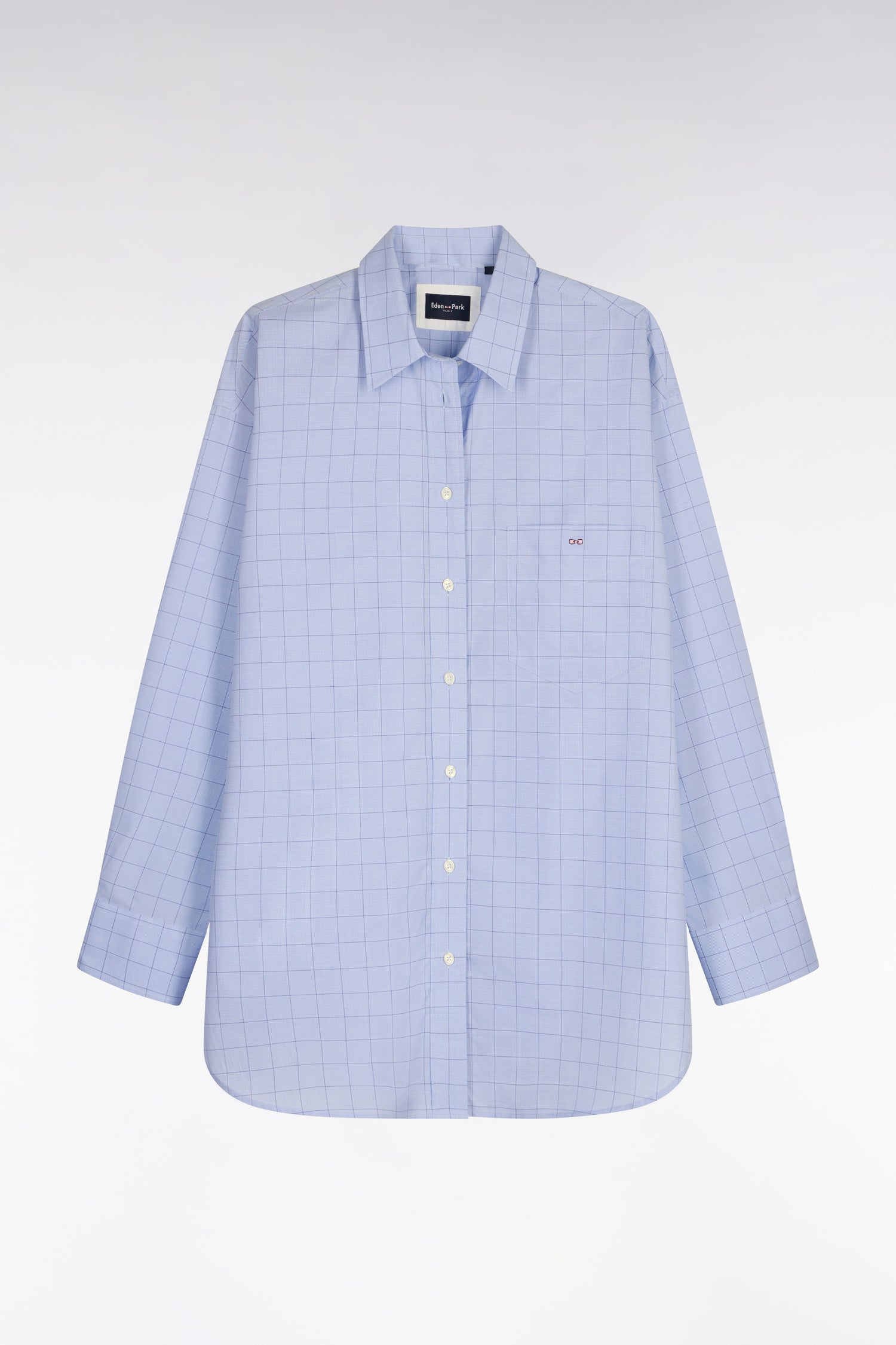 La douceur de la popeline de coton s'associe à une coupe oversized moderne pour cette chemise femme bleu ciel. Pour une touche graphique réinterprétant les pièces phares d'un vestiaire elle se dote de carreaux prince de Galles et d'une poche plaquée. Jean ou pantalon d'inspiration tailleur se marieront à la perfection à cette élégante chemise.