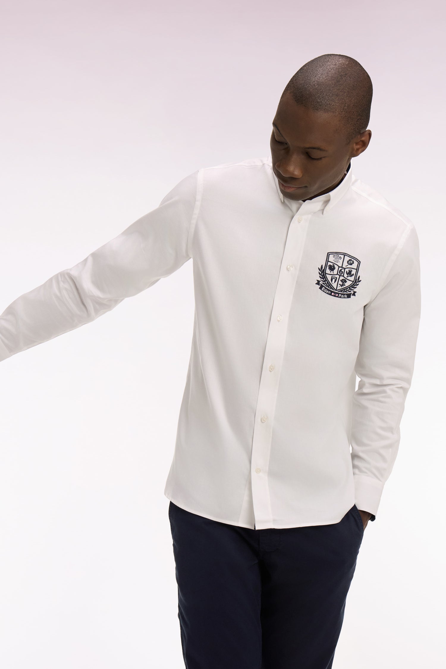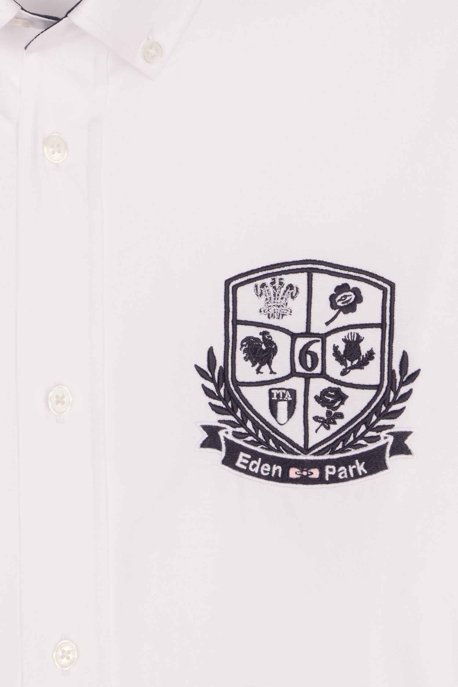 Cette chemise en coton pinpoint célèbre le mythique Tournoi des Six Nations avec élégance. Sa coupe droite à bas arrondi et son col à pointes boutonnées offrent une silhouette nette, tandis que sa broderie blason sur la poitrine, inspiré de l’ovalie, affirme une signature forte. Les finitions raffinées : passepoil intérieur rose, intérieur de col marine, ruban chevron sur la patte de poignet, empiècement dos, reflètent l’attention que notre Maison porte aux détails. Une chemise à la signature Eden Park reconnaissable entre toute, entre tradition et modernité.