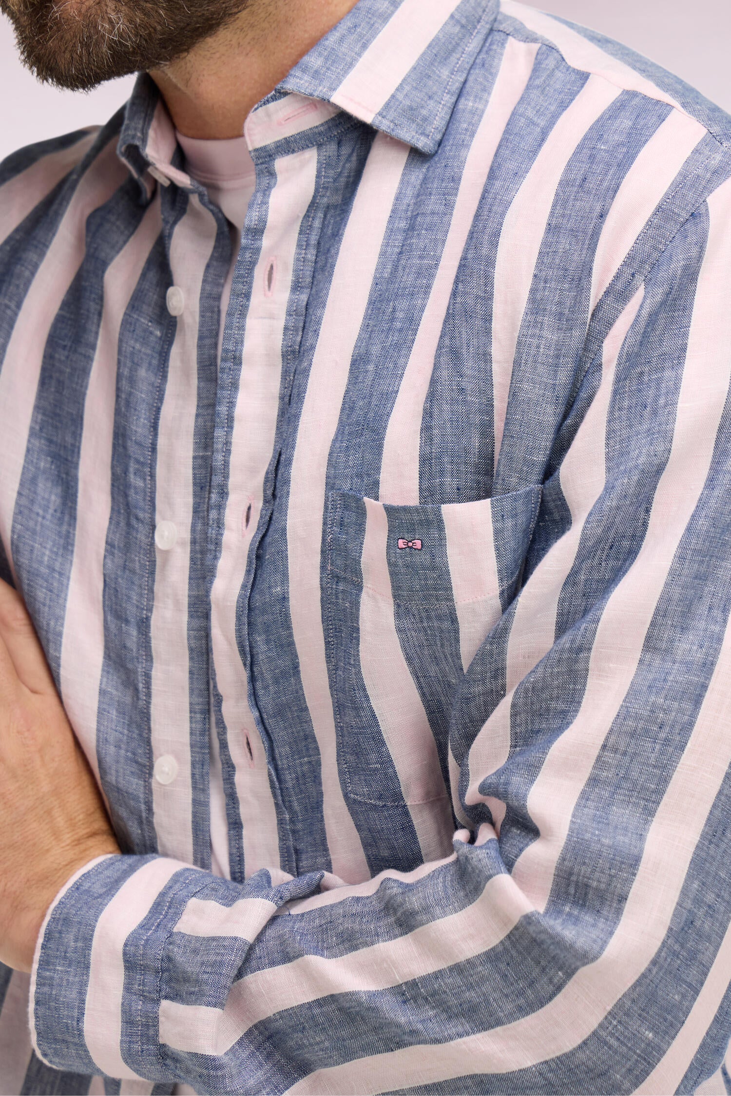 Cette chemise en lin pur décline les rayures bâton dans une version estivale bicolore. Légère, respirante et naturellement texturée, elle offre un confort idéal pour accompagner les journées chaudes. Sa coupe droite et son col à pointes libres structurent la silhouette tout en préservant votre confort. Les deux plis au dos apportent une aisance supplémentaire, tandis que la poche poitrine ornée de l’emblématique nœud papillon rappelle subtilement l’identité de notre Maison française. Ses finitions soignées traduisent l’exigence de notre Maison et ses ateliers. Un essentiel du vestiaire sport chic masculin à associer à un chino clair ou un jean brut en toutes circonstances.