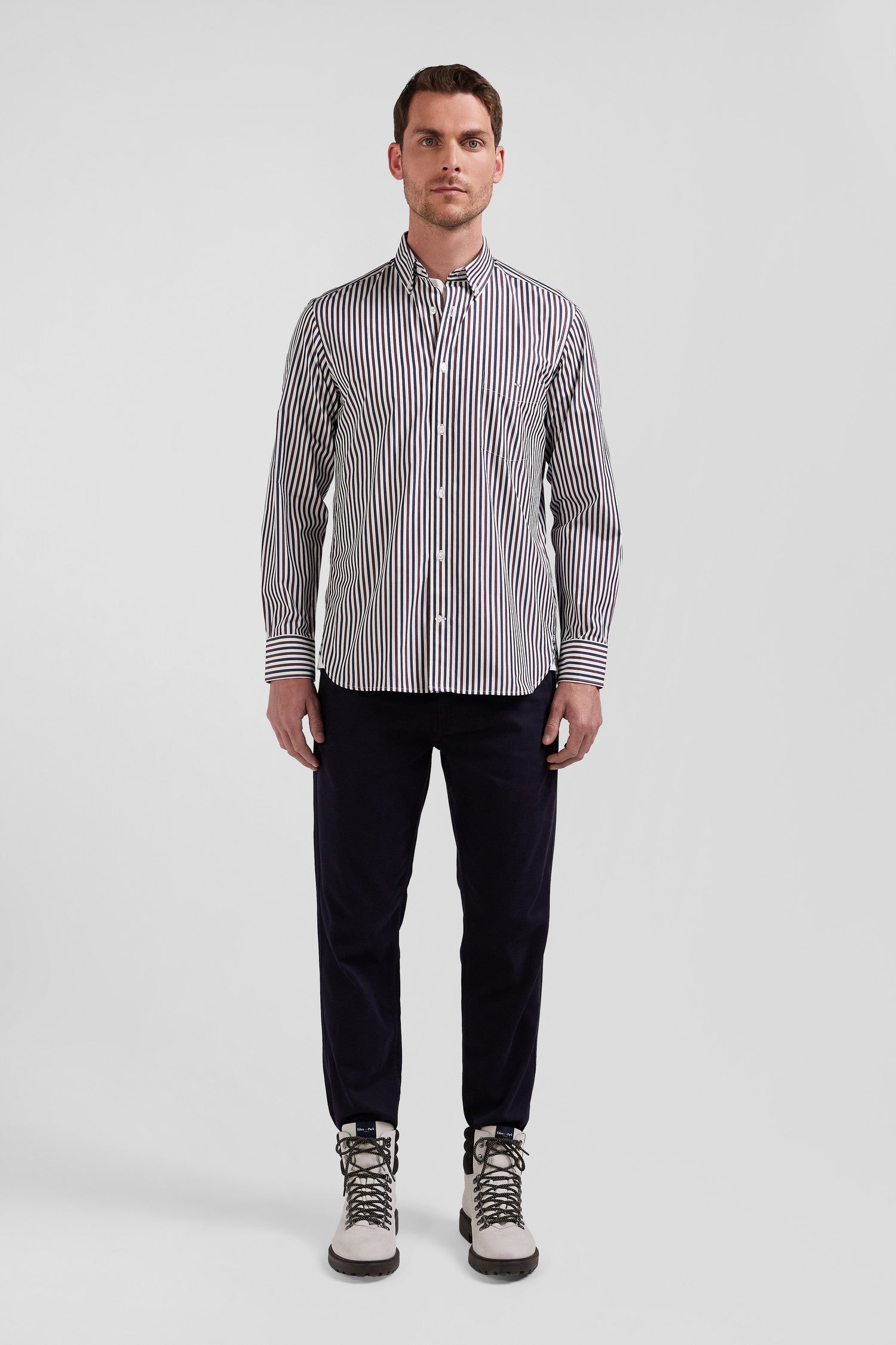 Notre chemise en popeline de coton rayée est conçue pour s'adapter à toutes les silhouettes grâce à sa coupe Regular droite. Ses rayures bâtons bicolores ajouteront une touche de dynamisme à votre tenue. Le col à pointes boutonnées assure un maintien impeccable, tandis que son pli au dos vous permet de bénéficier d'une aisance supplémentaire. Sa broderie nœud papillon sur la poche poitrine signe cette chemise homme d'une touche d'élégance subtile. Ce classique revisité avec modernité est décliné pour la saison dans une large palette de couleurs et s'associe aussi bien à nos pantalons coupe chino qu'à un jean droit.