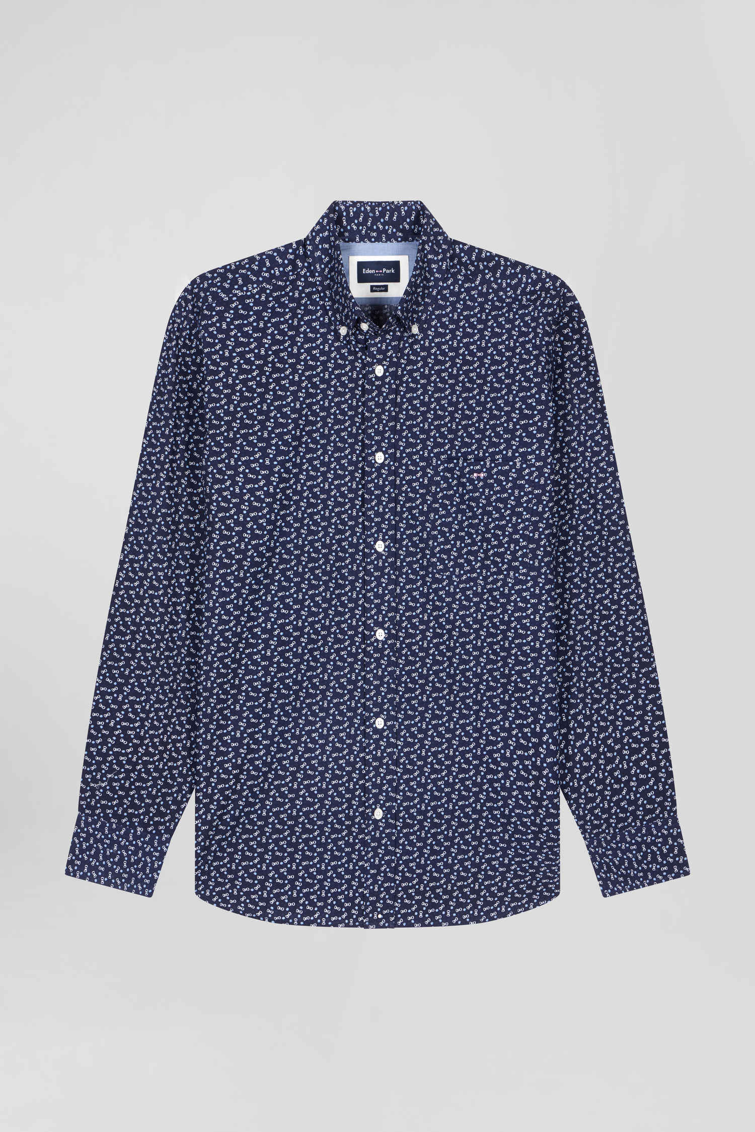 Pour une silhouette travaillée, nous vous proposons cette chemise en popeline de coton écrue ou marine, ornée d'un microimprimé nœud papillon intégrant subtilement l'emblème de notre Maison. Sa coupe Regular droite assure un ajustement confortable, tandis que la poche poitrine et le col boutonné ajoutent une touche de sophistication raffinée à cette chemise imprimée.