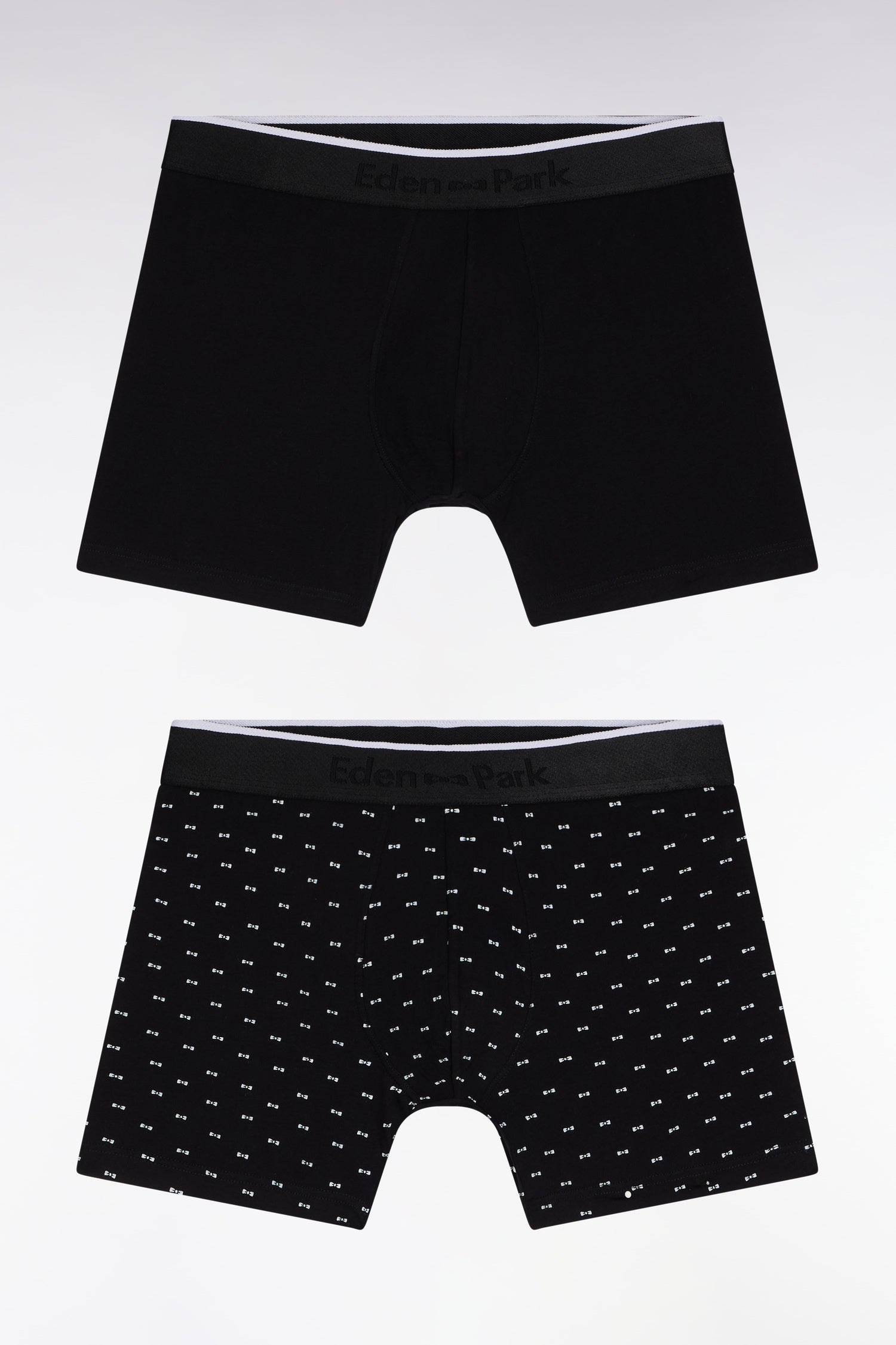 Ce lot de deux boxers en coton jersey stretch combine un modèle uni intemporel et un modèle graphique habillé d'un micro-motif nœud papillon en all-over. Confortables et ajustés, ces boxers se distinguent par leur taille élastiquée siglée Eden Park, fidèle à l’esprit sport-chic de notre maison de mode française