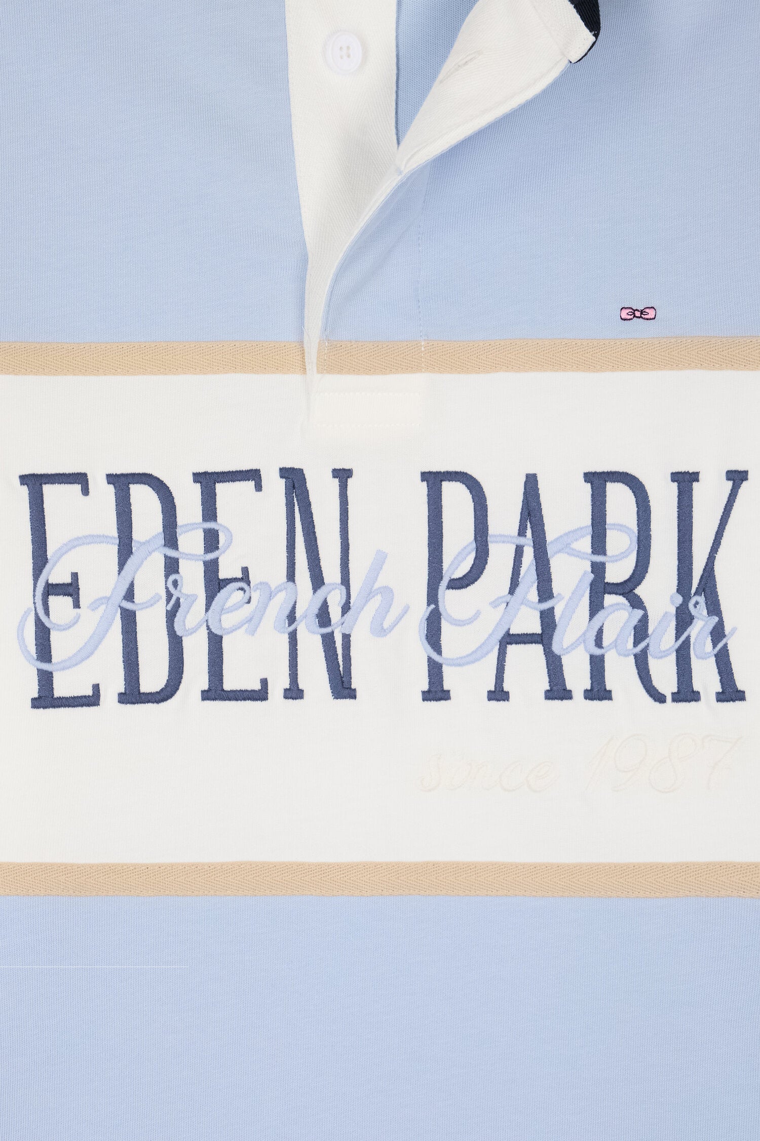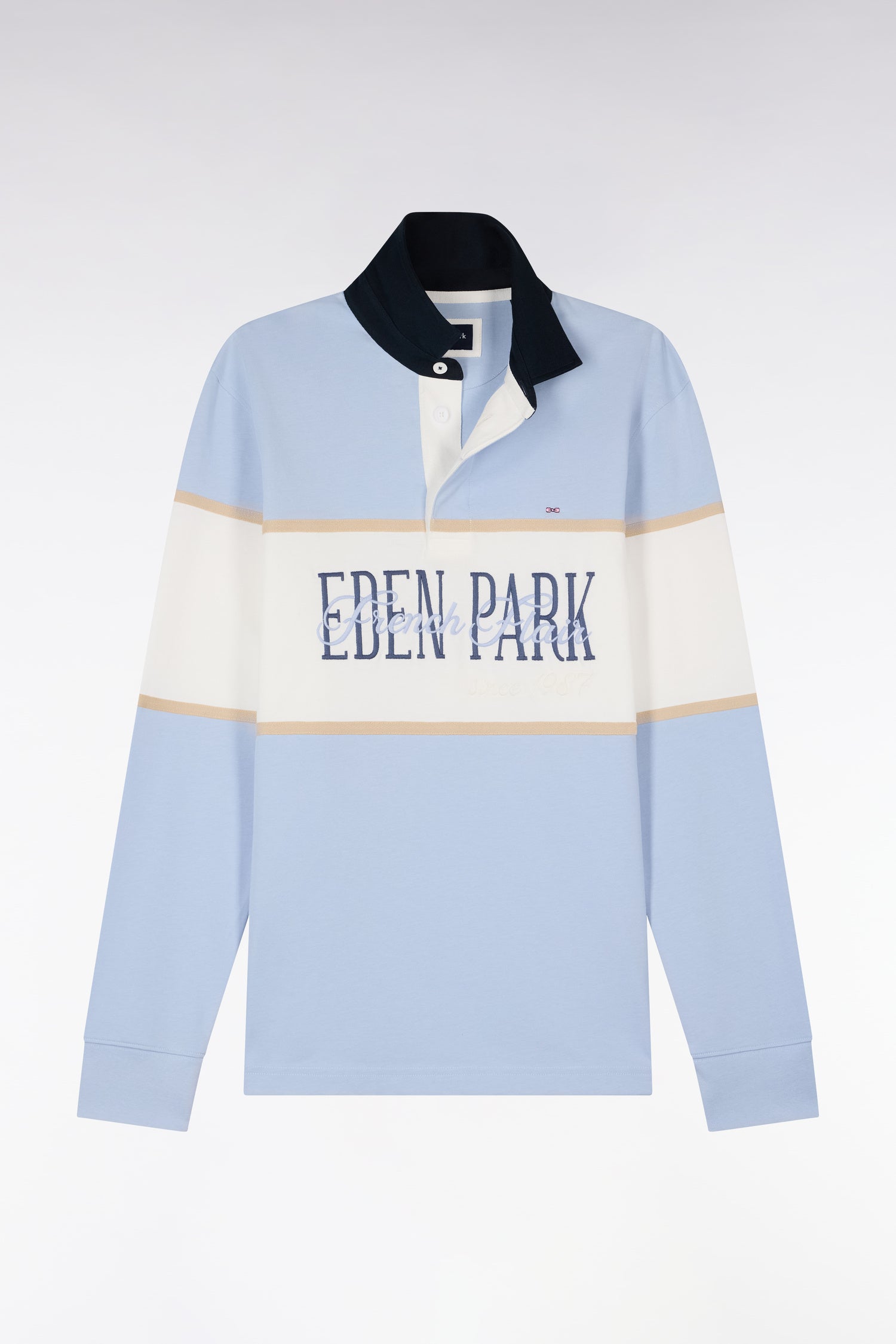 Ce maillot à manches longues en coton écru ou ciel s’impose par son allure sport chic inspirée de l’esprit Ivy League. Sa large bande contrasté, rose ou écru selon le modèle choisi, et son col marine apportent un contraste élégant et graphique, tandis qu’une broderie sérigraphiée Eden Park French Flair au style vintage souligne son caractère affirmé. Confectionné avec soin dans une étoffe douce, respirante et résistante, ce modèle revisite le maillot de rugby classique avec une touche mode et contemporaine.