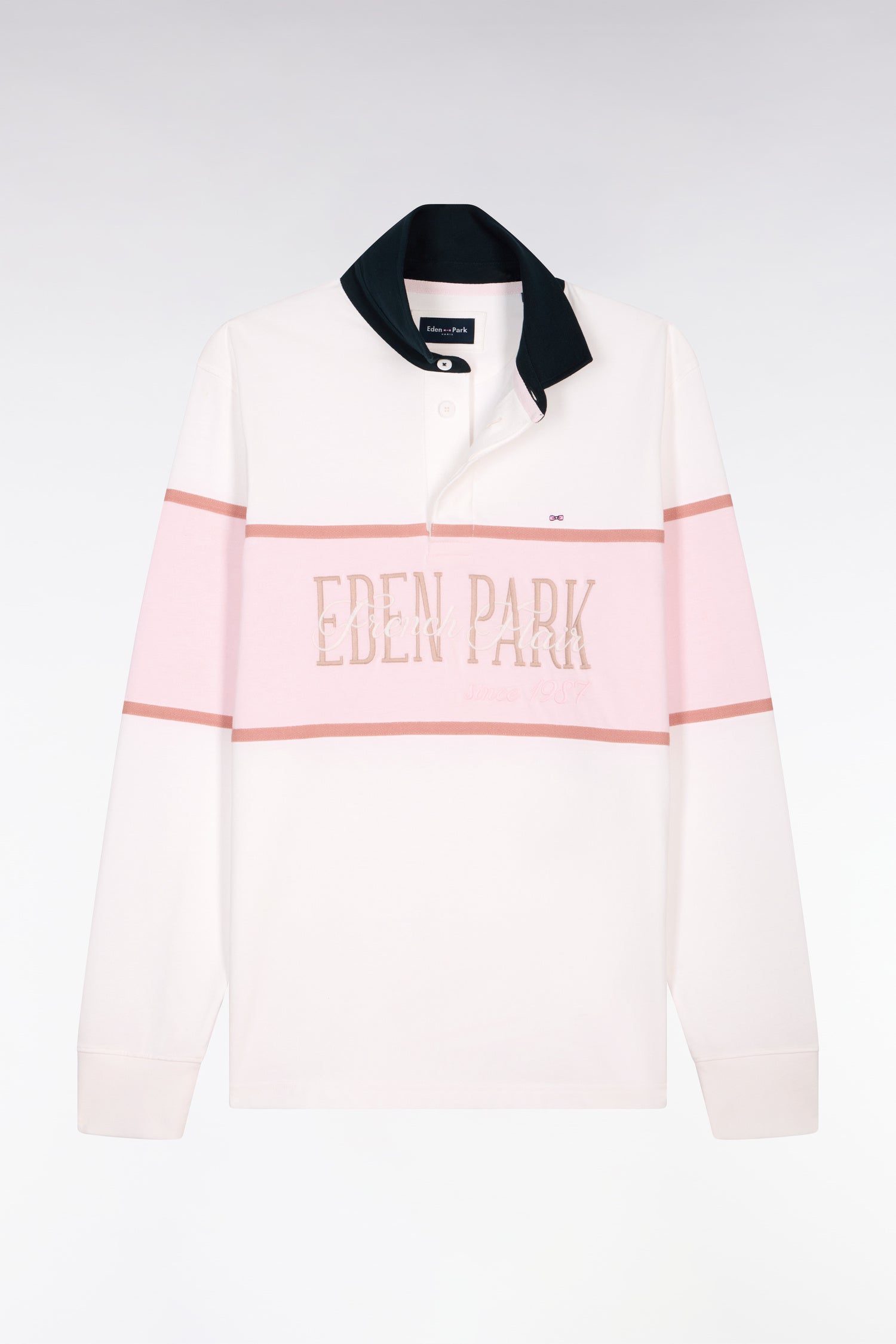 Ce maillot à manches longues en coton écru ou ciel s’impose par son allure sport chic inspirée de l’esprit Ivy League. Sa large bande contrasté, rose ou écru selon le modèle choisi, et son col marine apportent un contraste élégant et graphique, tandis qu’une broderie sérigraphiée Eden Park French Flair au style vintage souligne son caractère affirmé. Confectionné avec soin dans une étoffe douce, respirante et résistante, ce modèle revisite le maillot de rugby classique avec une touche mode et contemporaine.
